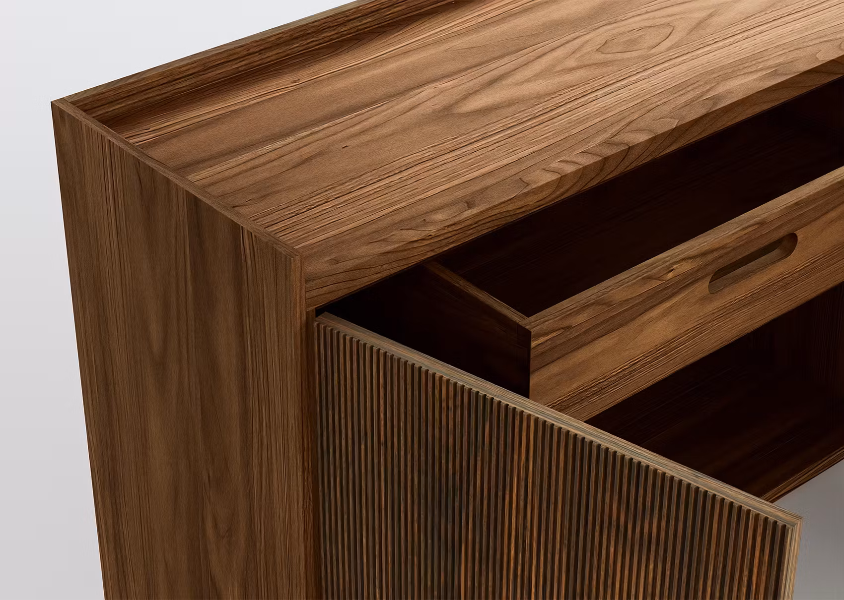 Chest of drawers in blockboard and wood, featuring a frame in which the top is recessed, with drawers assembled with traditional dovetail joints and grooved handle. The vertical processing of the fronts, Fresart, creates a modern and dynamic geometric effect.