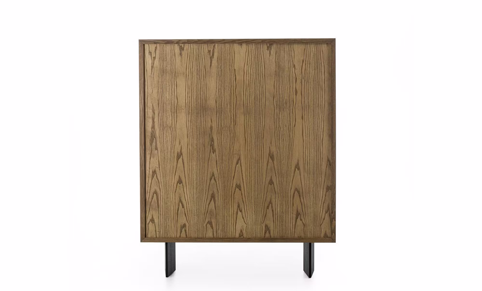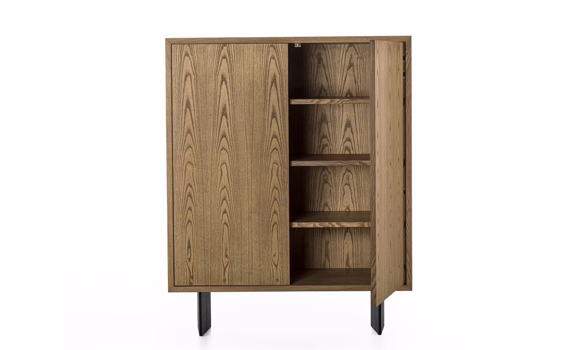 Highboard in solid wood and veneered plywood, enclosed by a wooden frame, featuring hinged doors with push-pull opening mechanism. The piece is raised off the floor by two black-pigmented solid wood legs in a rhombus shape.