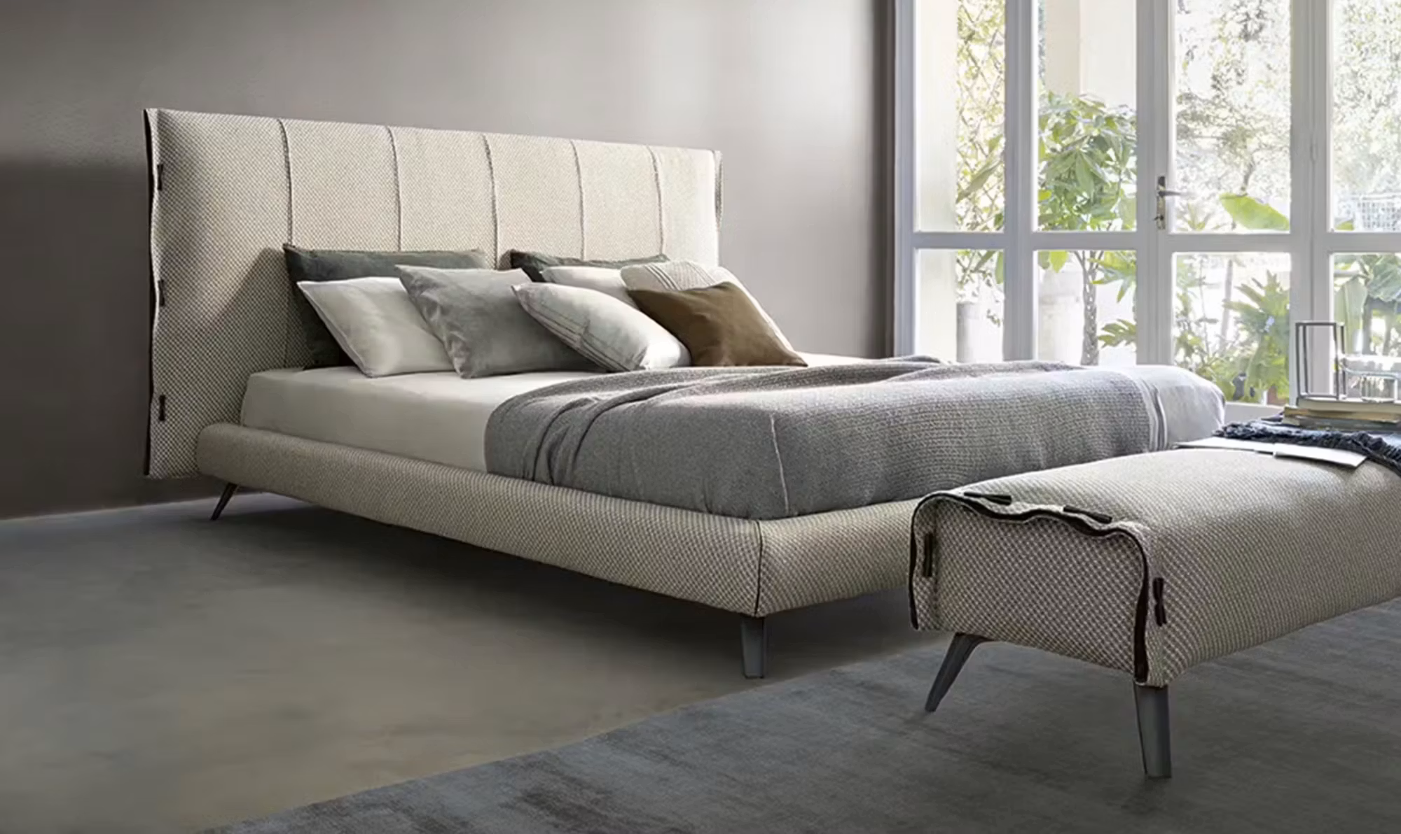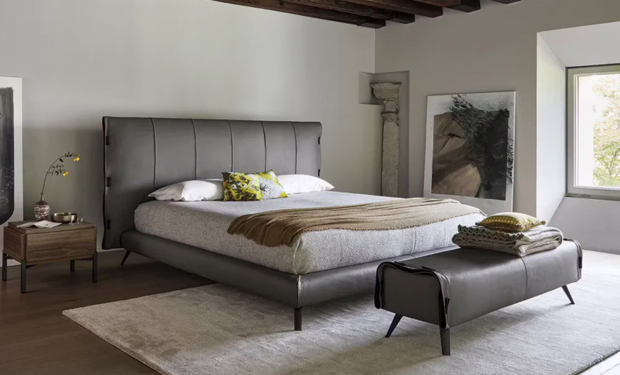 The Cuff bed expresses a strong personality in unique tailoring details. Detailed fastenings adorn two flaps which cover the padded headboard at either side and pleatings make a vertical pattern on the headboard cover.