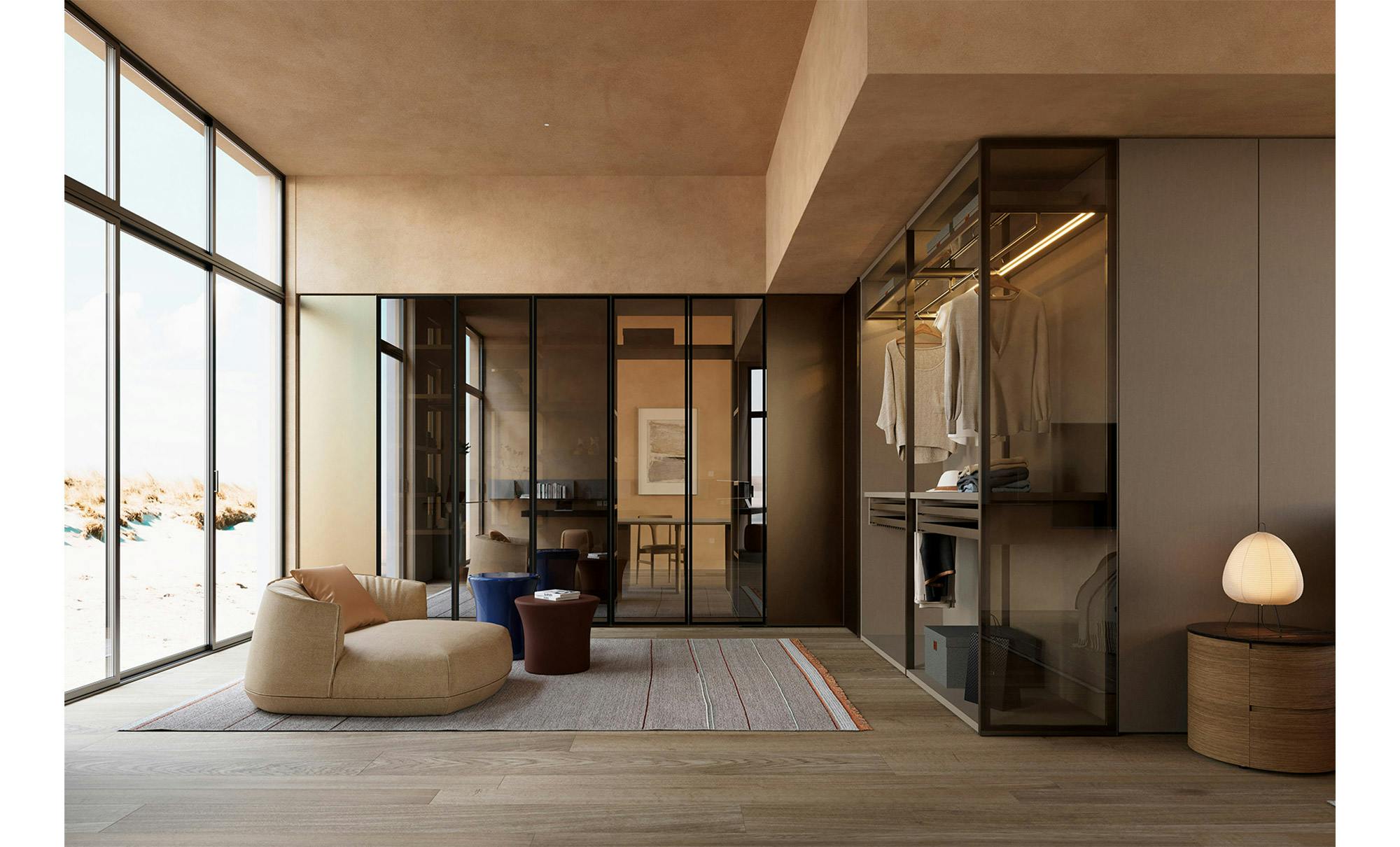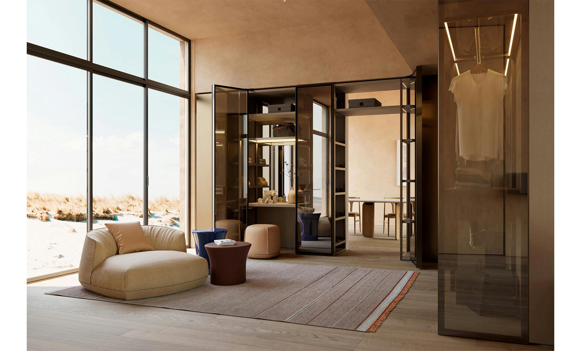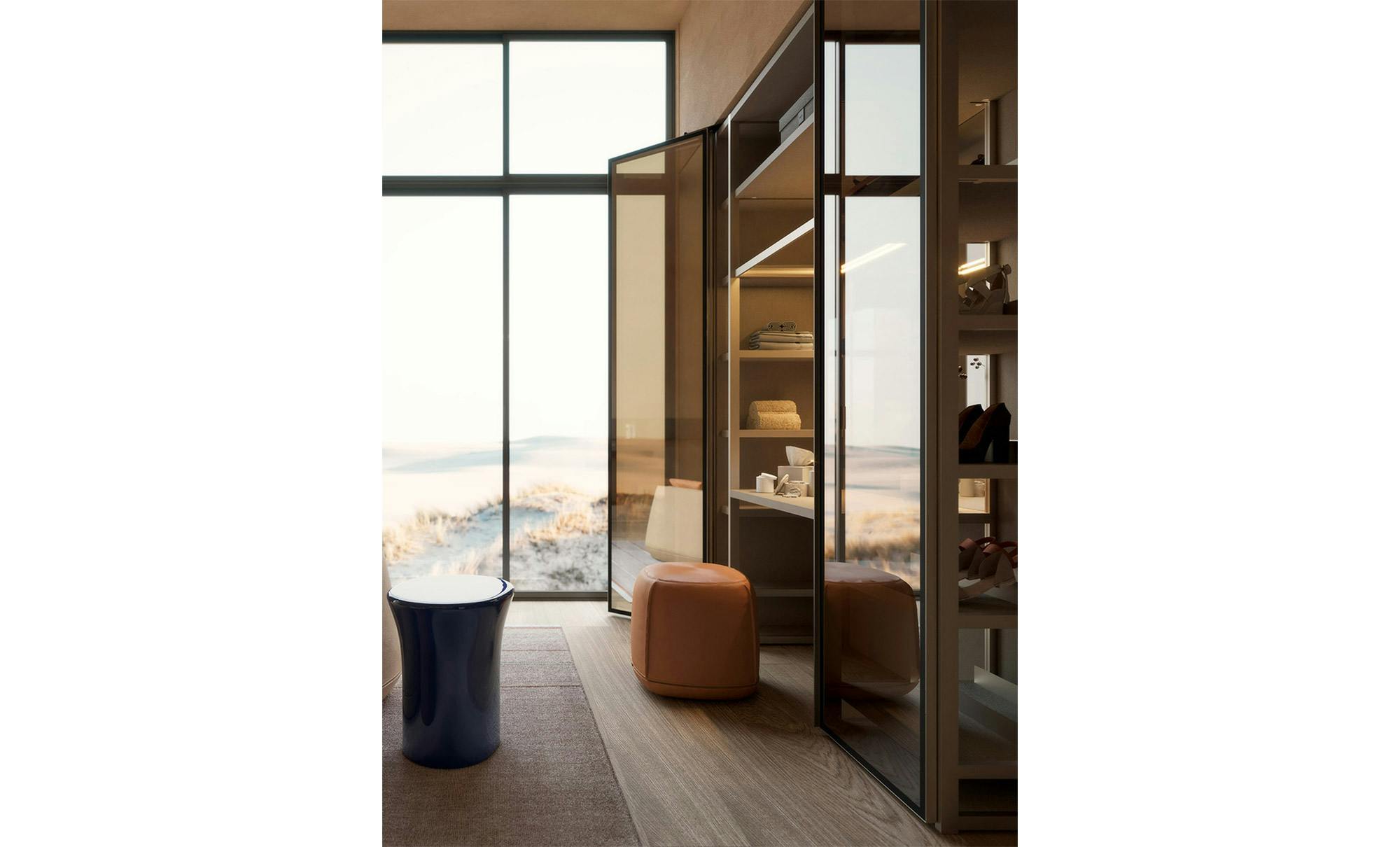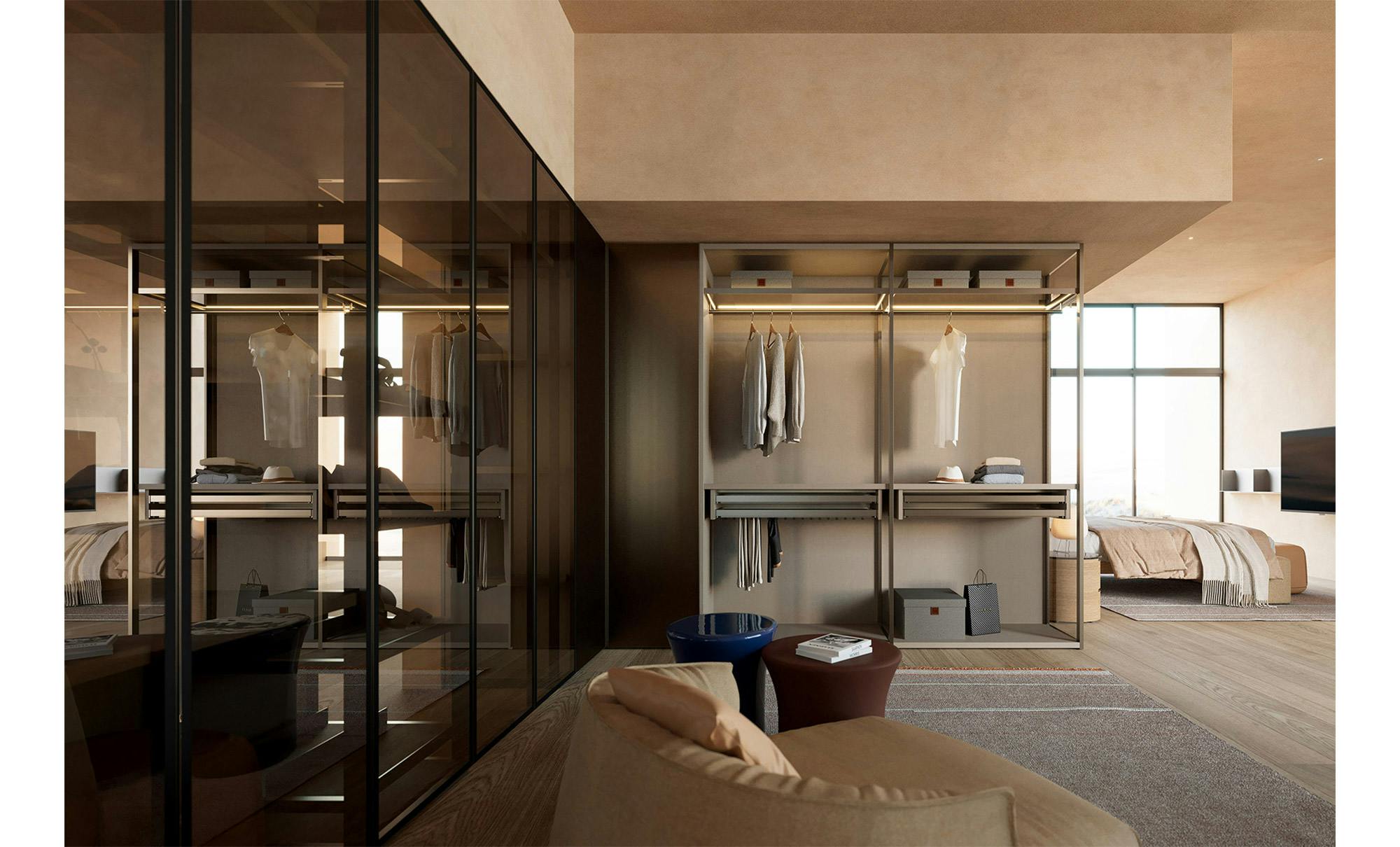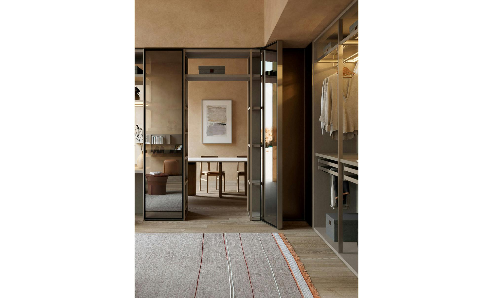 Aria is a wardrobe and walk-in wardrobe system that allows a combination of different units. The structure, with closed or through sides in Black or Bronze anodized aluminium, can be closed by sliding or hinged doors in a choice of materials, also in aluminium with flush glass. Wardrobes and walk-in wardrobes can be fitted with suspended or floor-standing drawer units, storage racks, glass and aluminium pull-out shelves, boxes and customised accessory holders. In the Aria Grafica version, grip recess openings create interesting graphic effects.