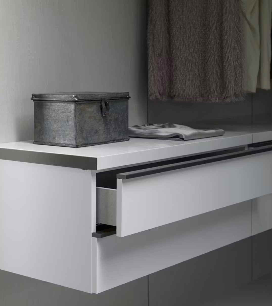 Wall panels equipped with wall unit containers as well as clothes hanging bars and shelves; everything you need to create a customised wardrobe solution.