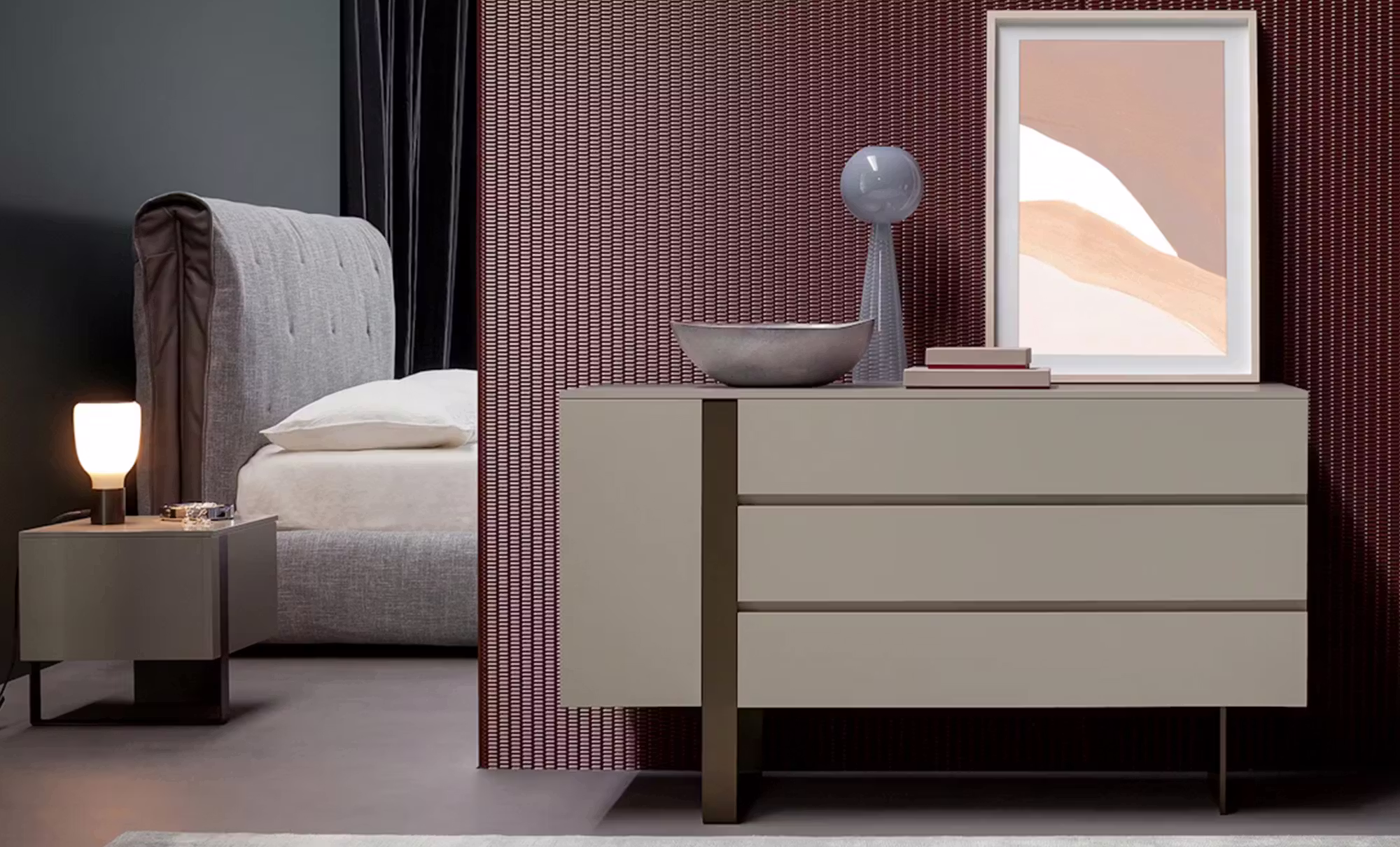 Antibes is a storage system designed for the bedroom area which draws its inspiration from the traditional shapes of dressers and bedside tables and then deviates from them, taking the geometry of the designs to an extreme. The asymmetrical metal base supporting the lacquered wooden structure adds a distinctive original and modern touch. On one side of the element the base runs vertically along the entire front section of the dresser or bedside table until it touches the ground; on the other side, it becomes slender and thin, as though wishing to disappear from view. The bedside table and dresser set in the Antibes collection are available in two different colour combinations: rope lacquered wooden frame and bronze finish metal base, or mud lacquered wooden frame and lead finish metal base.