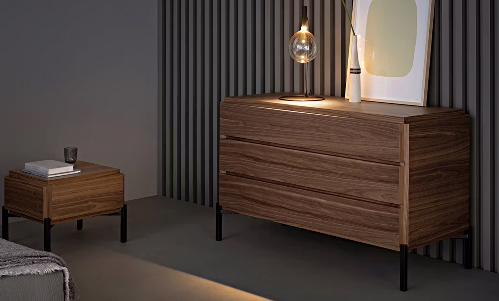 The elements of the system have been designed with a focus on the linear, graphic purity created by the wooden modules that form the drawers, sides and top, resting on a metal structure that serves as a base. The simple geometry of the bedside tables and dresser set emphasises their practical function: this is mainly the case with the grooves on the front section, which are particularly highlighted by the design and serve as handles without being visible.