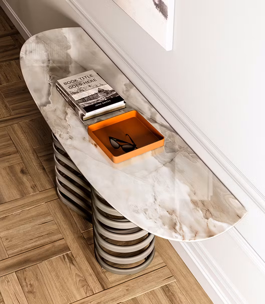 The Rotolo console with ceramic top is the original console perfect as an entrance furniture. This functional piece of furniture easily adapts to different living environments thanks to the inimitable structure and the large shelf that can be used to store objects and ornaments. The structure is made with a titanium painted metal base that supports the shaped shelf in polished Onice ceramic. Attractive and with a sure impact, the original console with a modern and contemporary style becomes a perfect decorative element for furnishing the spaces of the home. Also available in the version with marble and crystal top.