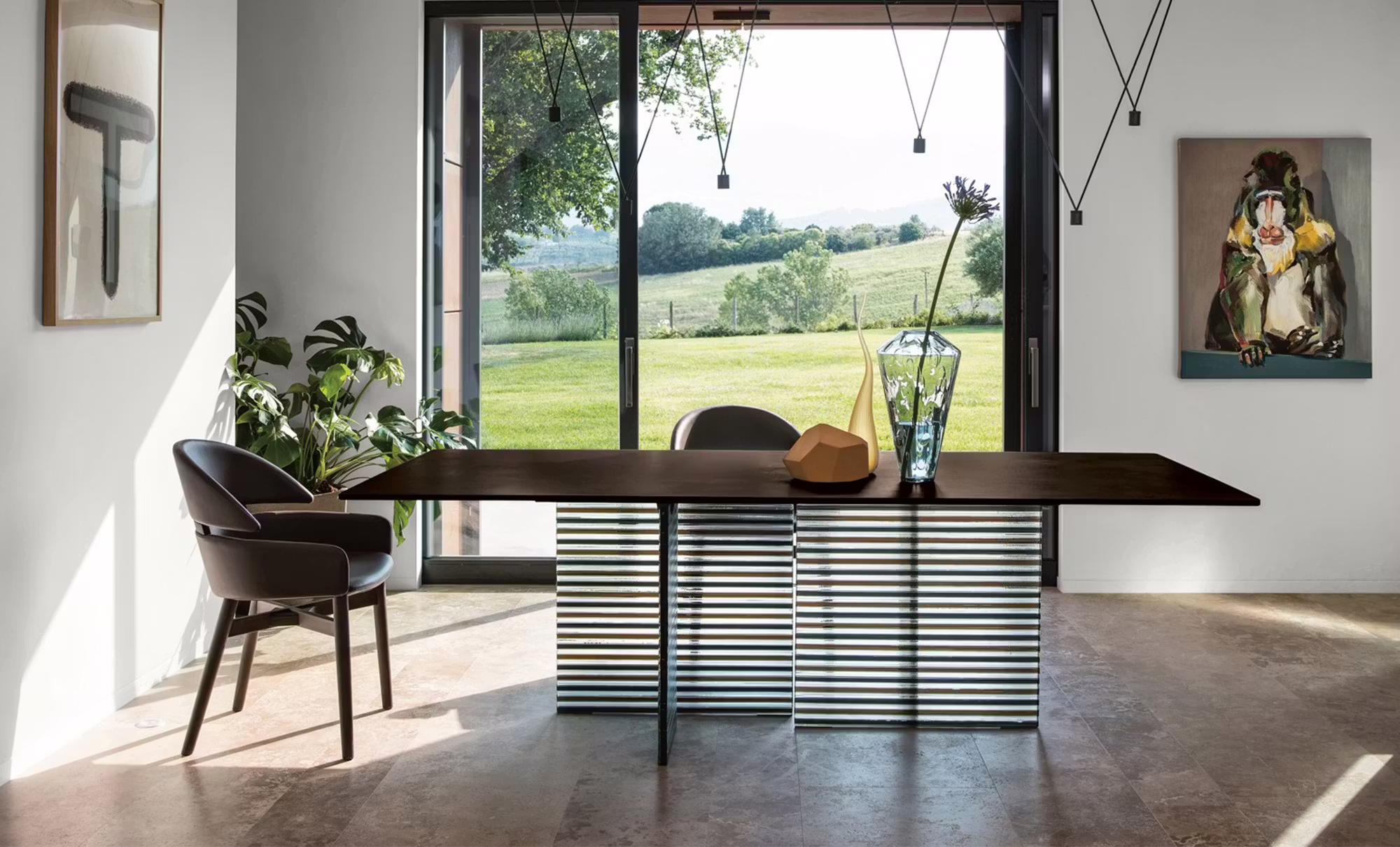Table with base made of four or six separate 30 mm DV Glass elements with colored stripes. Tempered top made of 15 mm transparent glass, back-lacquered with monochrome colors or hand-finished with Ecomalta, finergrained texture finish, or in Canaletto walnut veneered wood, Tobacco finish.