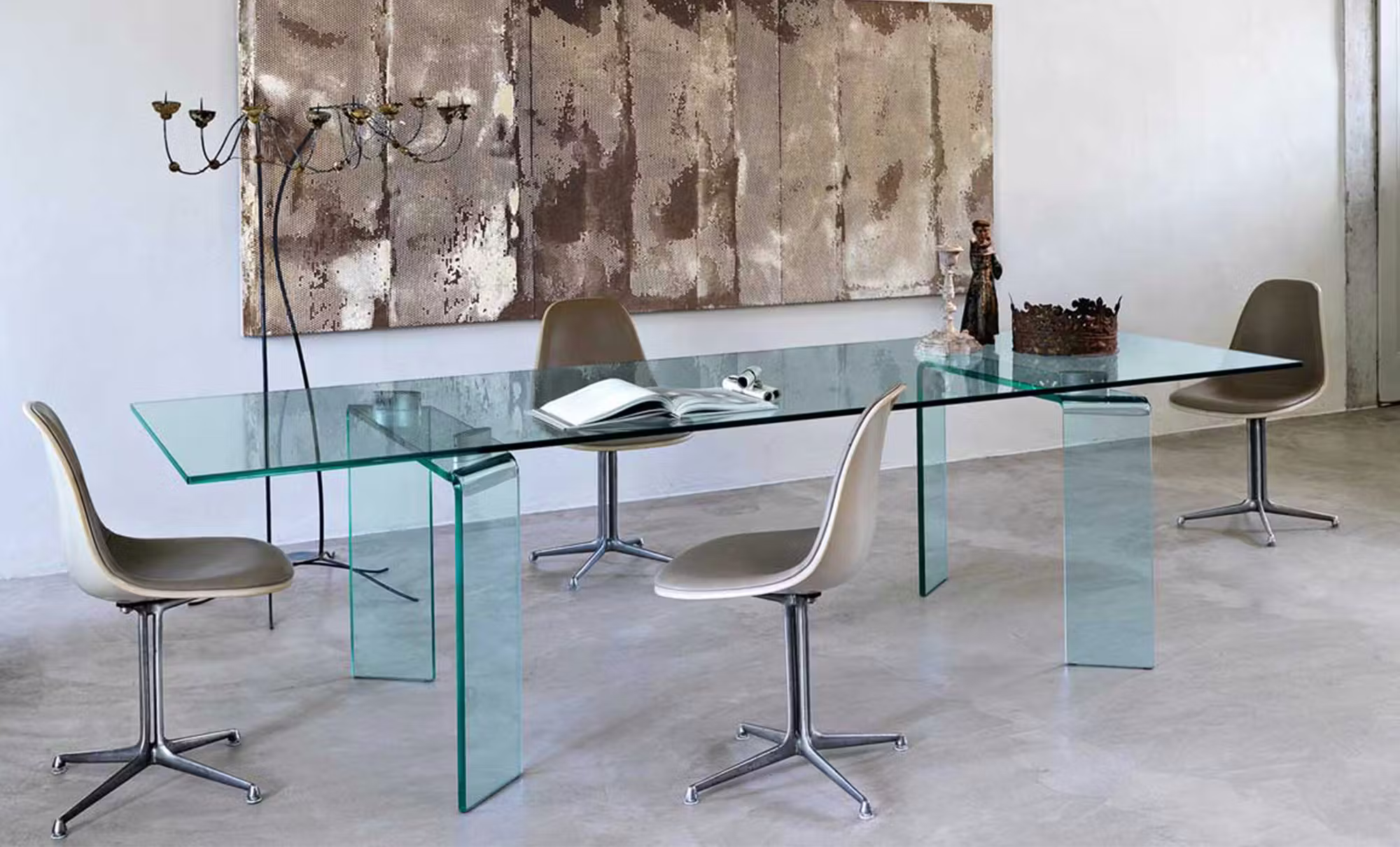 Table with 15 mm-thick glass top and detachable legs in 19 mm-thick curved glass. Joints in aluminium with gloss finishing. The legs are placed just under the top border.