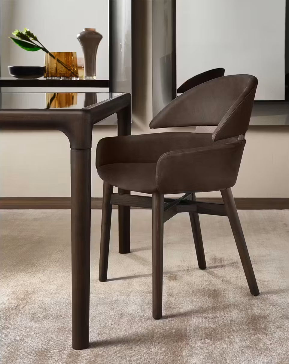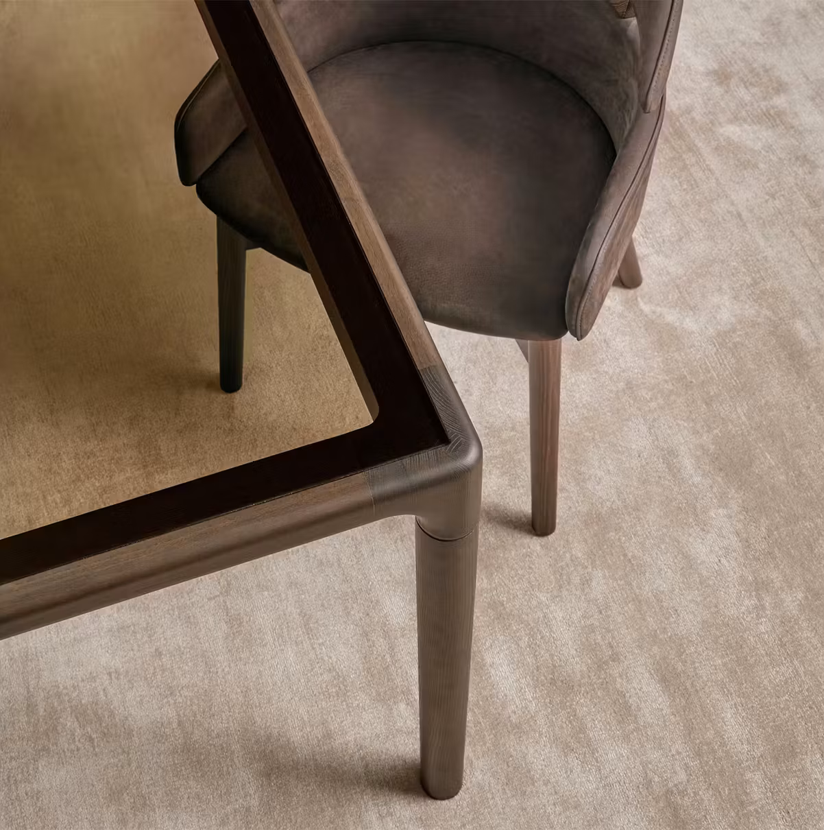 Table with 8 mm tempered glass top; solid wood structure available in Tobacco or Heat-treated Black finish.