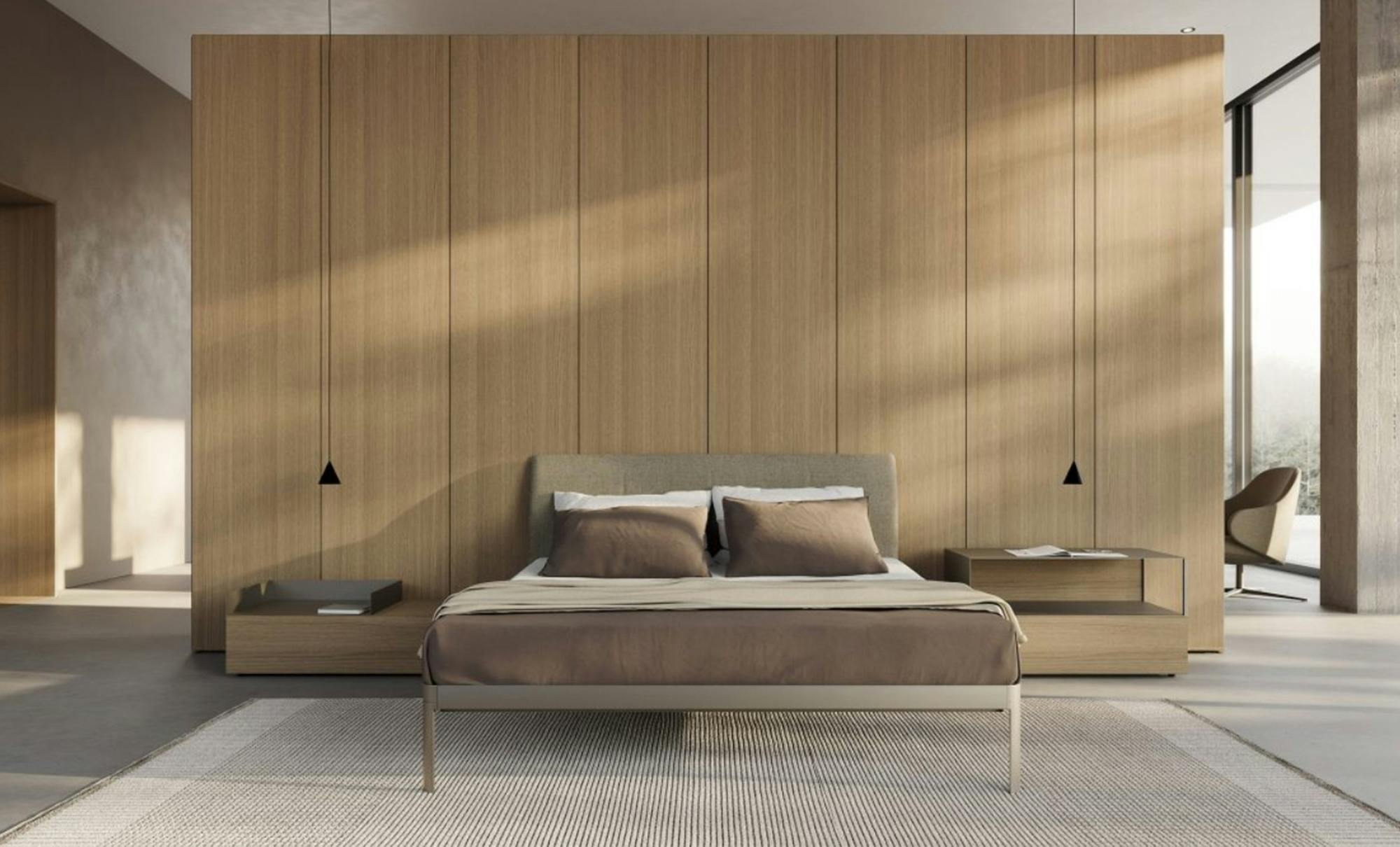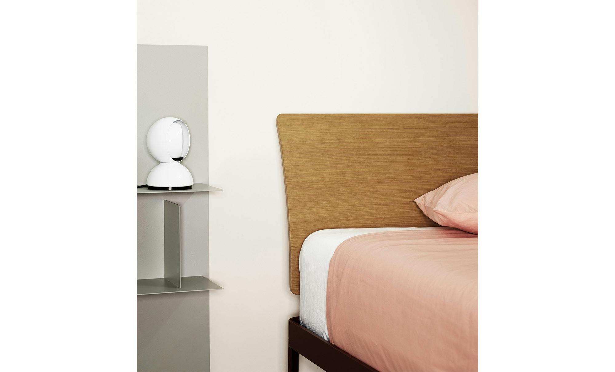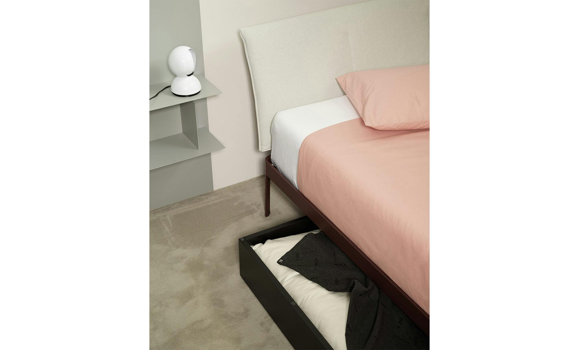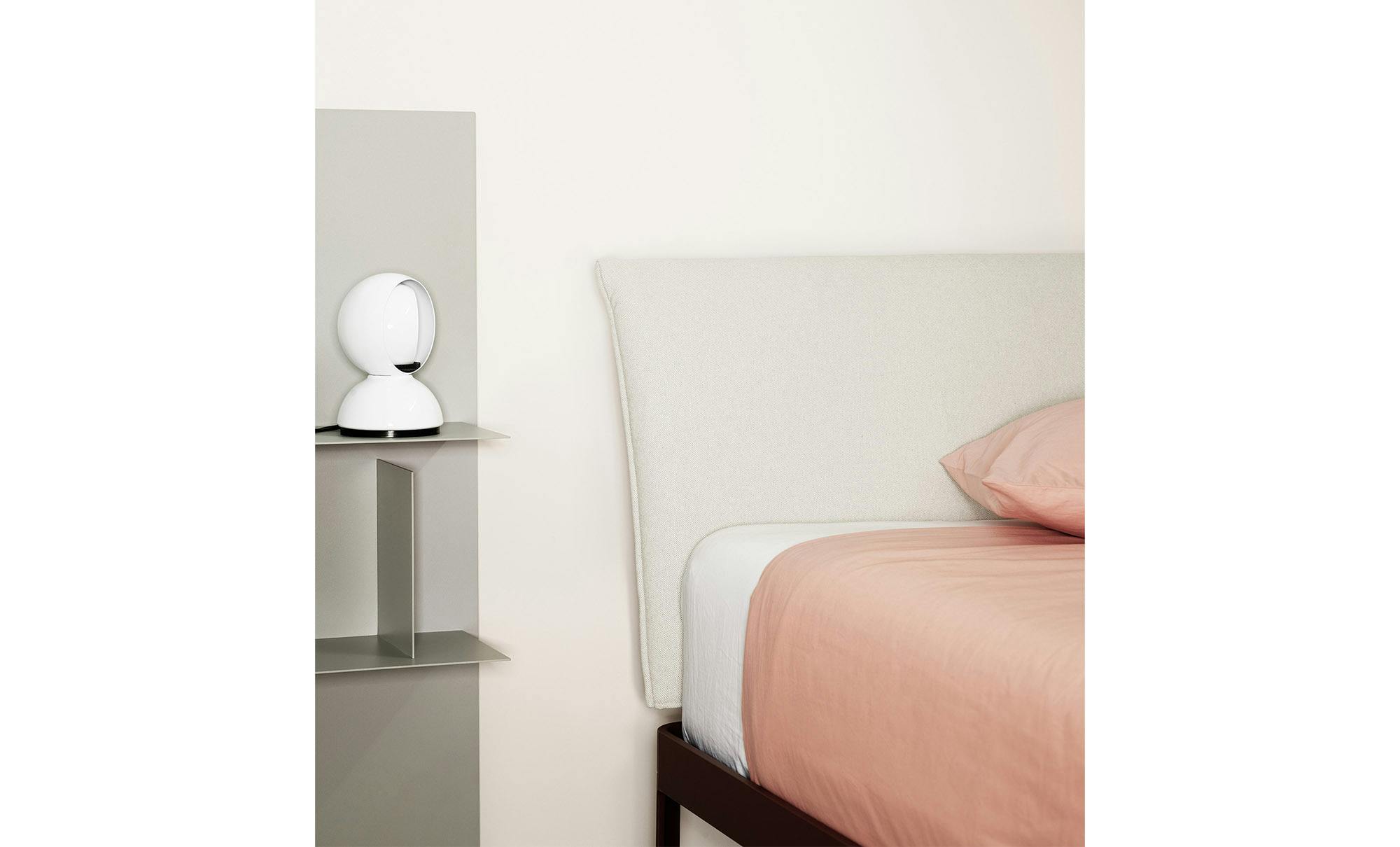 Reissue of the historic bed designed by Luciano Bertoncini in 2000. The structure is made of 100% recyclable aluminium, powder-coated, while the headboard is made of plywood or upholstered. Available in a compact package, is very simple to assemble and disassemble.