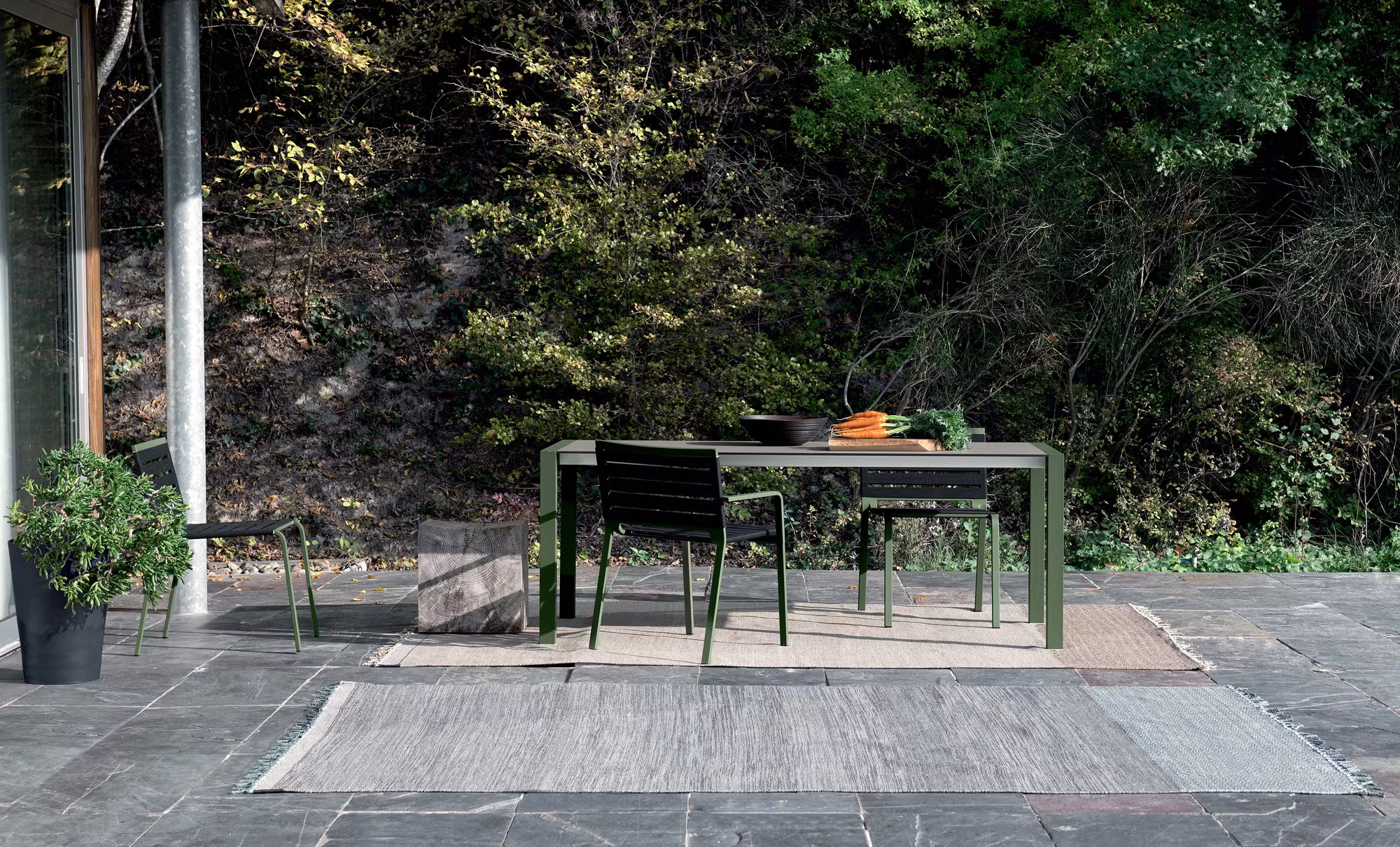 The philosophy of Mustache is to live problem-free outdoors with the same elegance that is a distinguishing feature of the most prestigious home and contract furnishing environments. A collection of carpets for outdoor spaces designed by Paolo Zani, featuring a melange weave in refined colours, with edge trims in various colours and unusual fringes that make them even more unique. With its prestigious craftsmanship and tailor-made quality, the handloom weaving technique makes each one of these carpets slightly different and therefore unique.