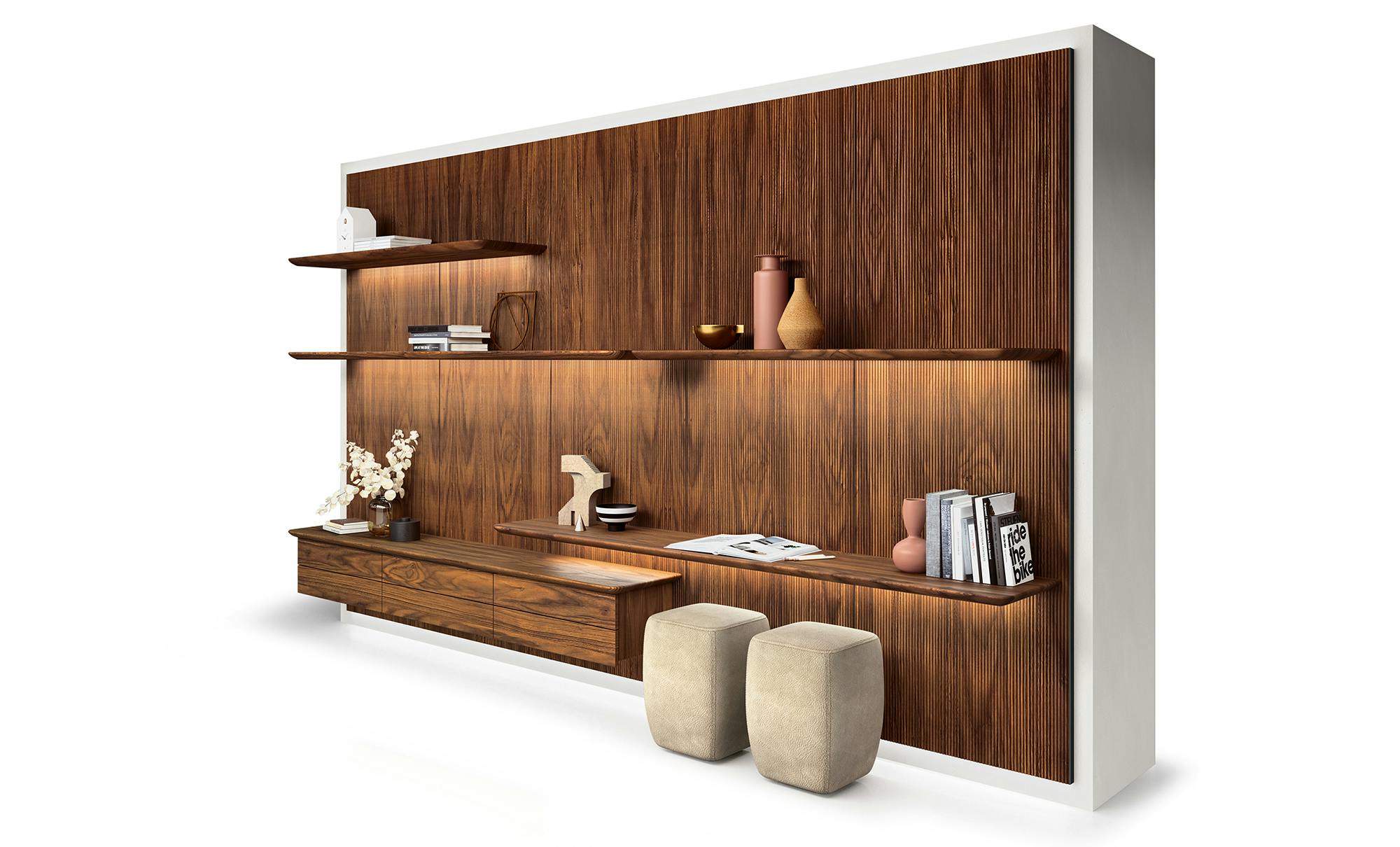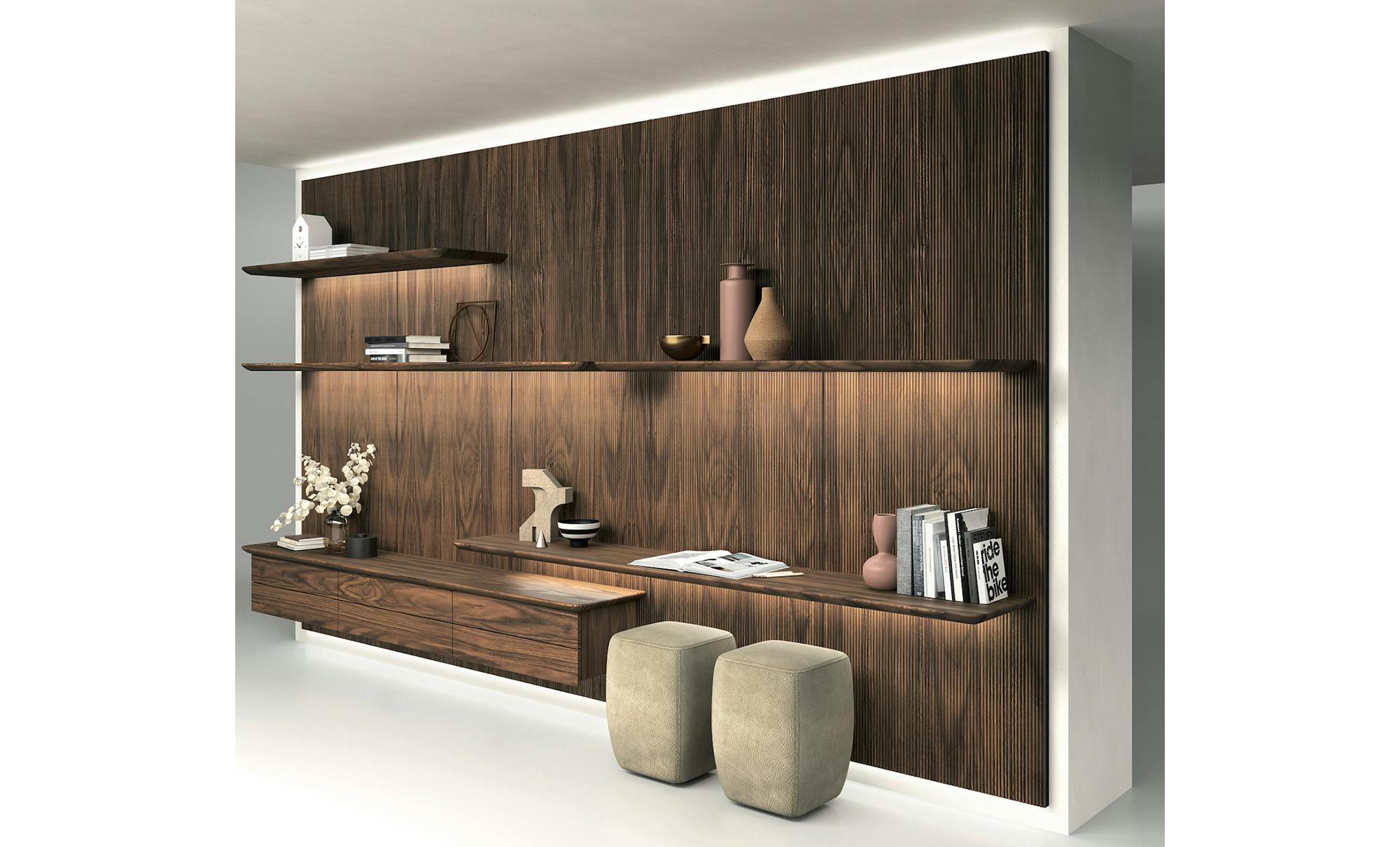 Boiserie panels in veneered blockboard available also with special vertical processing, Fresart; shelves in veneered blockboard with beveled and rounded edges; drawers with dovetail joints. Possibility to add LED strips to the boiserie panels and the shelves.