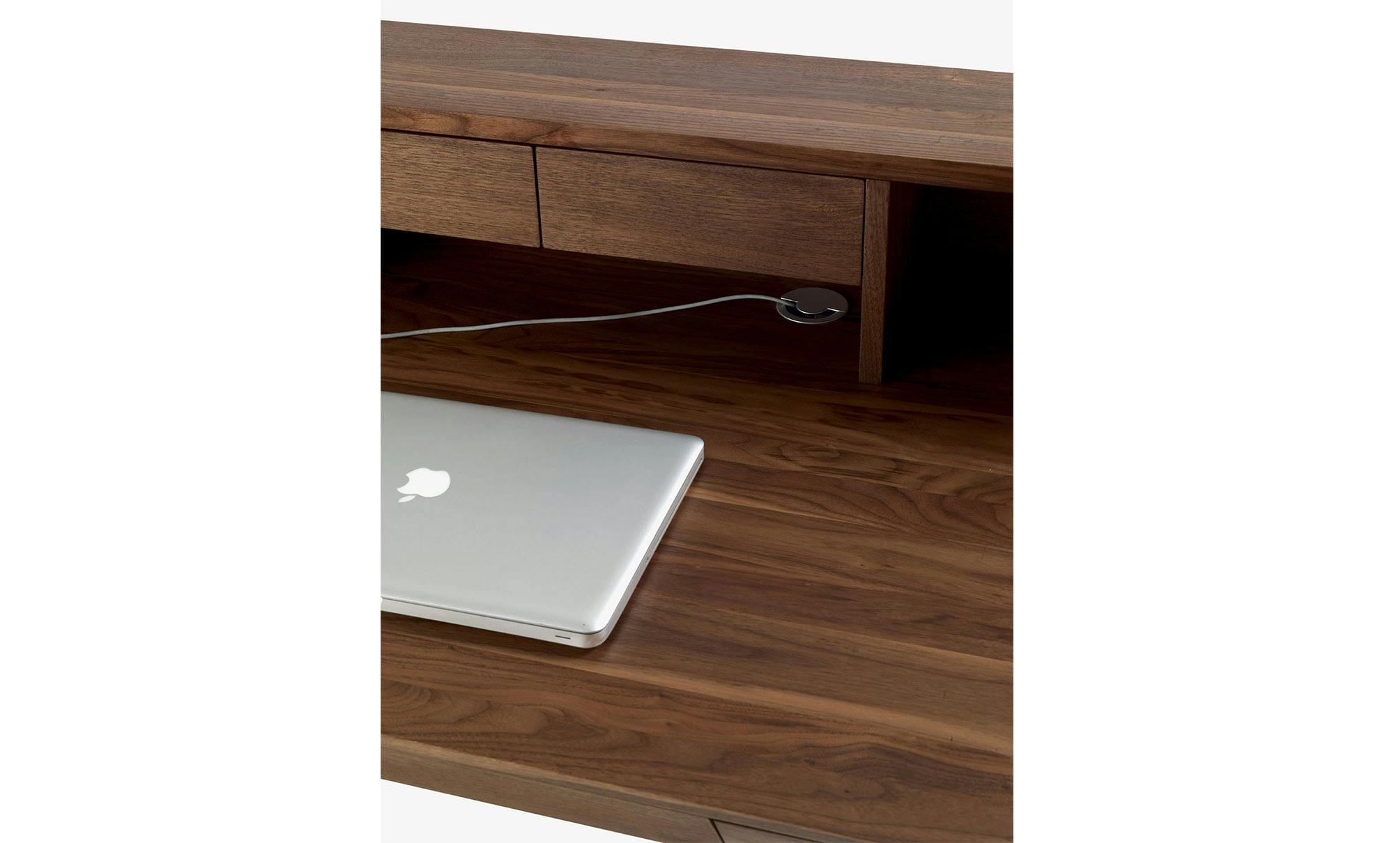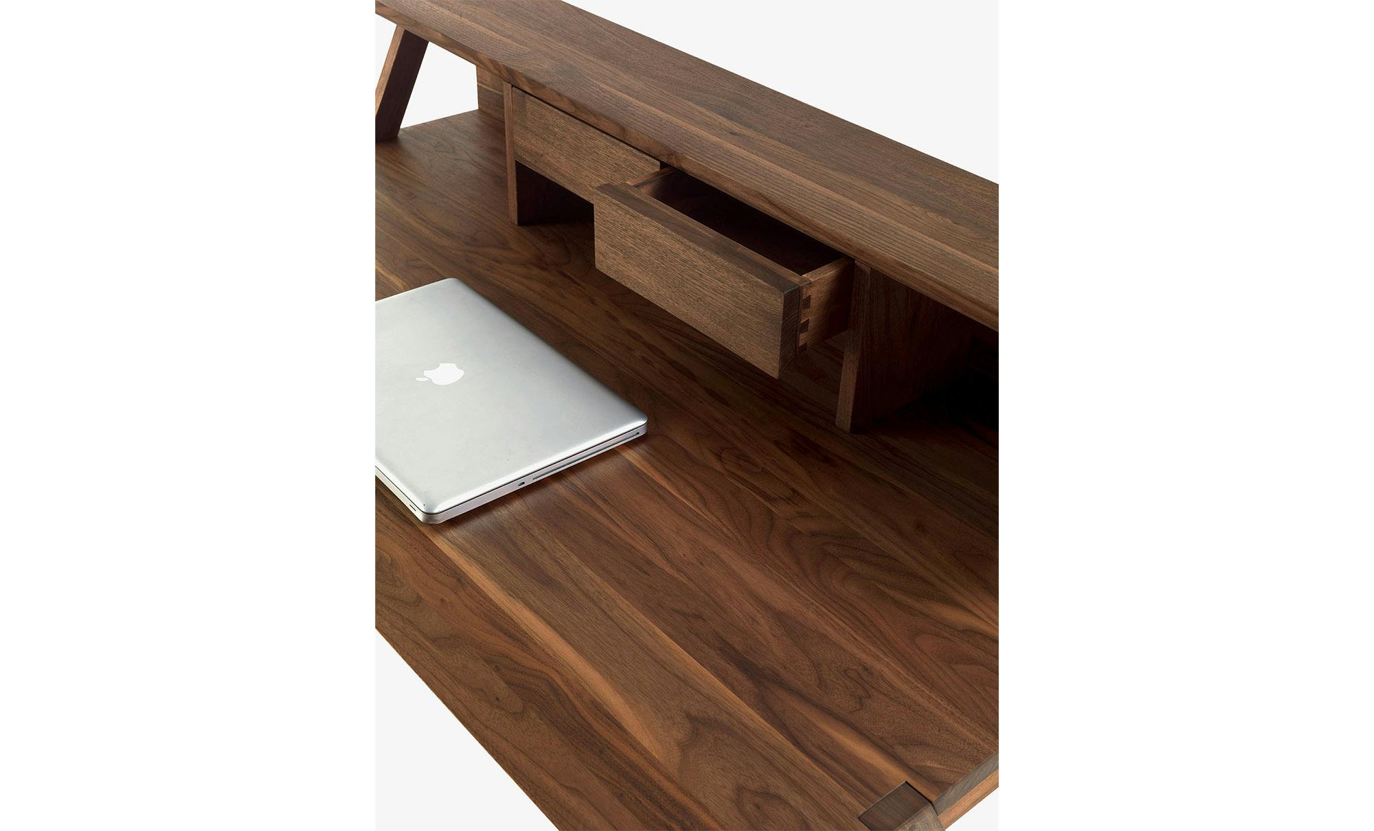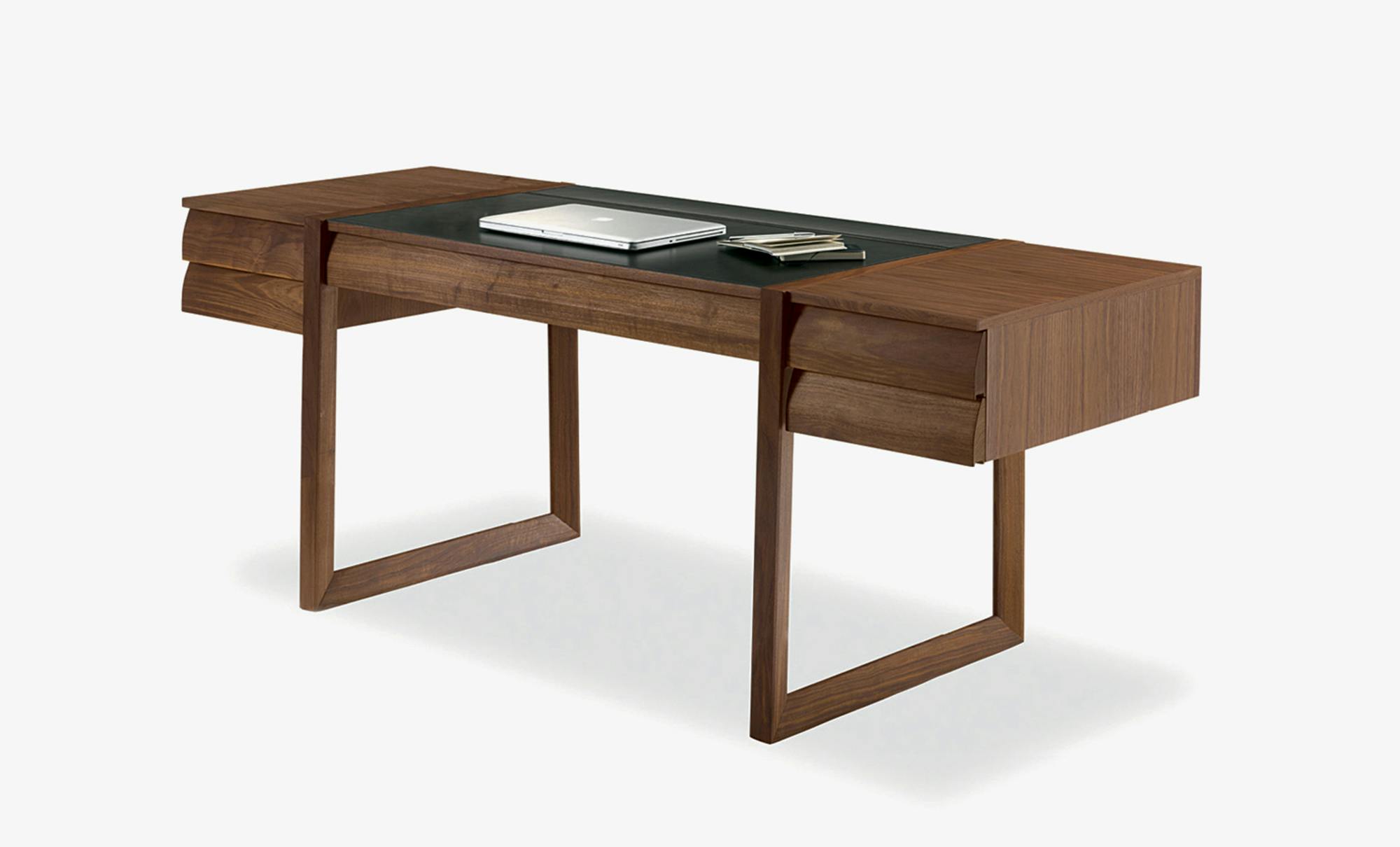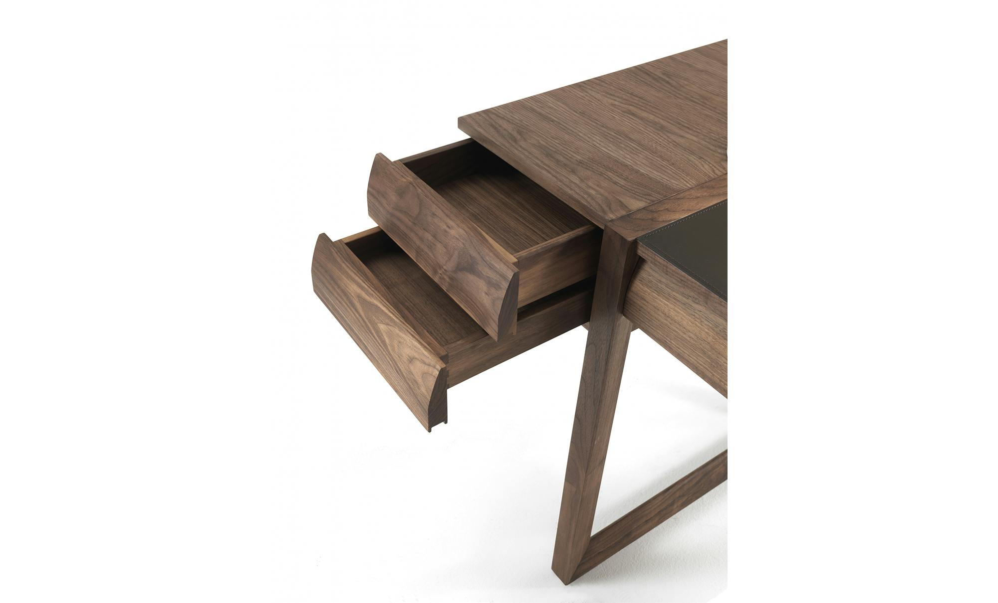 Writing desk with squared lines made from veneered plywood, with assembled drawers with dovetail joints and sledge legs in hardwood.