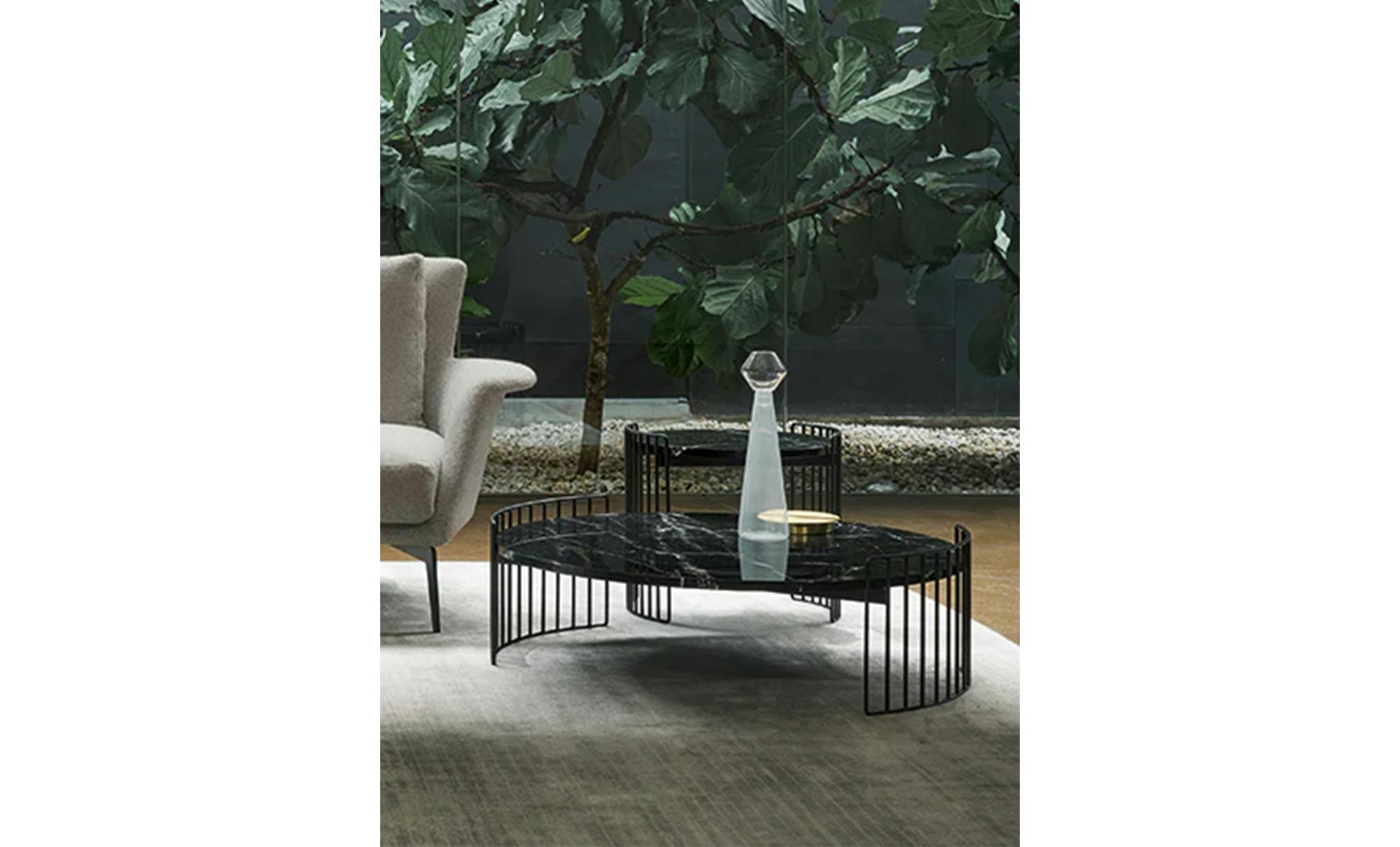 Harpe coffee tables, while decorating the living room, are practical storage areas which elegantly enhance the living room on their own or in combination. The collection of Harpe coffee tables is inspired by the strings of a harp from which they take their name: the base is visually light and encircles the top, available in various materials from marble to ceramic, as well as metal and glass. With their different heights and dimensions and different available tops, the Harpe round coffee tables for living spaces can adapt to every living room, both when placed alone and when combined.