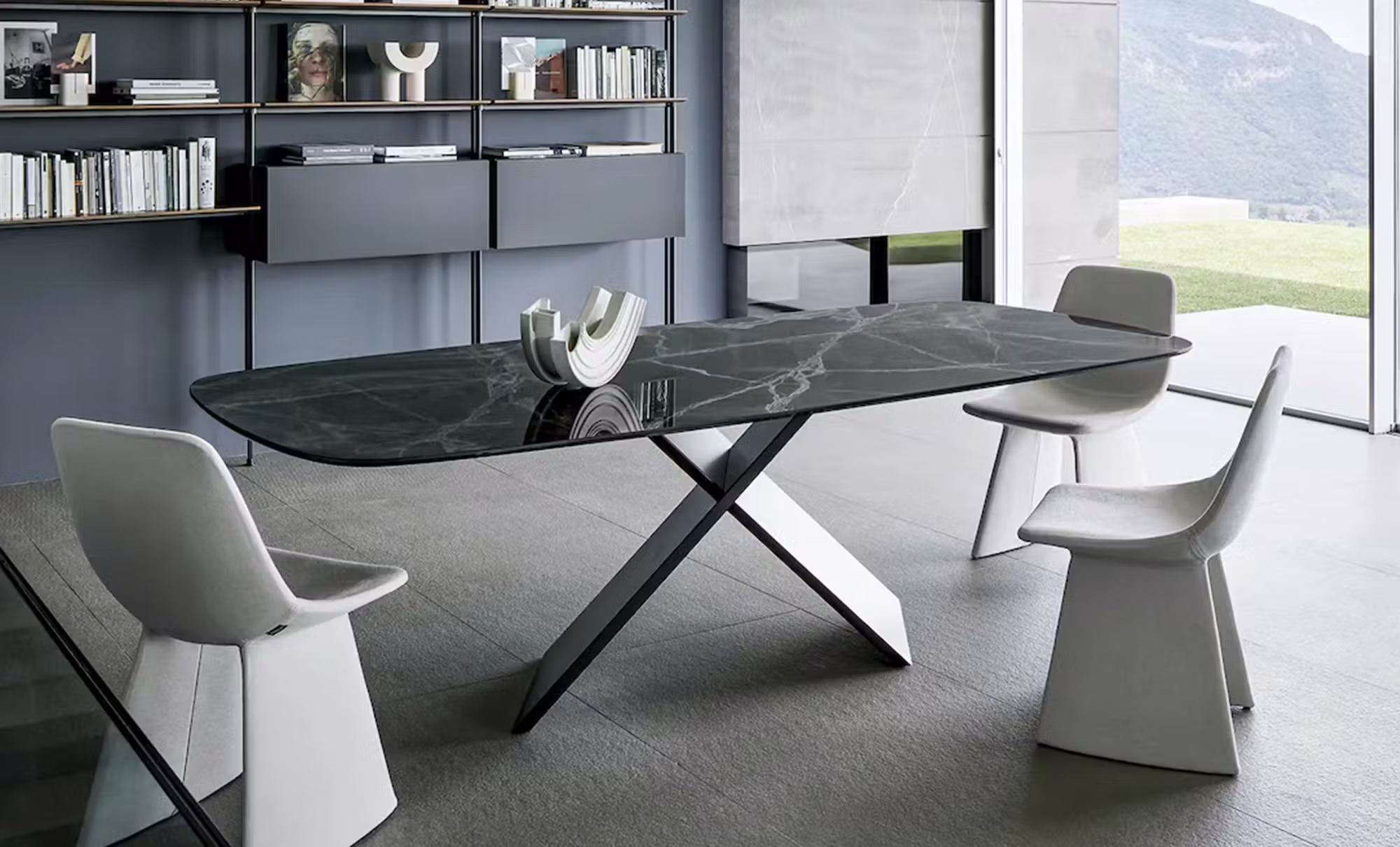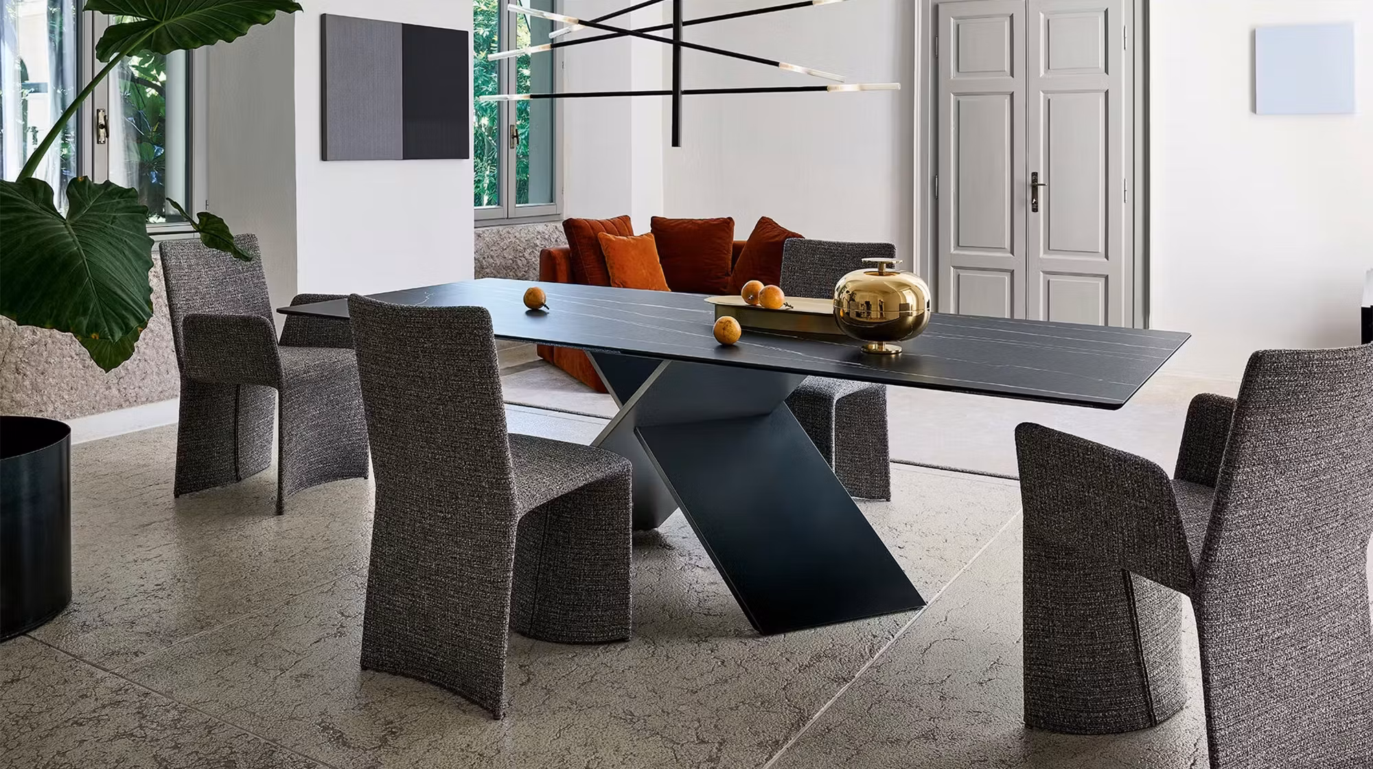 The AX table perfectly expresses the pursuit of essentialness: pure silhouettes and a geometric language are its distinguishing features, making it a simple and light-weight object, yet at the same time characterised by a solid shape. The name derives from the shape of the base, which is formed by two criss-crossed components an X.