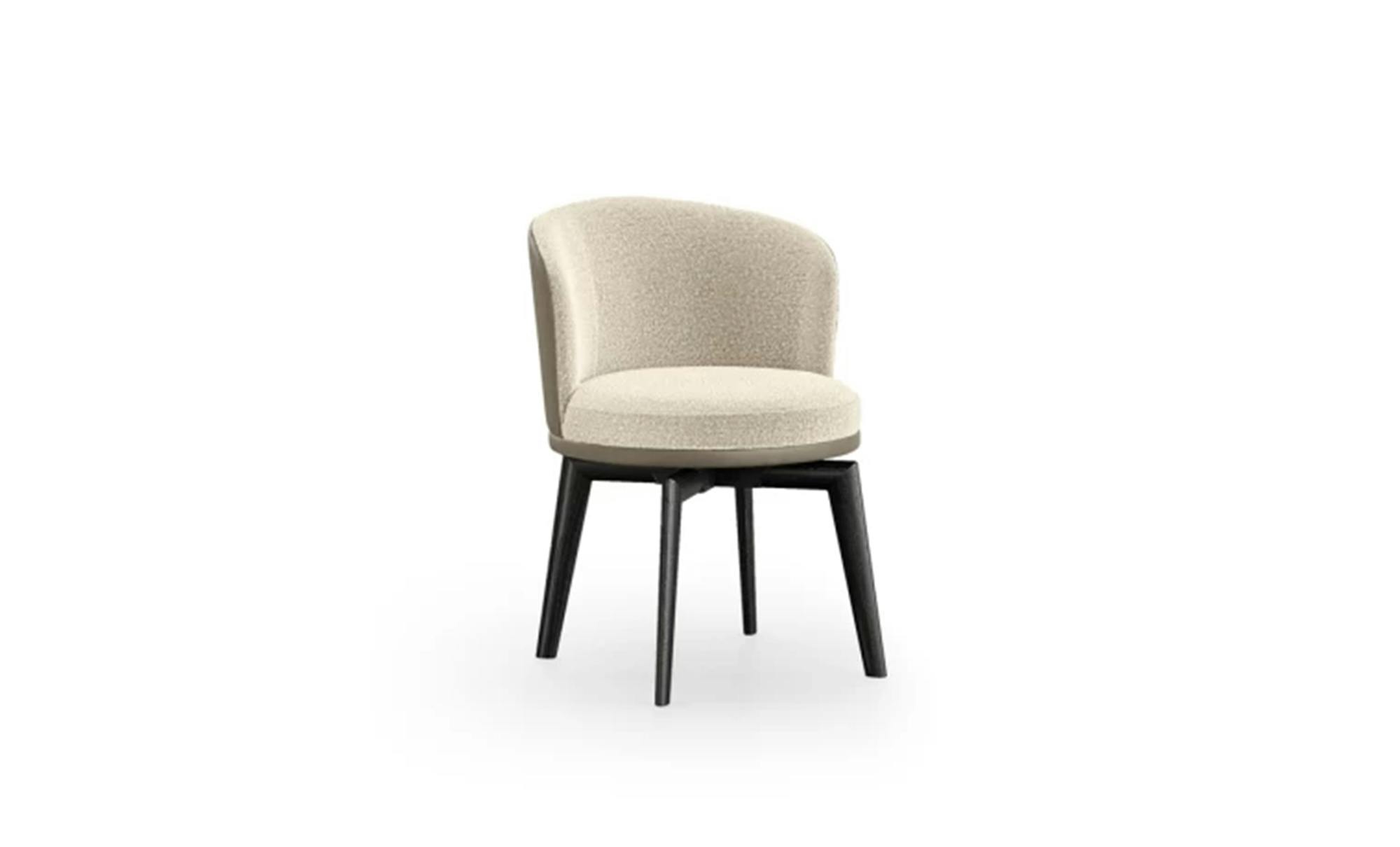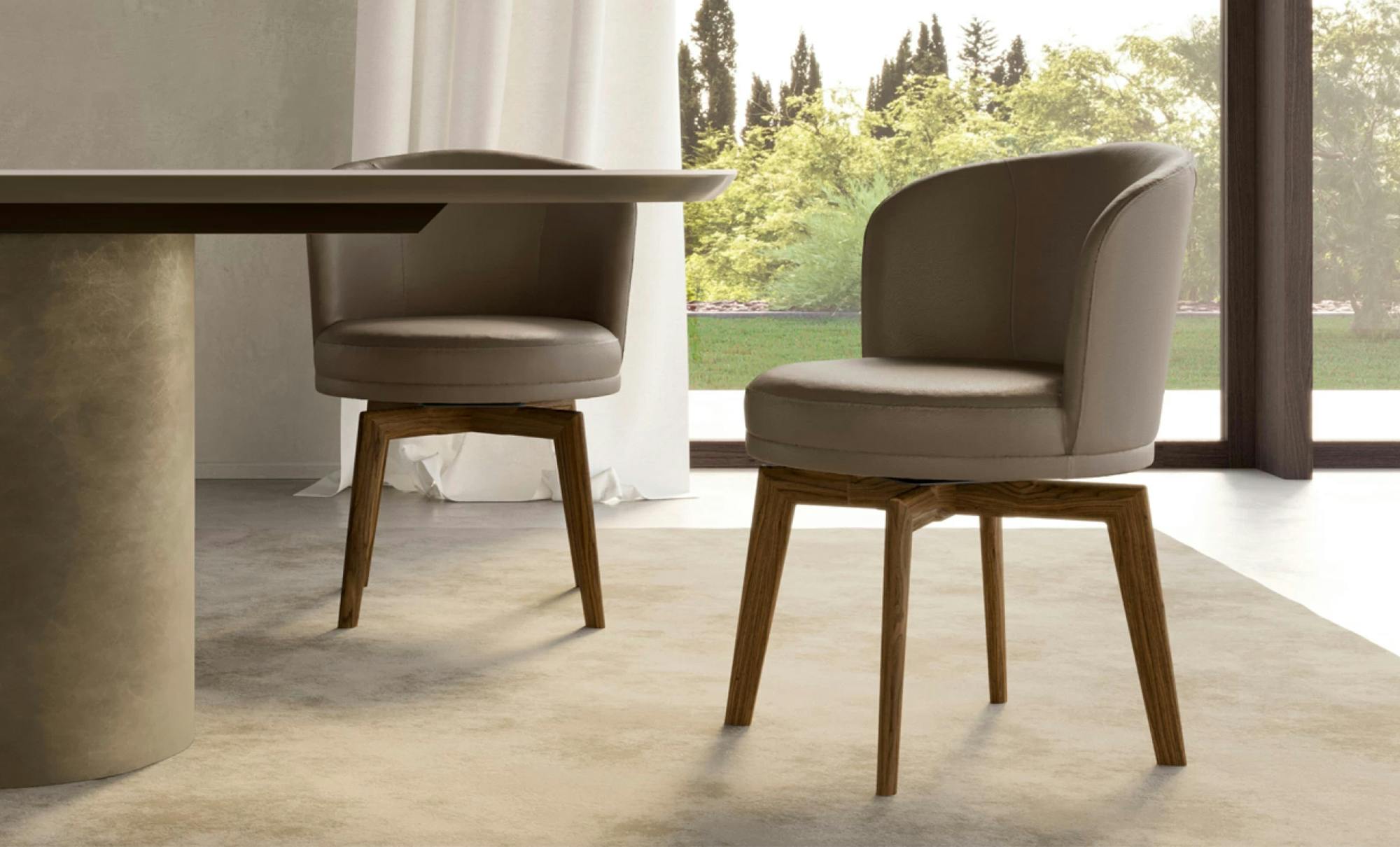 The Ginger chair with wooden trestle base is an upholstered chair with a swivel seat that blends classic design with a modern interpretation, all while focusing on comfort and function. Its elegant, harmonious lines are ideal for refined residential interiors such as living rooms, dining rooms, and bedrooms, but also for workspaces that aim to convey prestige and professionalism. The solid wood base provides strength and durability, while its minimalist shape blends perfectly with the soft curves of the seat, creating a balanced and sophisticated whole. Available in eco-leather, fabric, and leather, Ginger offers a wide range of colors and finishes to suit any interior. Also available in versions with metal or wood legs.