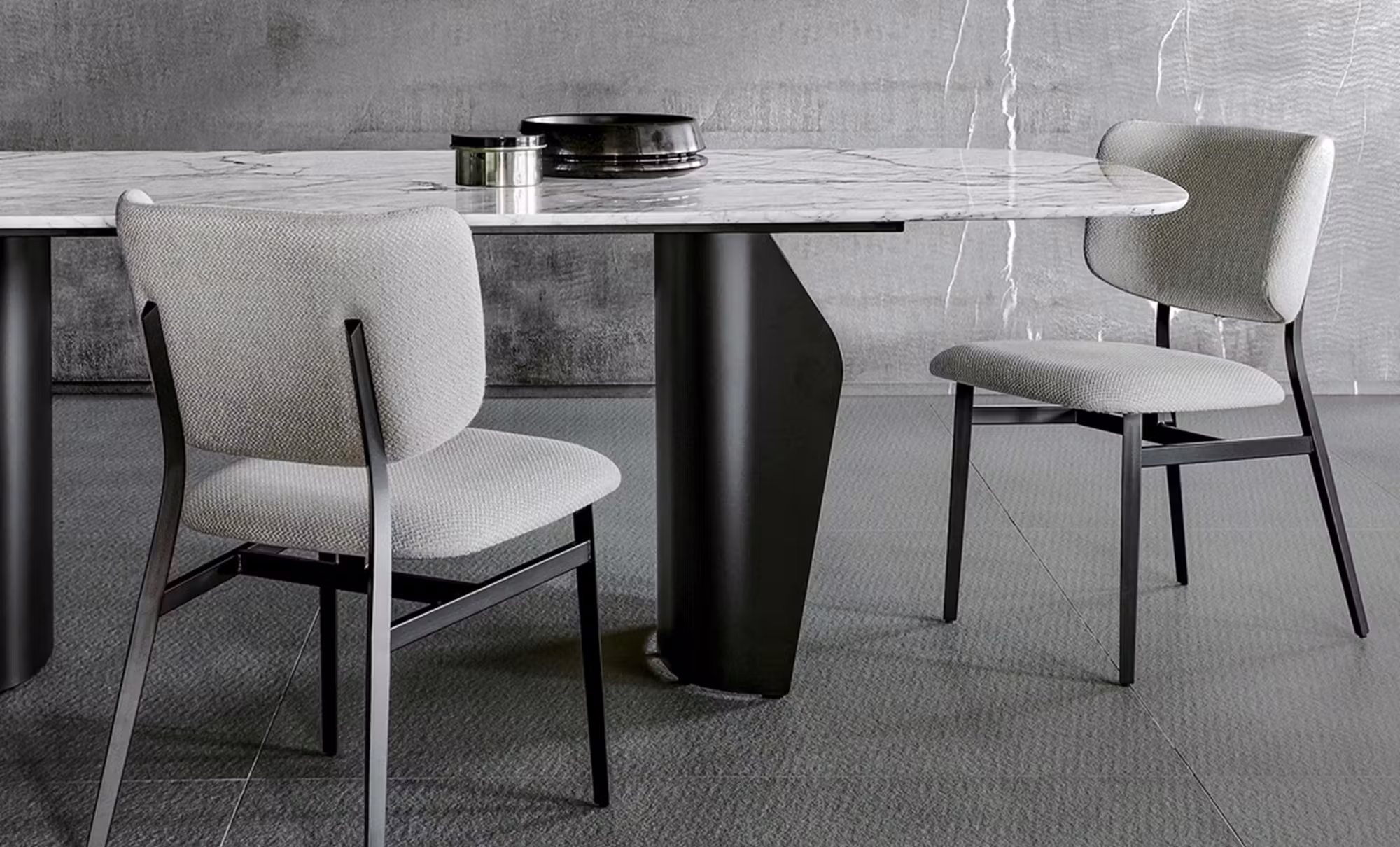 Delicate, clearly defined lines sum up the Noor padded dining chair, featuring a steel frame which is both light and solid. The seat comes close to the structure of the backrest without touching it, giving the overall impression of “floating”. The design of the backrest, slightly curved at the sides, gives it a welcoming and comfortable appeal. The backrest and seat are padded and upholstered in leather, eco-leather or fabric.