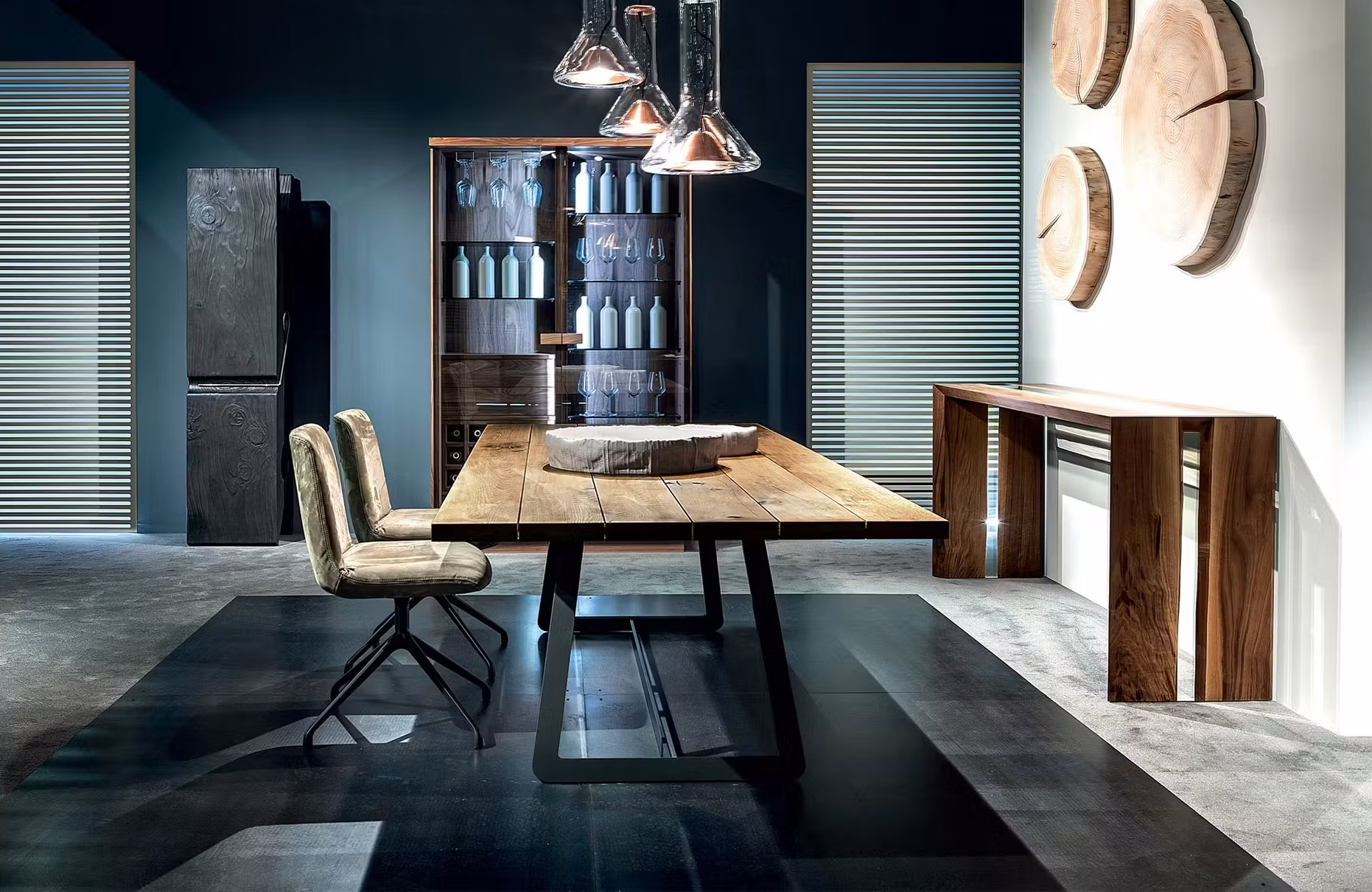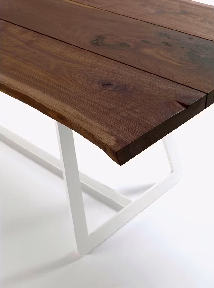 The Calle Cult dining table is designed by Aldo Spinelli and made for Riva 1920 in Italy. It is solid natural organic wood worked with materials that are gentle on the environment and finished with natural oils. In creating this superior product the manufacturer used reforestation and reused timber from around the world. The laser cut steel legs contrast beautifully with the organically formed timber. Suitable in modern, classic, private and corporate interior design environments.