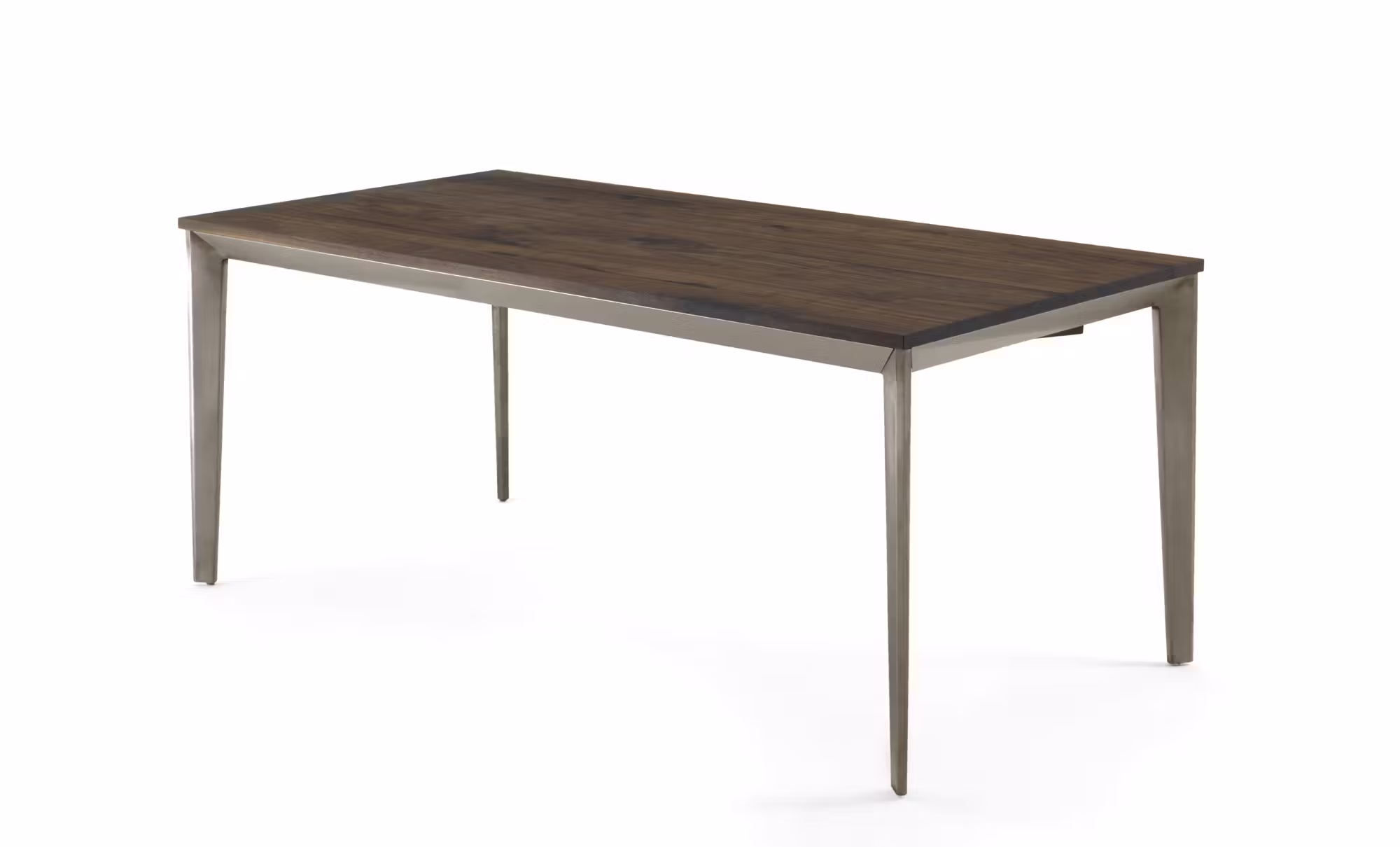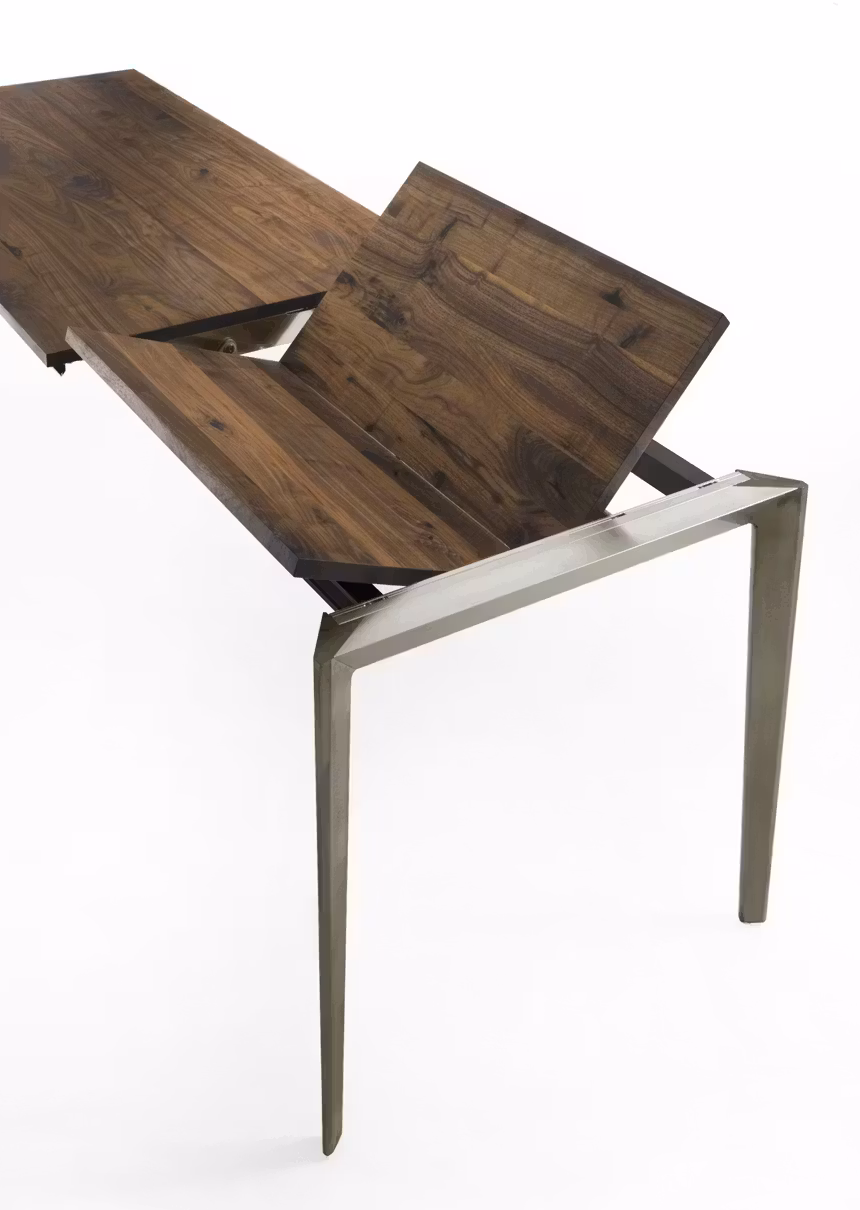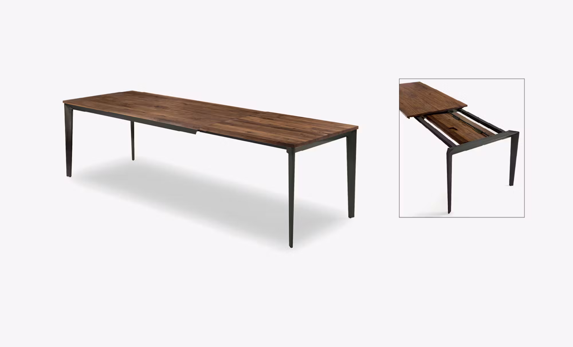 An extendable table with a solid wood top, this designs features an appealing material mix that makes it warm and contemporary.  The frame is equipped with a sliding device that is perfectly integrated into the structure, allowing an extension of 100cm.