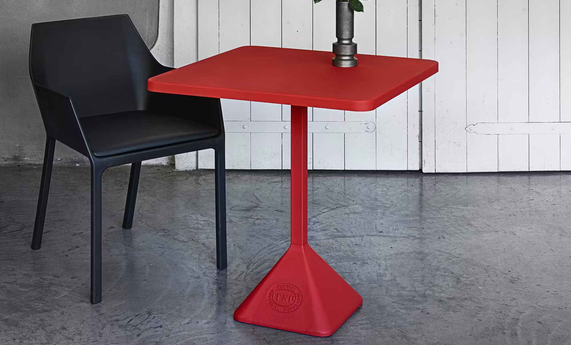 Italian made and designed, by Christophe Pillet for Kristalia. TNP dining tables were originally designed for the Villeurbanne Theatre National Populaire; one of the most prestigious French cultural institutions. Personalised with the theatres logo, its striking 30s minimalist style provides commentary as an ode to industry. Each part of the table is metal, extending to its cast iron base. A TNP table is ideal for home or community spaces.