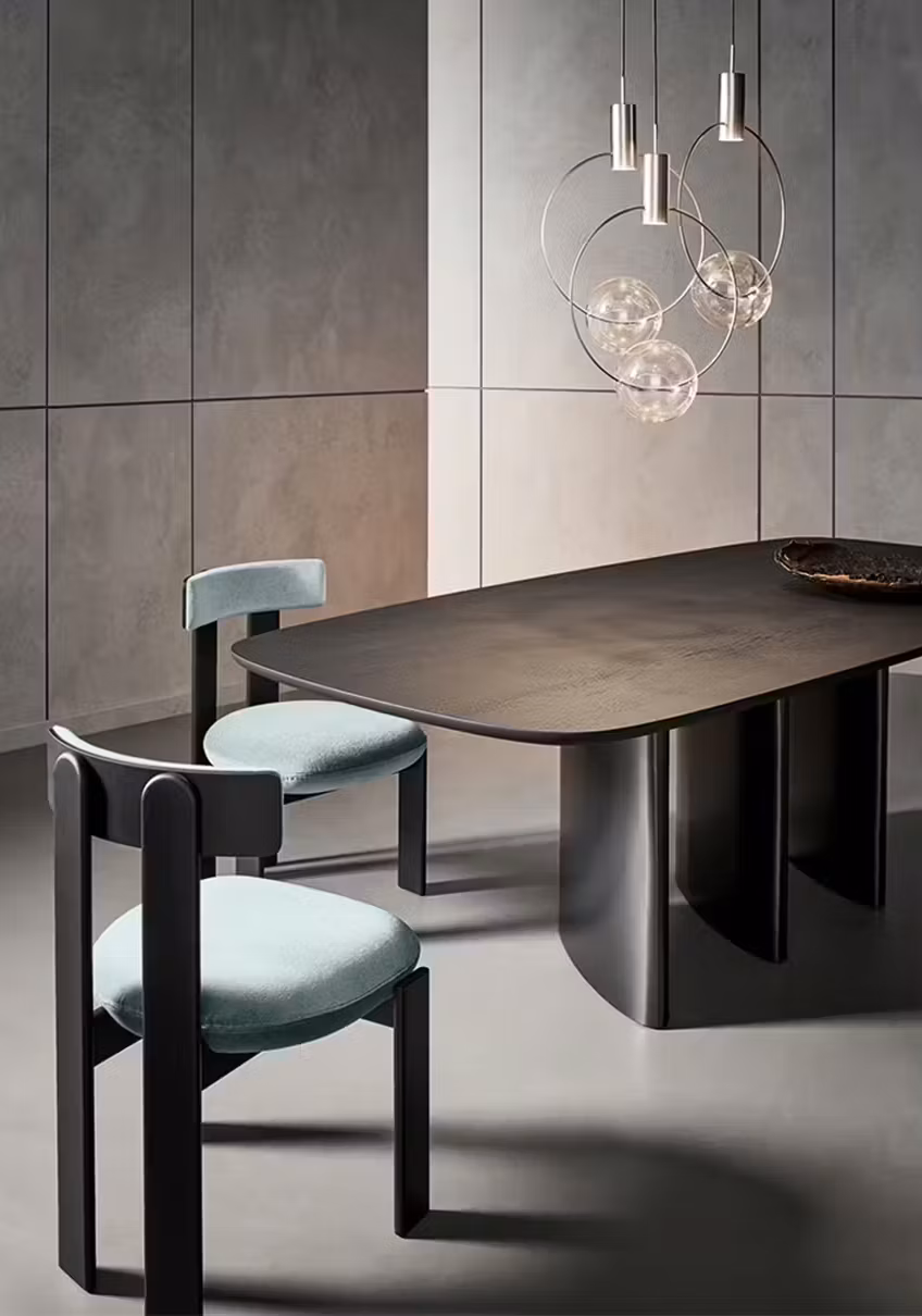 The Louver Table reveals its character little by little, offering a different perspective depending on the angle from which it is observed. With its strong theatrical presence making it the focal point of any environment, the Louver Table interprets the vision of the designer, who wants to evoke an imaginary passage, ideally the entrance to an ancient temple, in which light plays a crucial role in creating suggestive shadows on the floor. The three legs give the table a feeling of dynamism, allowing the light to create fascinating perspective effects which make the legs appear either slender or imposing, delicate curves or generous shapes, depending on the point from which you look at it. The design of the table is enhanced by the different finishes available, both in the single-material and multi-material versions. The single-material version is available in hand-trowelled clay or with a wooden top and base. Alternatively, it is possible to choose from numerous variations: the top is available in ceramic, marble or wood and can be combined with a metal or wooden base (Louver Table Wood), creating a contrast of considerable scenic impact with the solid elements of the base.