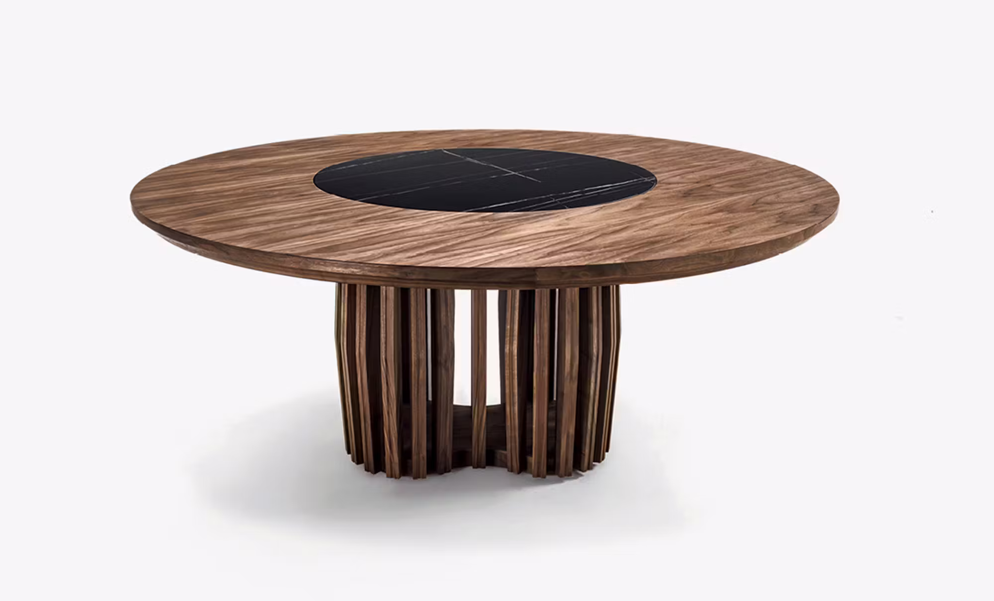 The Shang is a large scale round table with top in either veneered blockboard and edges in solid wood or marble, with the possibility to add a middle top in wood or marble, equipped with rotating Lazy Susan system. The base, made of solid wood, represents the infinity symbol.