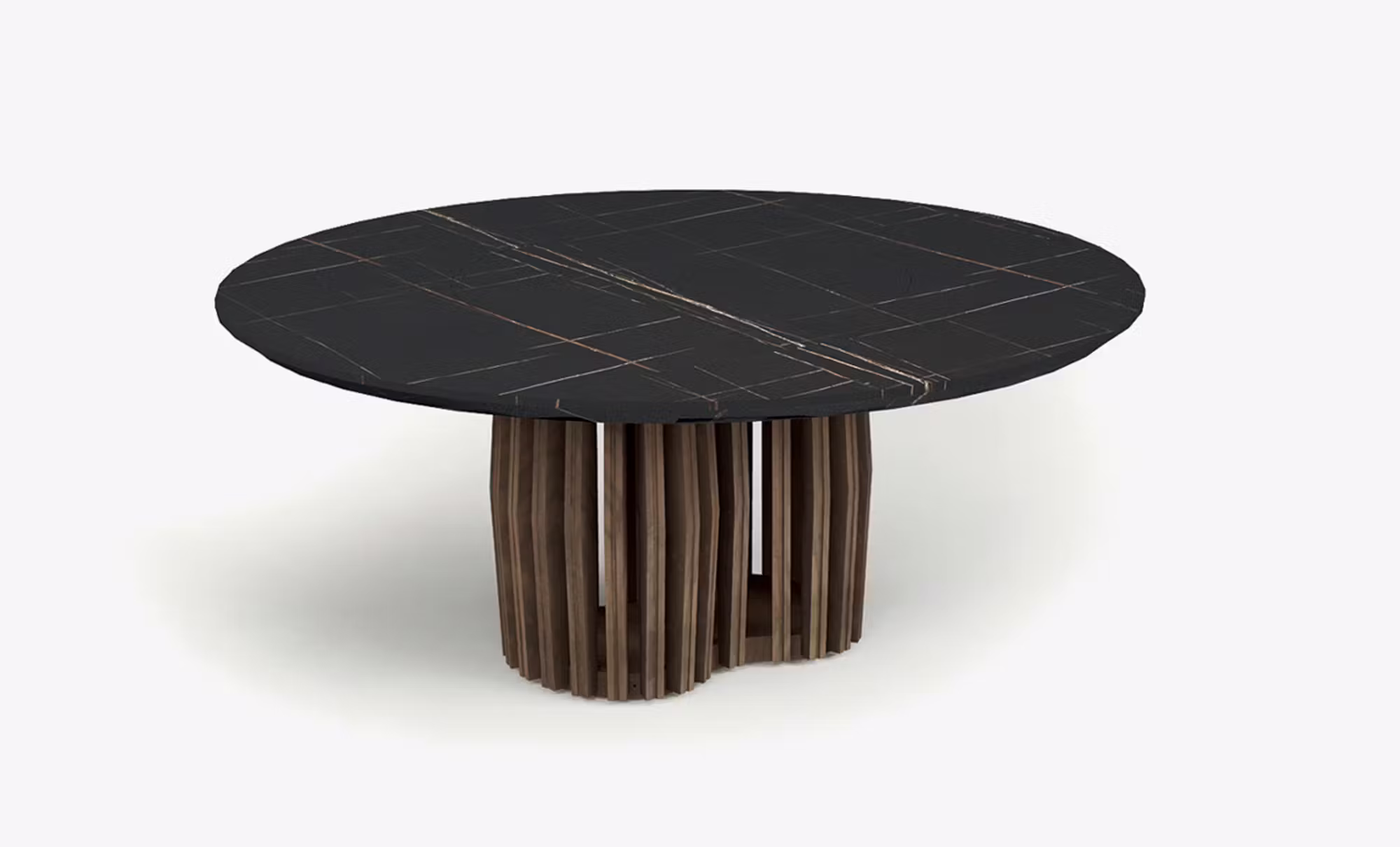 Available in round size options with a top in either various timbers or marbles; emperador, calacatta or green alpi.