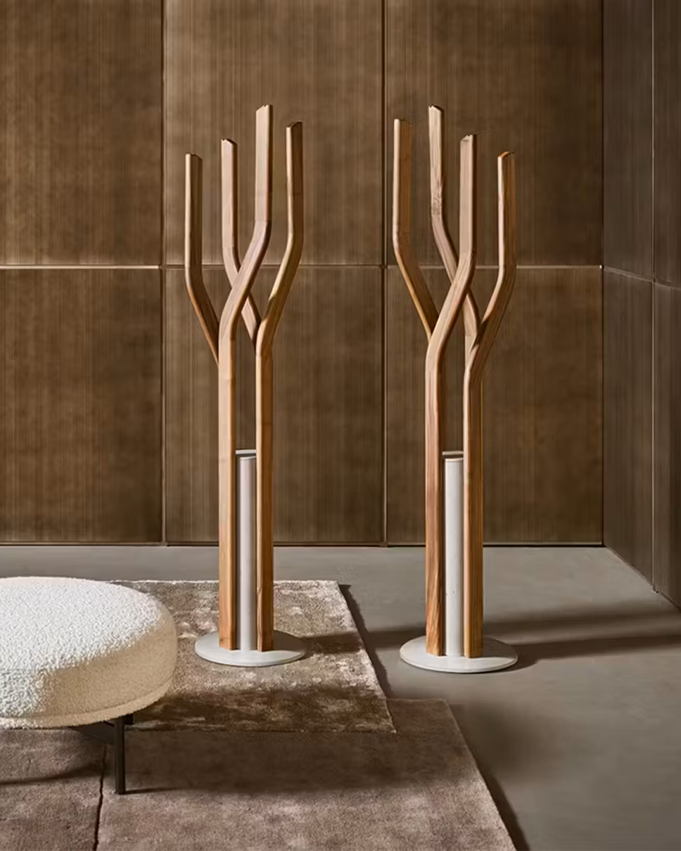 Alma is an elegant floor-mounted clothes hanger that draws inspiration from the fascinating world of plants, whose natural vitality it evokes through rigorous formal research. It consists of a concrete base on which the four solid wood stems with geometric profiles stand in contrast and which come in different heights. Thanks to the different orientations and sinuous lines, a highly dynamic spiral effect is created, in which the concrete base acts as a pivot. Alma is an accessory with a sophisticated and elegant personality that becomes a totemic presence, ideal for “enlivening” both residential environments and accommodation facilities.