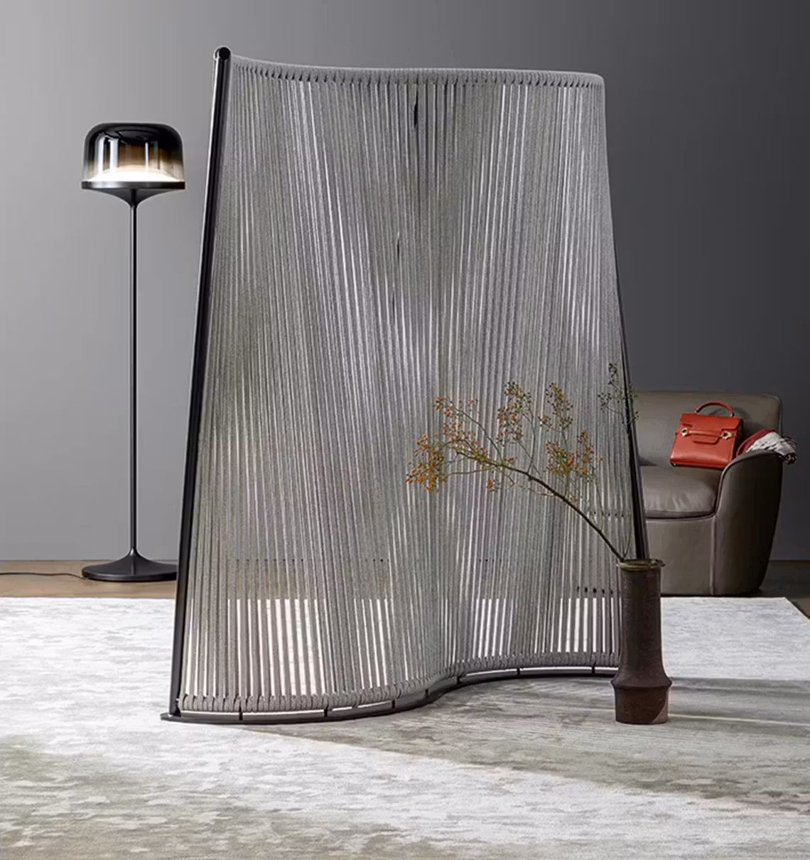 The shape of the Wave screen is inspired by the gentle movement of waves on the sea. With its curved metal frame and divider made of sand-coloured braided rope, Wave outlines and separates the space, rewriting the boundaries of the environment in which it is inserted and creating ever new scenography depending on its position. With Wave, the screen becomes a work of art that creates privacy without weighing down the room.