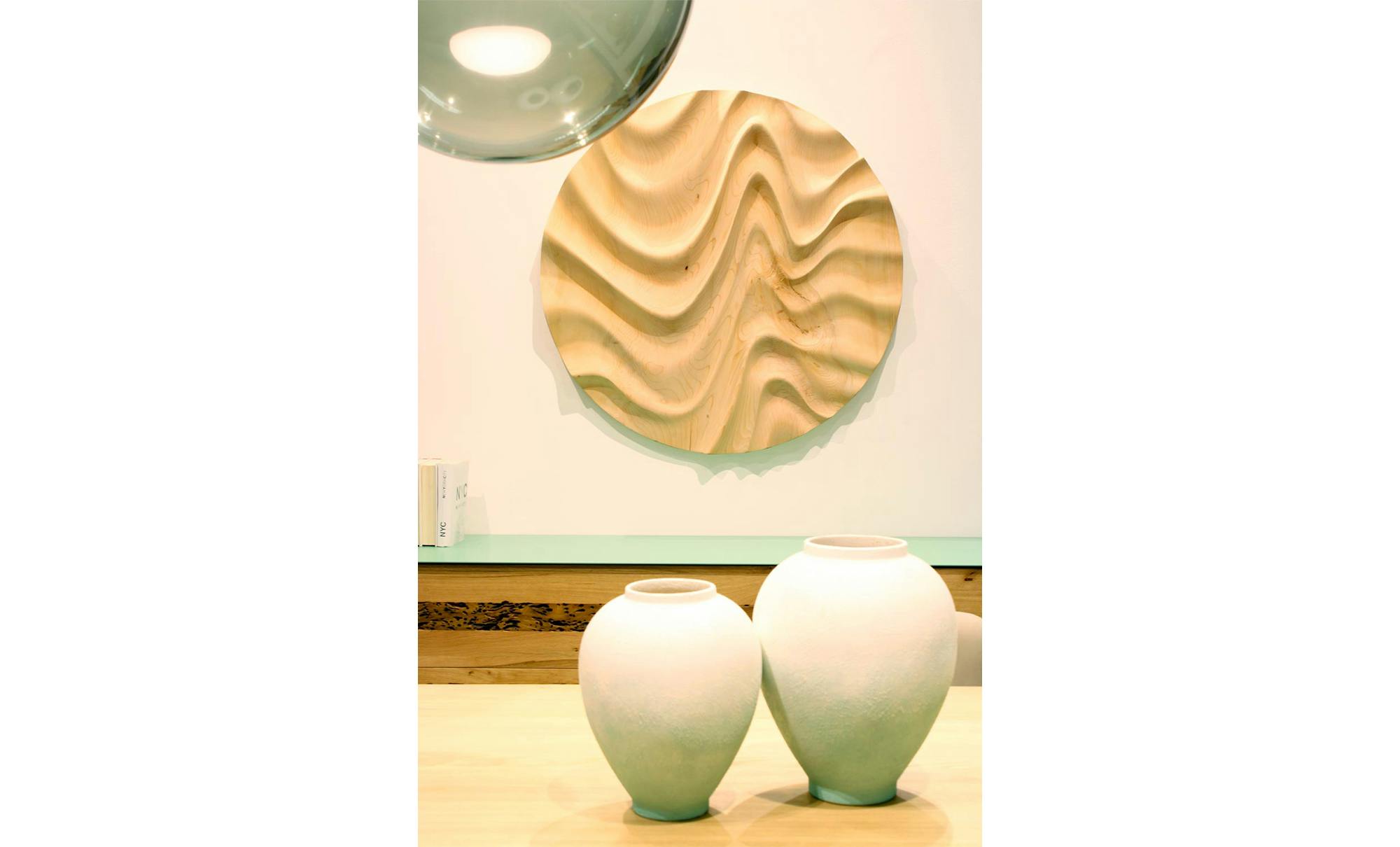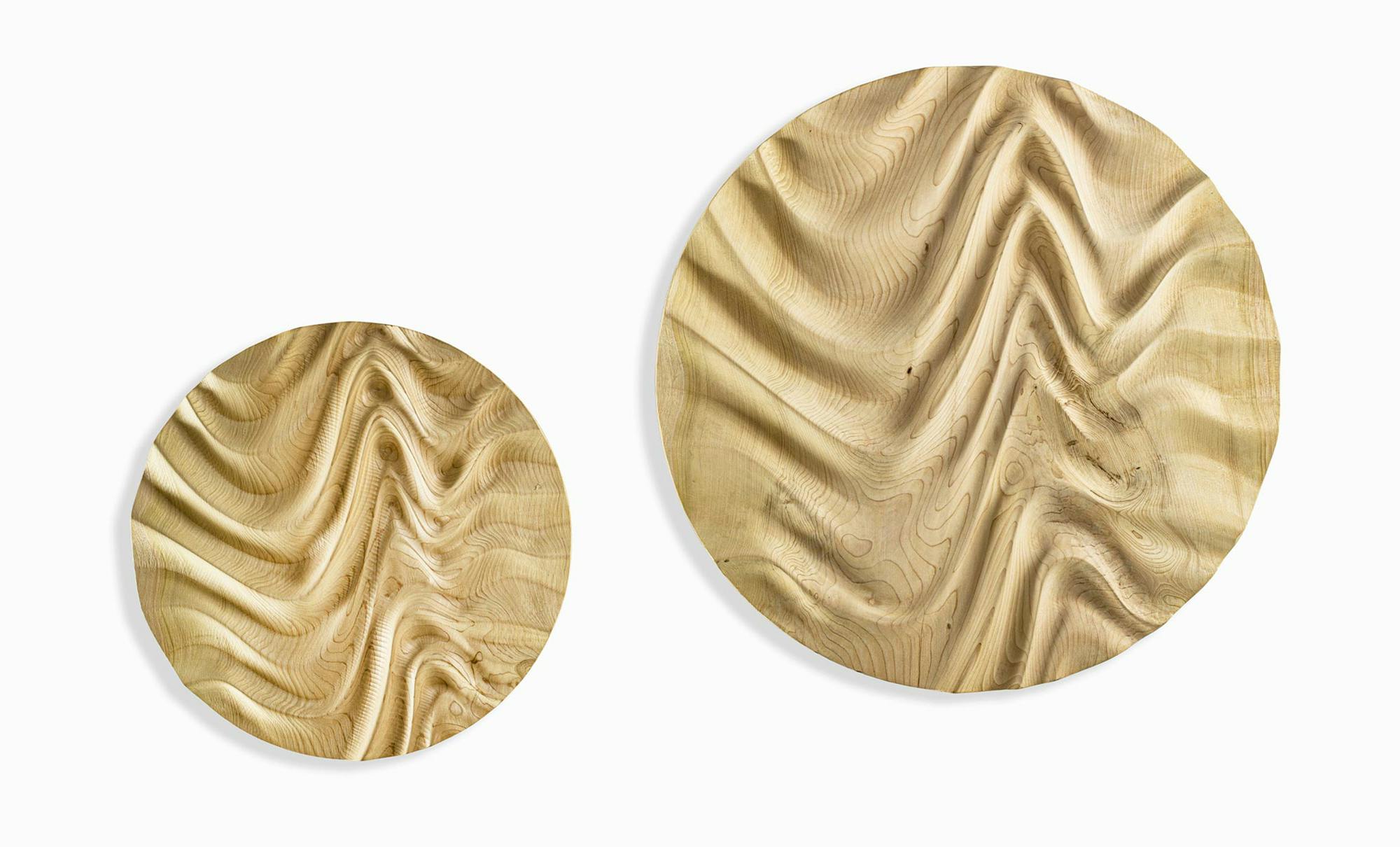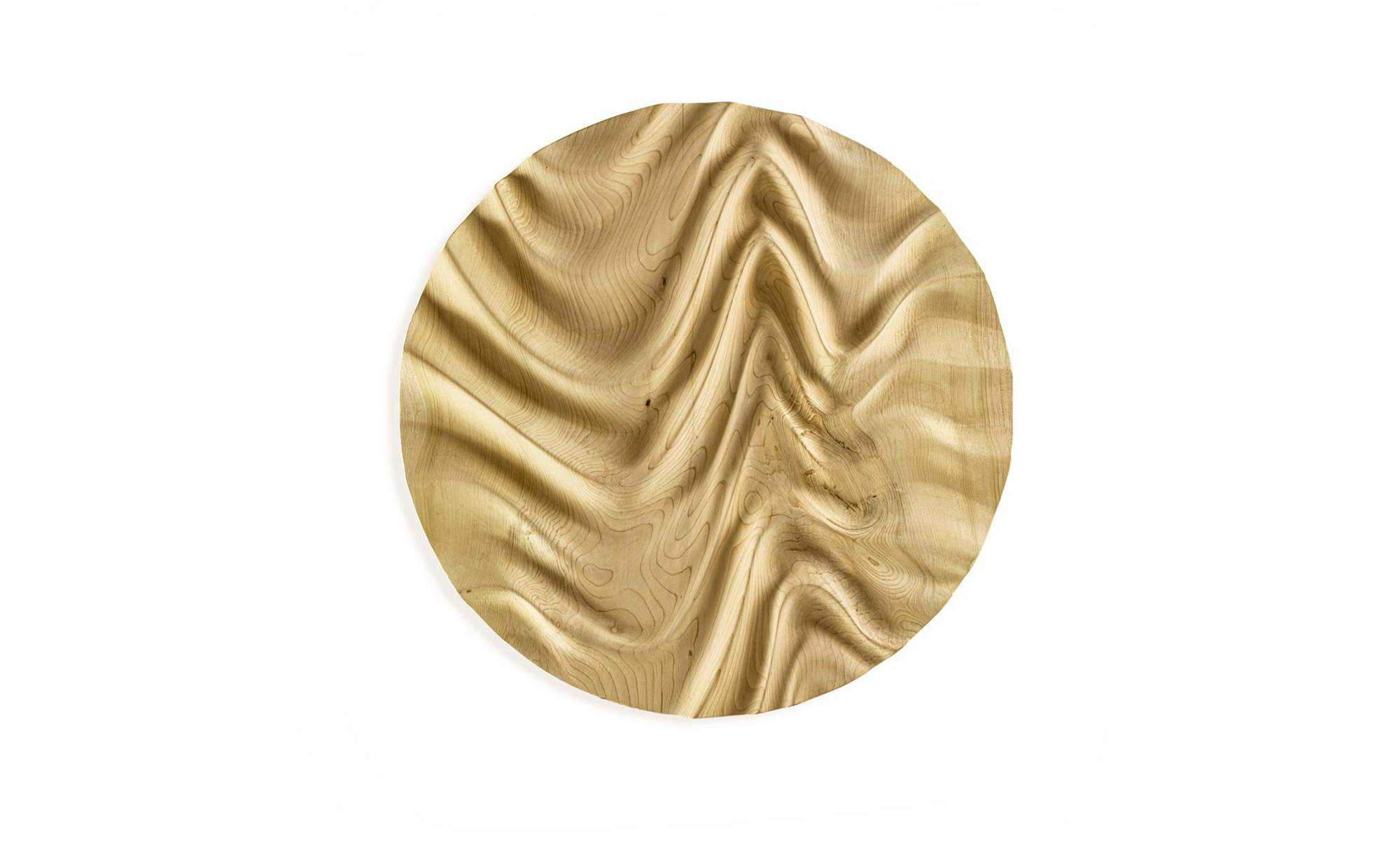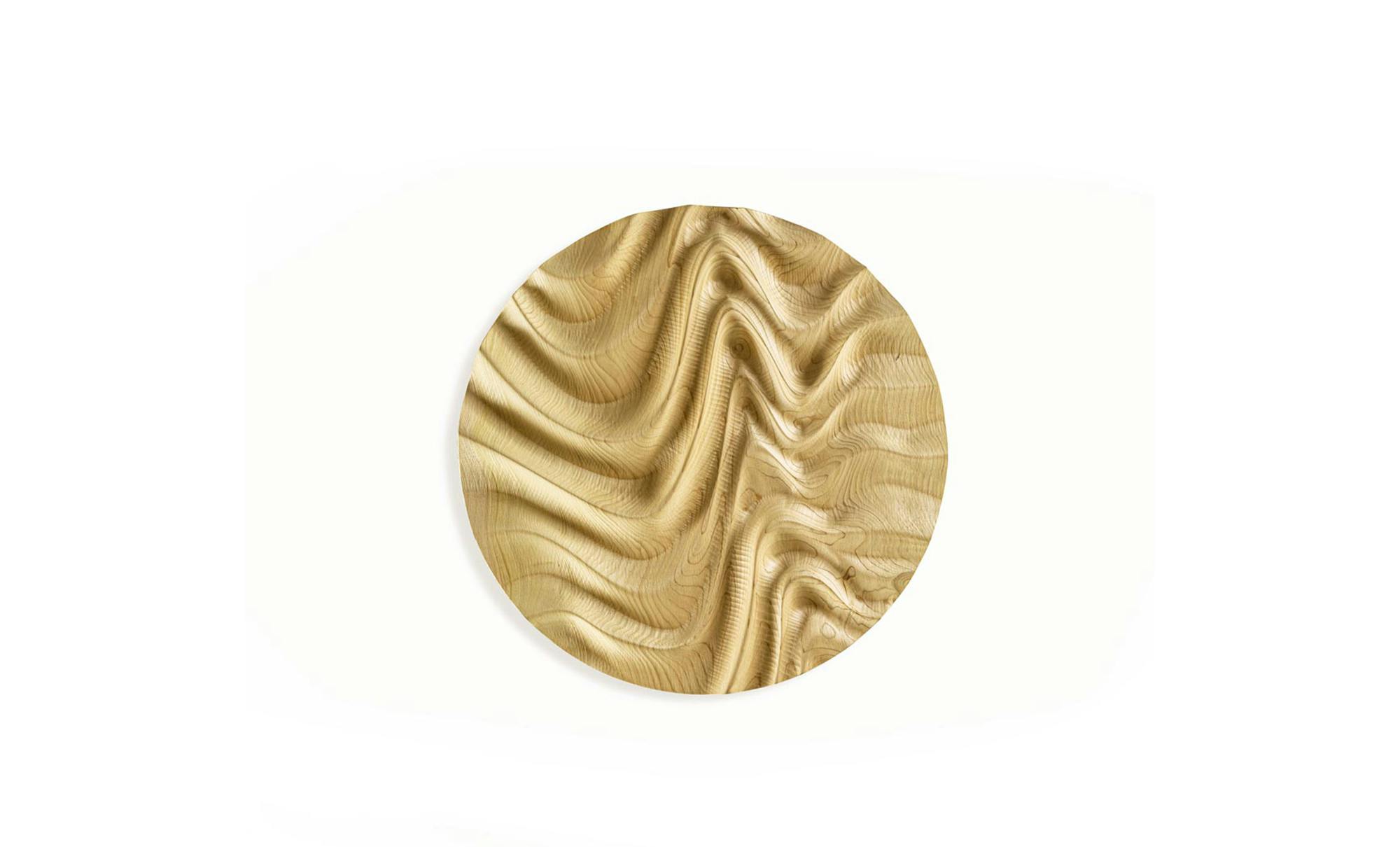 Sculptural wall decoration in Cedar solid wood with glued slats. The sinuous raised lines create an original, refined game of volumes and geometries, expressing all the uniqueness of an art that lets itself draw inspiration from the thousand shapes of nature.
