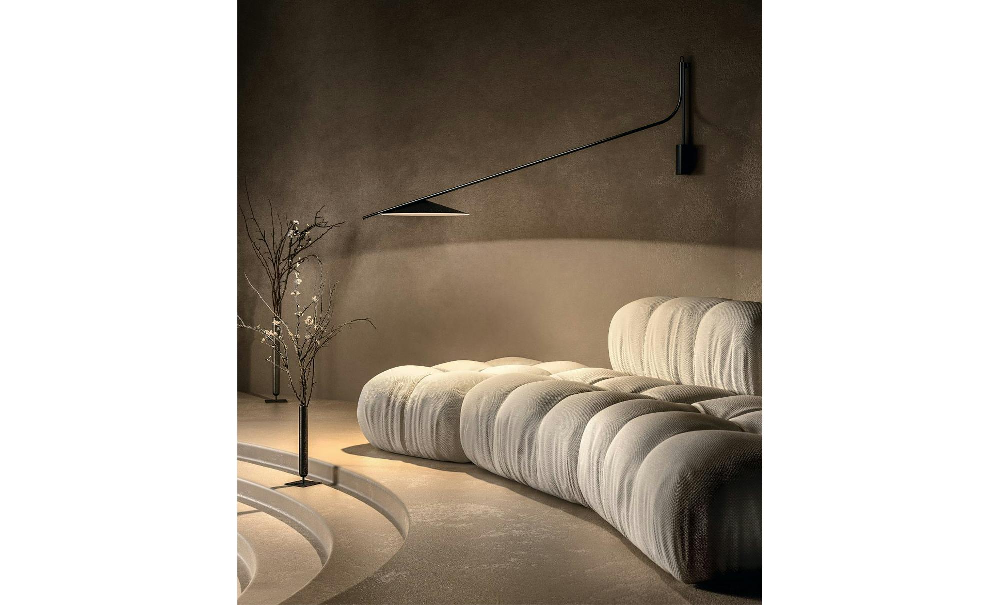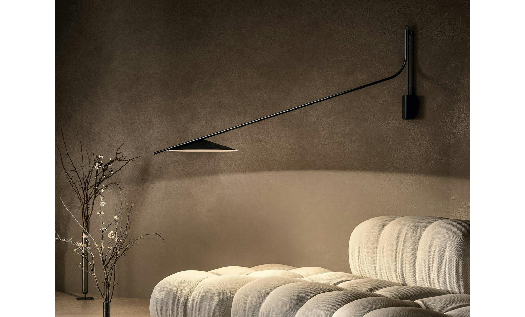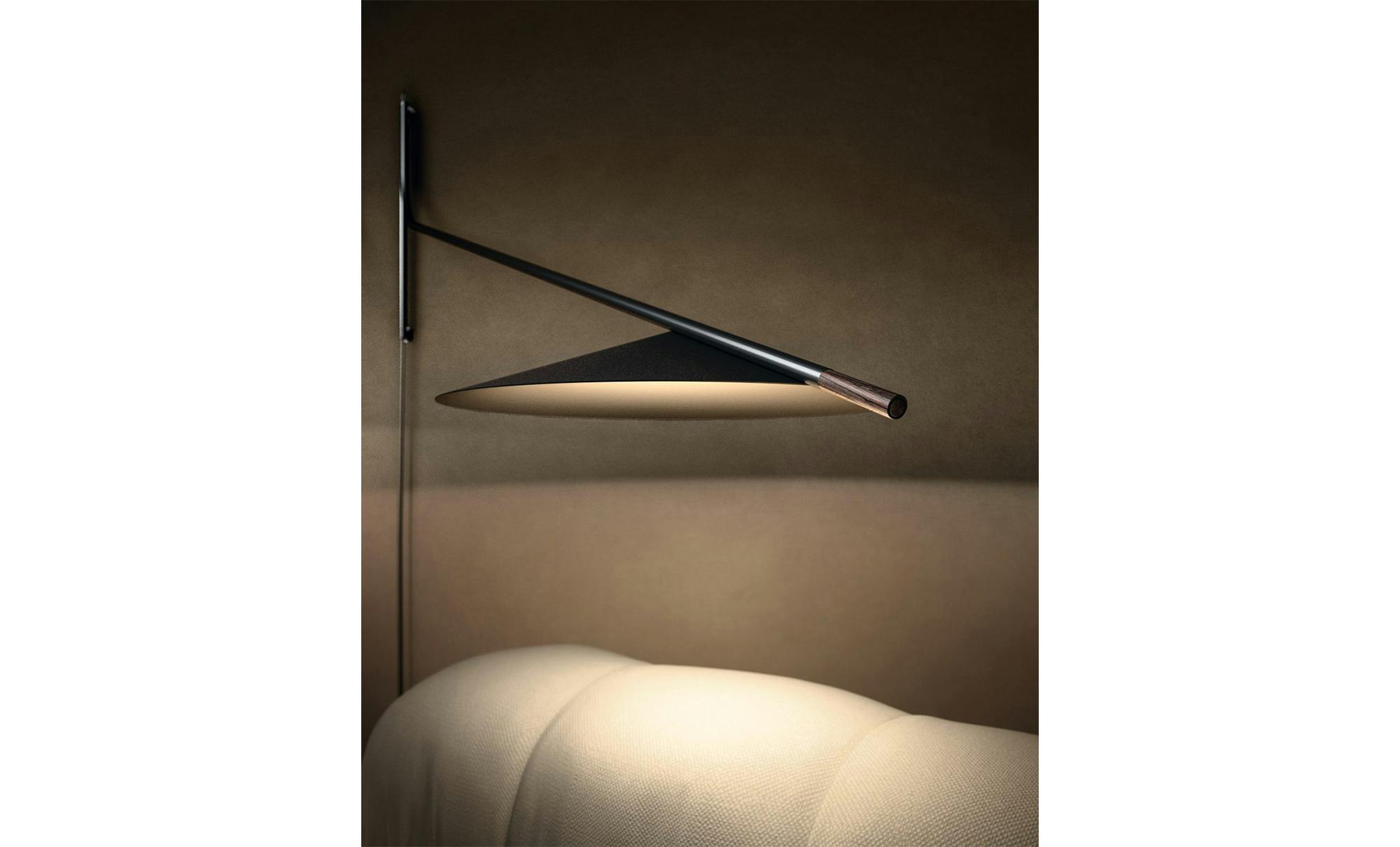 The Glifo wall lamp comes from a drawing of two lines that, like a typeface, define its space. A vertical element allows a whole rotation of the lamp, and an oblique element that moves away from the wall defining the opening angle of the lampshade and offering a hold point, with a timber finish, to reposition the lamp and to dim the light.
