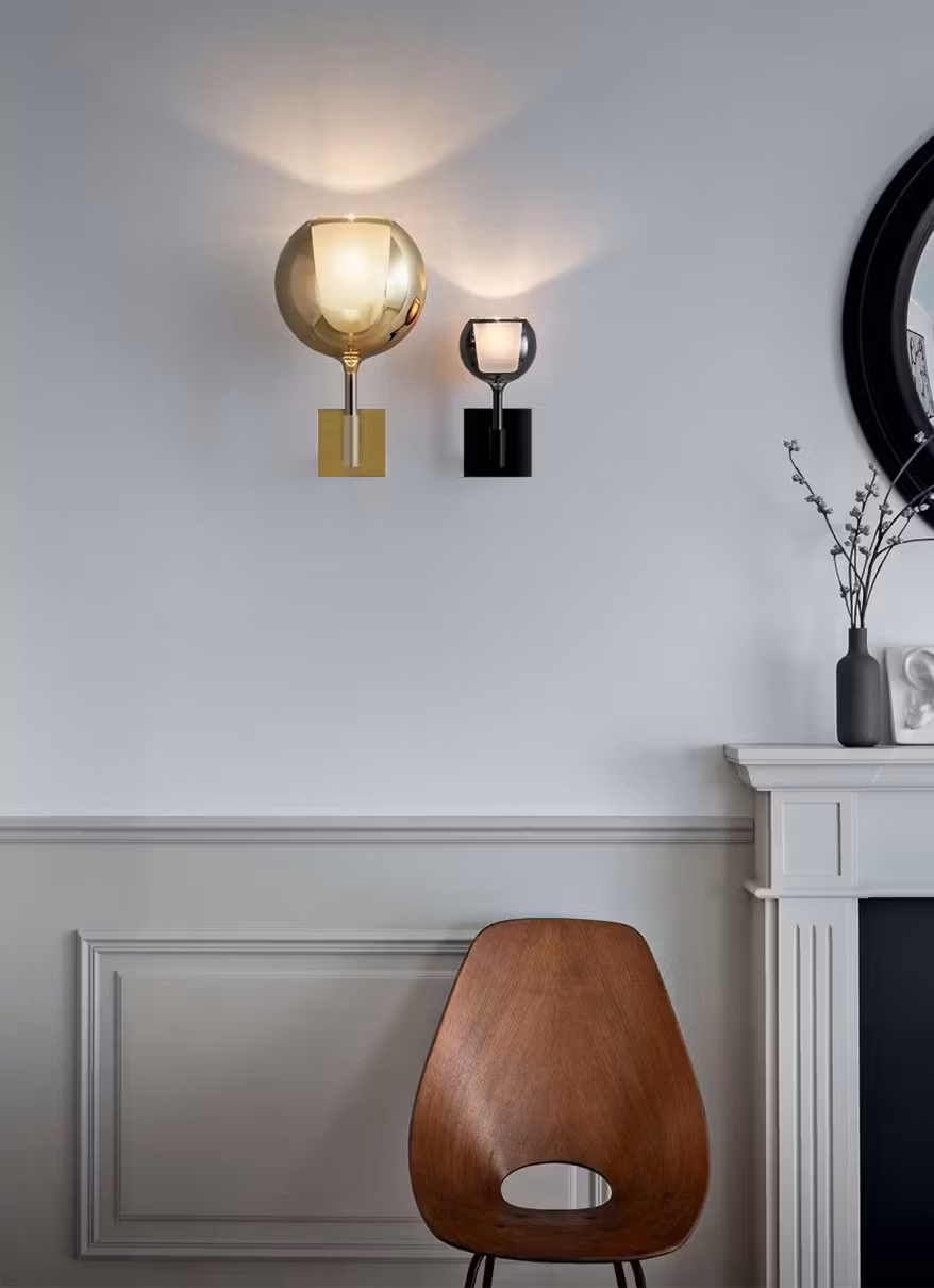 The glo wall lamp features a glass sphere enhancing the glare of light, in a game of reflections back and forth between the lamp and the space or among the very lamps.