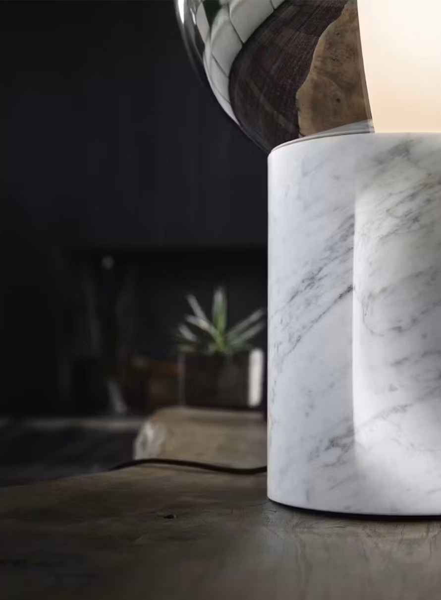 A sculptural lamp formed by a two-coloured spheres in white and silver glass and by a monumental Carrara marble or wood base displaying a 360° turning bicolor blown glass shade. Featuring an integrated LED lamp, the Je suis showcases rich finishings and beauty beyond functionality.