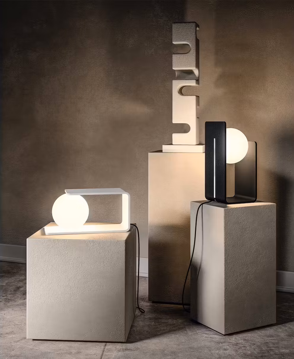 With a simple and elegant design, Morsetto is a parallelepiped void of metal, inside which an illuminating sphere lives as if it were suspended in equilibrium and held tight in a vice.