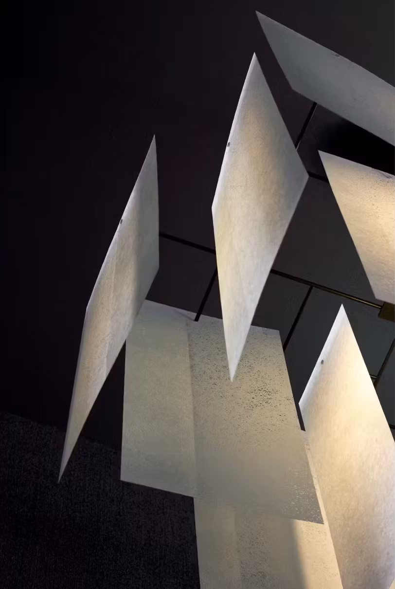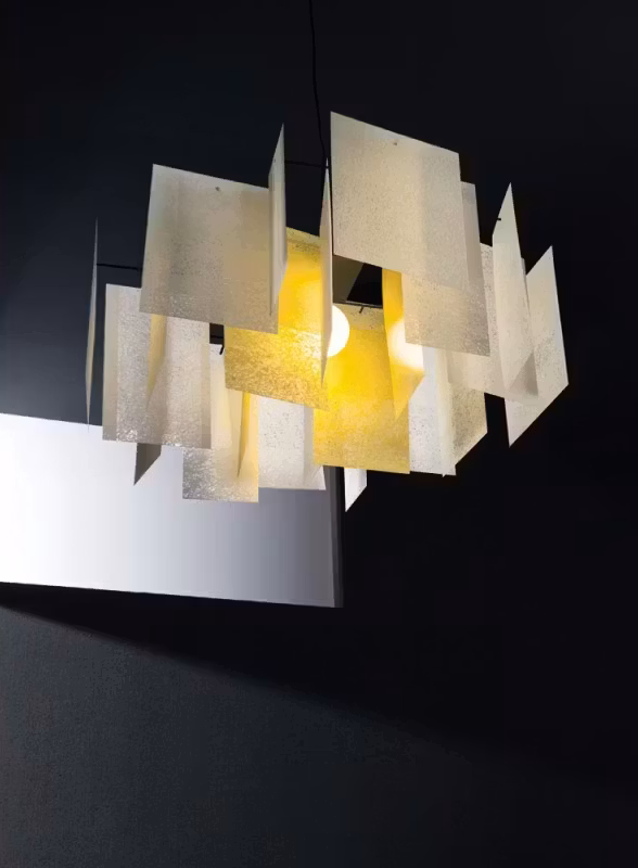 Inspired by traditional Venetian glass lamps, the design of the Alexandra converges into a new lighting concept. By overlapping various thin sheets of glass fiber, with ribs showing through and tracing organic patterns, an exclusive, textural object takes shape. The light then gives a sensation of weightlessness and presence at the same time, whilst the choice among different colors adds personality and potential to the design. A new concept of lamp, created by overlapping thin fiberglass sheets, giving rise to a captivating light that is both light-weight and transparent. Conceived by Enrico Franzolini, Alexandra carries this design over into the world of contract, using bigger sheets to build a lamp with a powerful theatrical presence, yet one that remains graceful and airy. This version is perfect for large settings such as hotel lobbies, meeting rooms, or dining rooms.