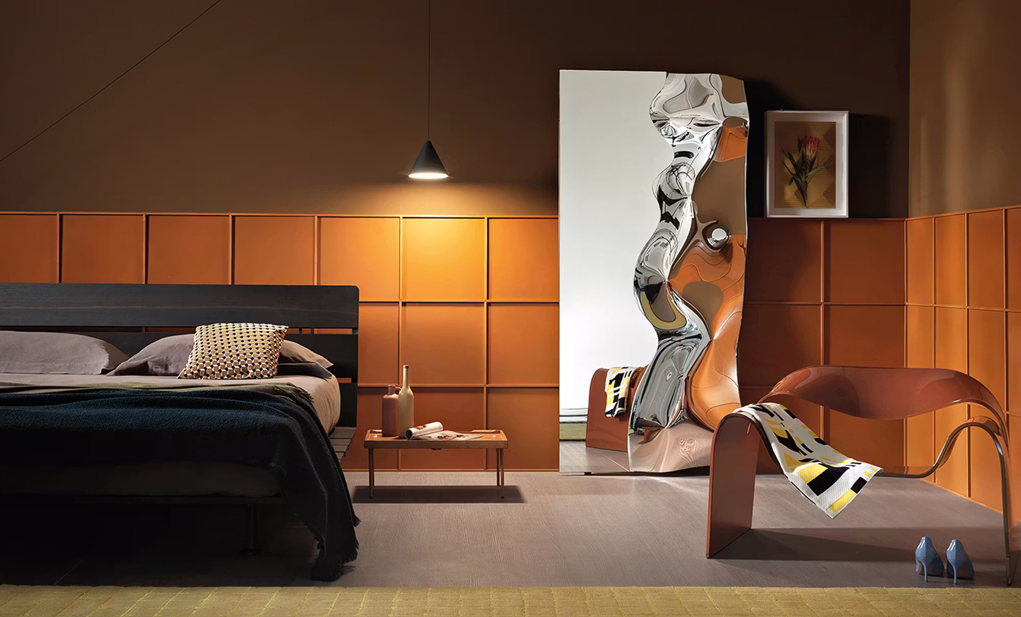 Wall mirror in 6 mm high temperature fused glass, back-silvered. 5 mm flat mirror. Rear frame in painted metal. It can be hung horizontally or vertically.