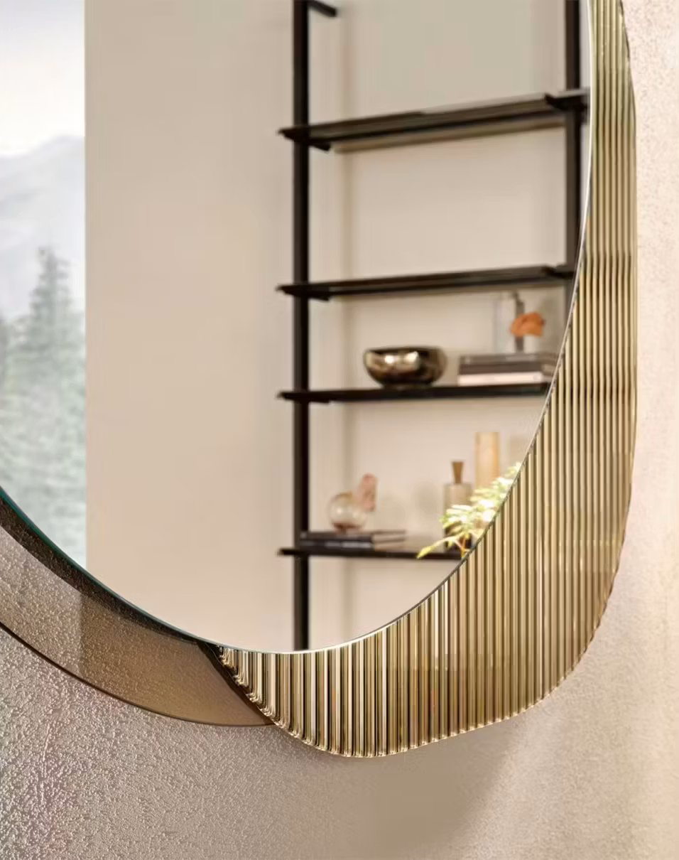 Free-standing or hanging mirror with frame composed of two glass elements: a part in 6 mm- thick high-temperature fused glass in transparent or bronze finish; a part in 6 mm-thick flat glass in smoked or bronze finish. 5 mm-thick flat mirror. Rear frame, in painted metal. It can be hung horizontally or vertically.