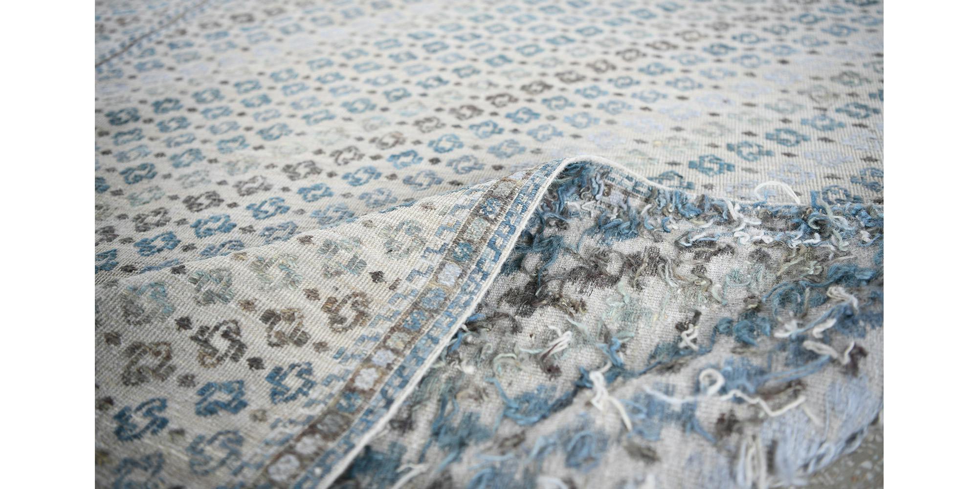Hand-knotted in pure Ghazni wool, the Kalash collection rugs have a wonderful palette of dark reds, ocher, and light blue which, combined with the abrégé effect, give a suggestive, refined and vintage look. Some rugs in the collection feature intense shades of purple and teal in perfect balance with the bright accents in the borders and fields. There are three designs (Joya, Kara and Venta), all passed through a dense repetition of patterns.