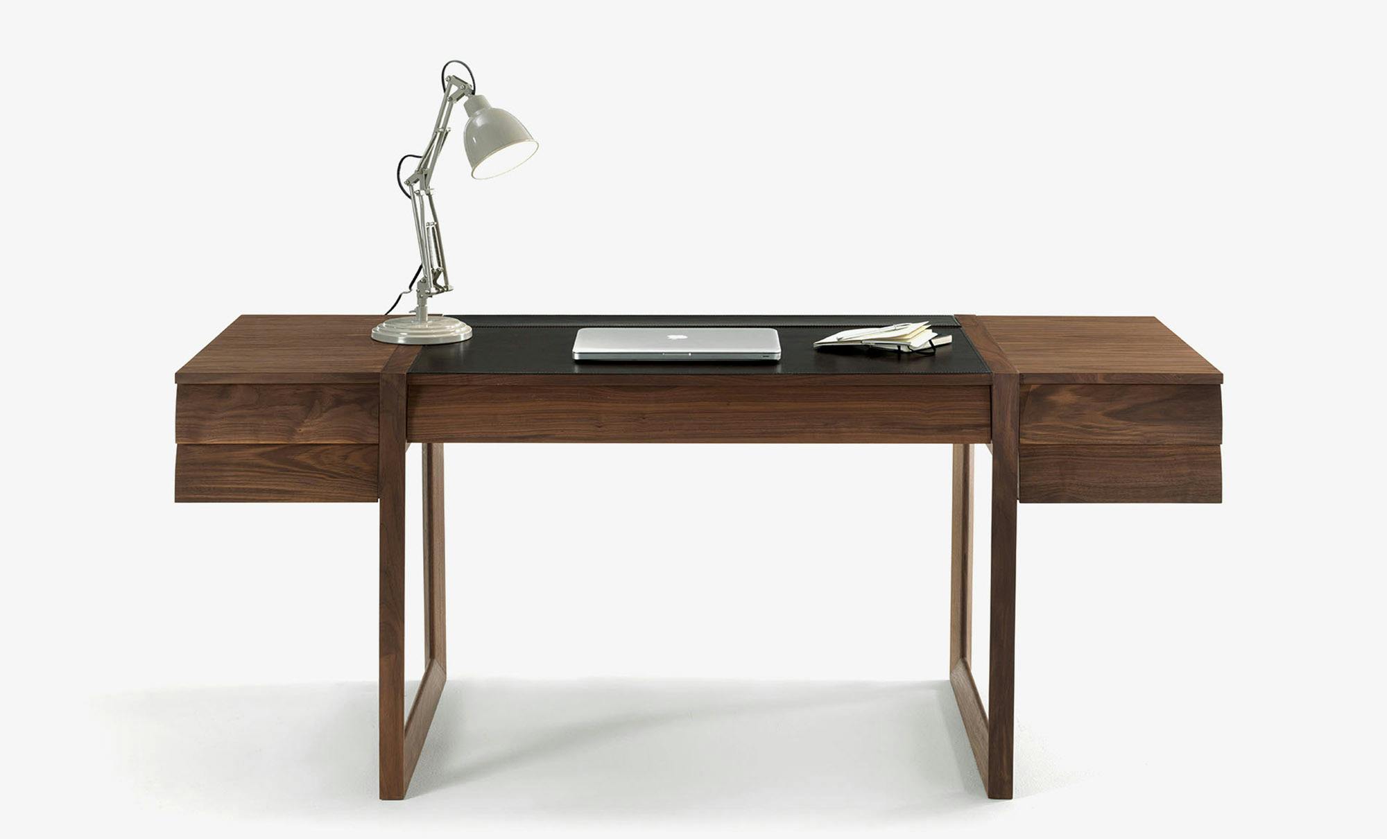 Writing desk with squared lines made from veneered plywood, with assembled drawers with dovetail joints and sledge legs in hardwood.