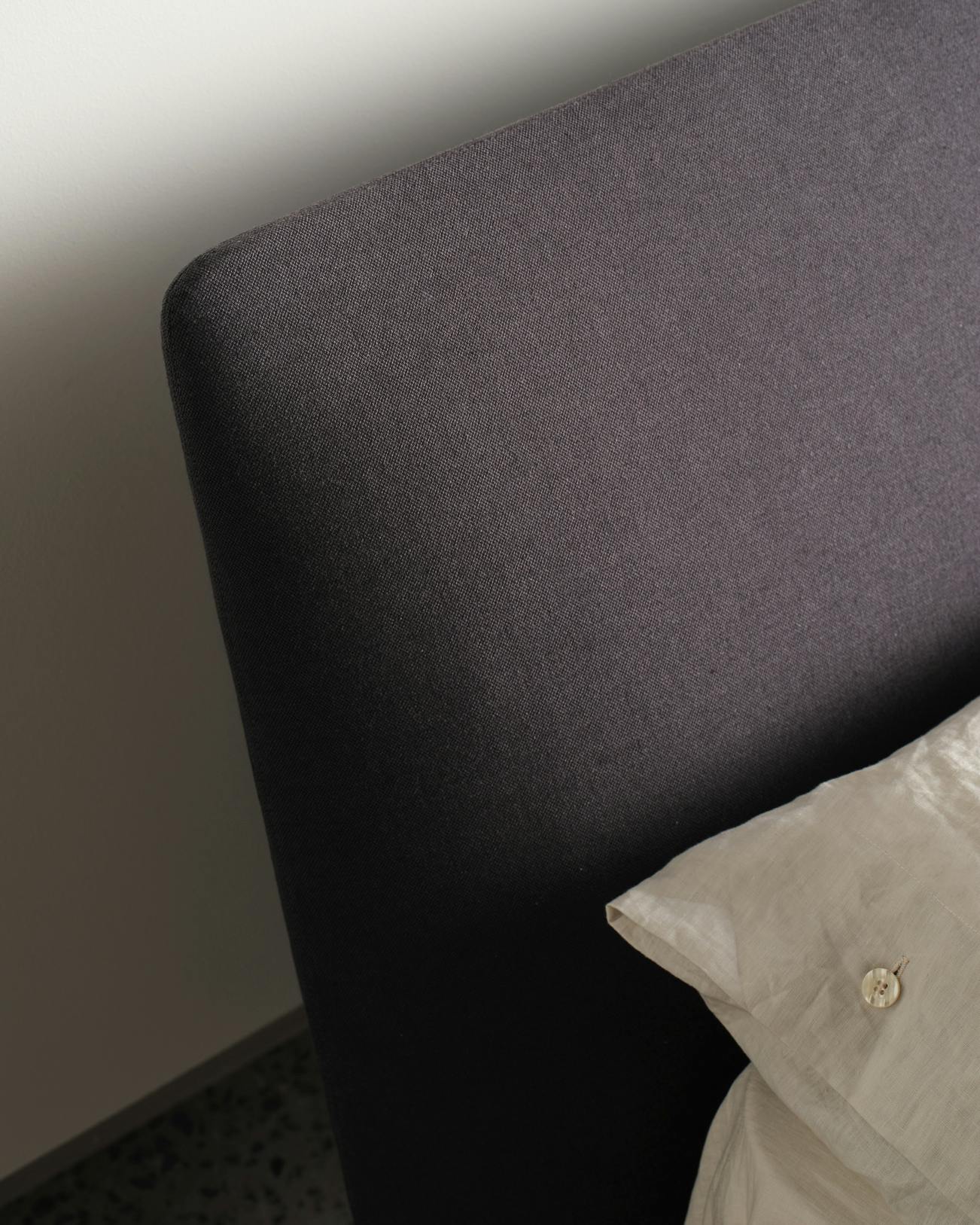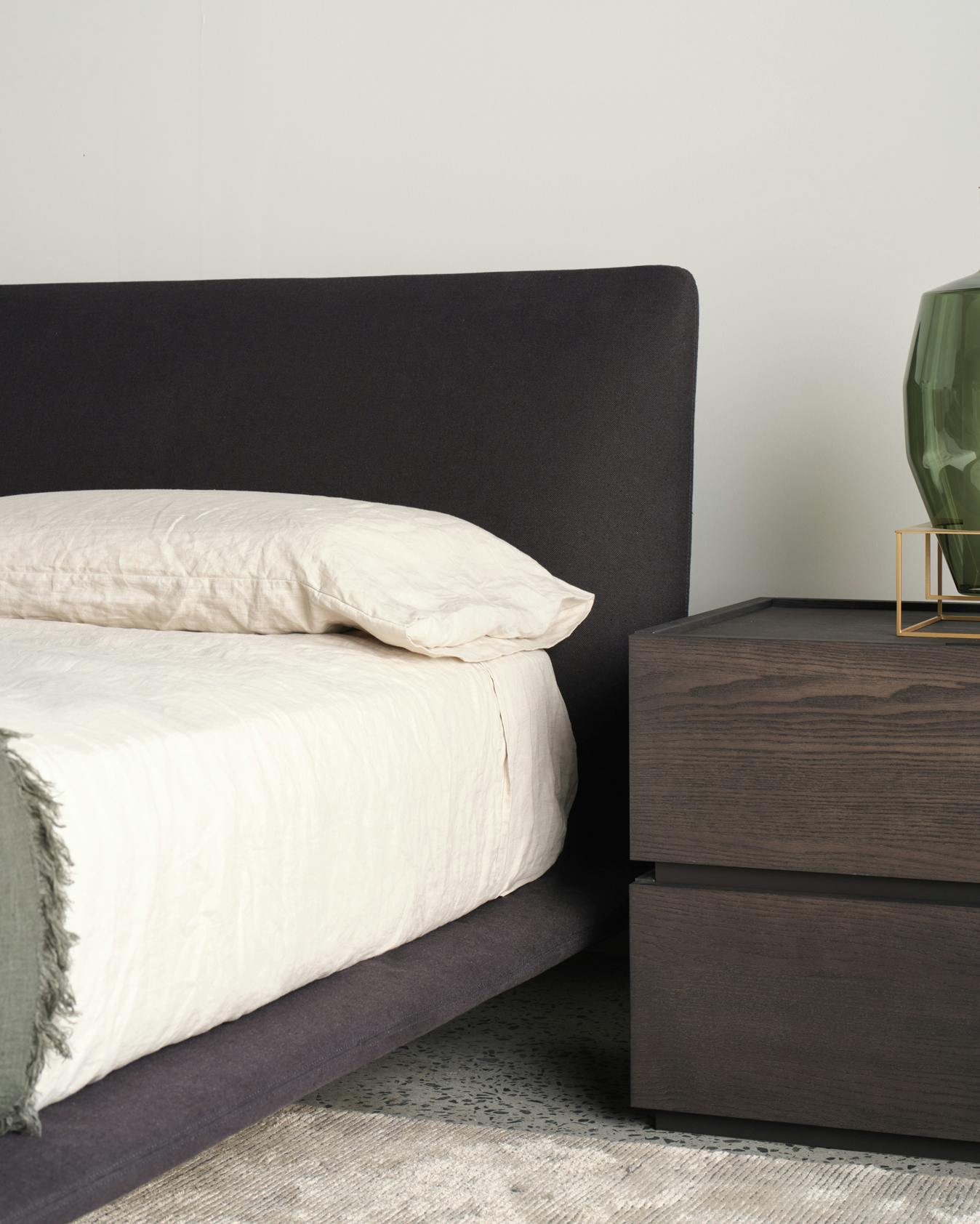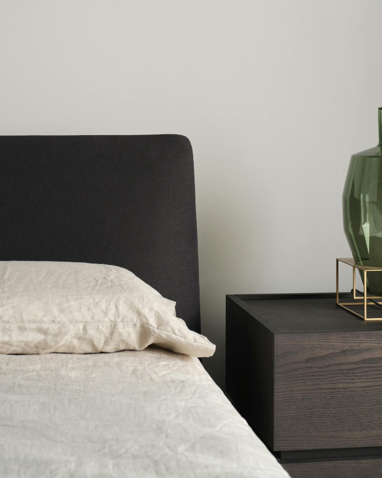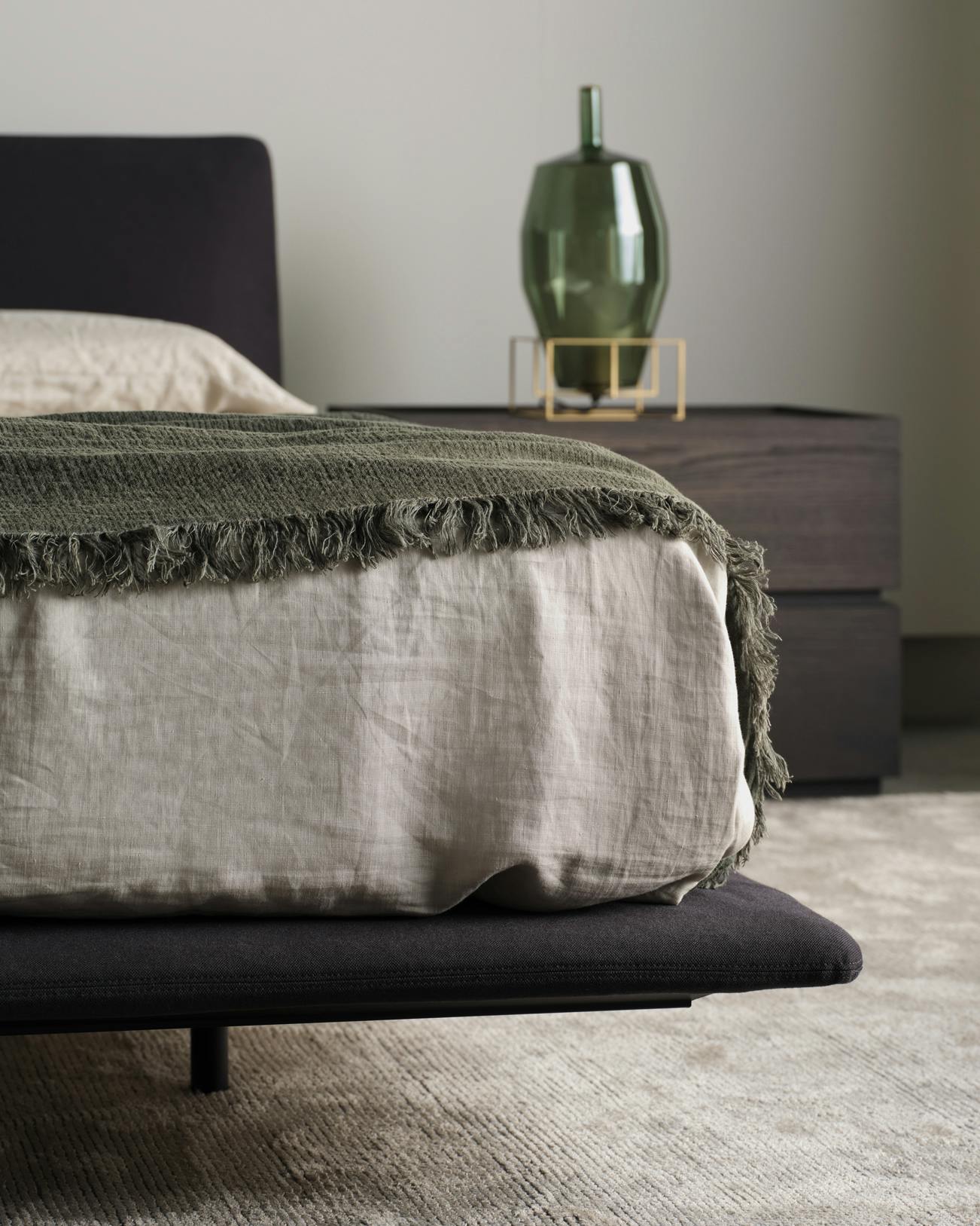 Like a soft horizontal line traced by the wall in the middle of the room, the Legri bed seems to hover in the air, evoking a feeling of suspension and lightness. This is achieved with the feet, which are recessed with respect to the frame, ensuring stability without being noticed. The soft headrest and rounded edges of the upholstered surface enhance the feeling of serenity and calm – in a bed designed for indulging in sleep.