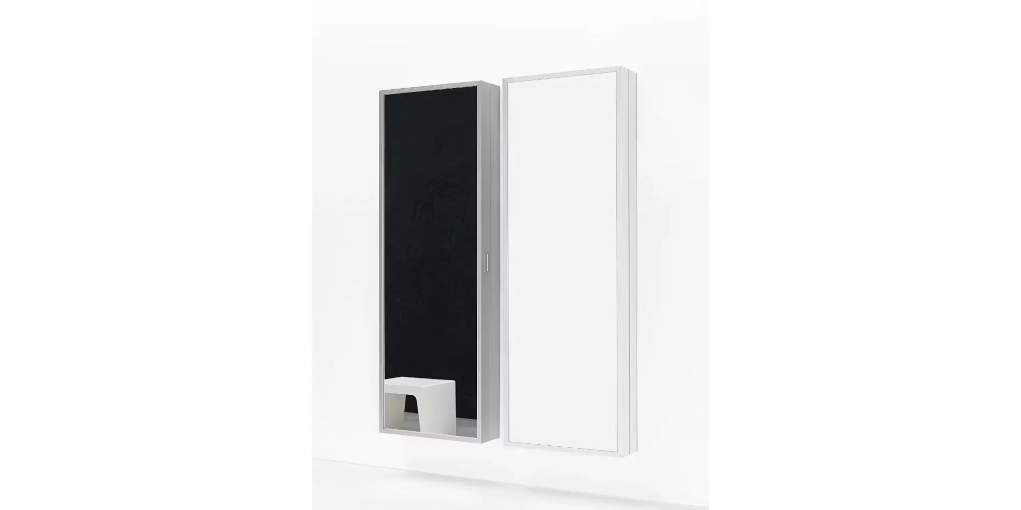 A collection of large rectangular mirrors, which can be positioned horizontally or vertically to add more depth, charm and light to home or commercial areas. Its large mirror surface is recessed in relation to its simple geometric frame in drawn anodized aluminium, providing an additional perspective effect.