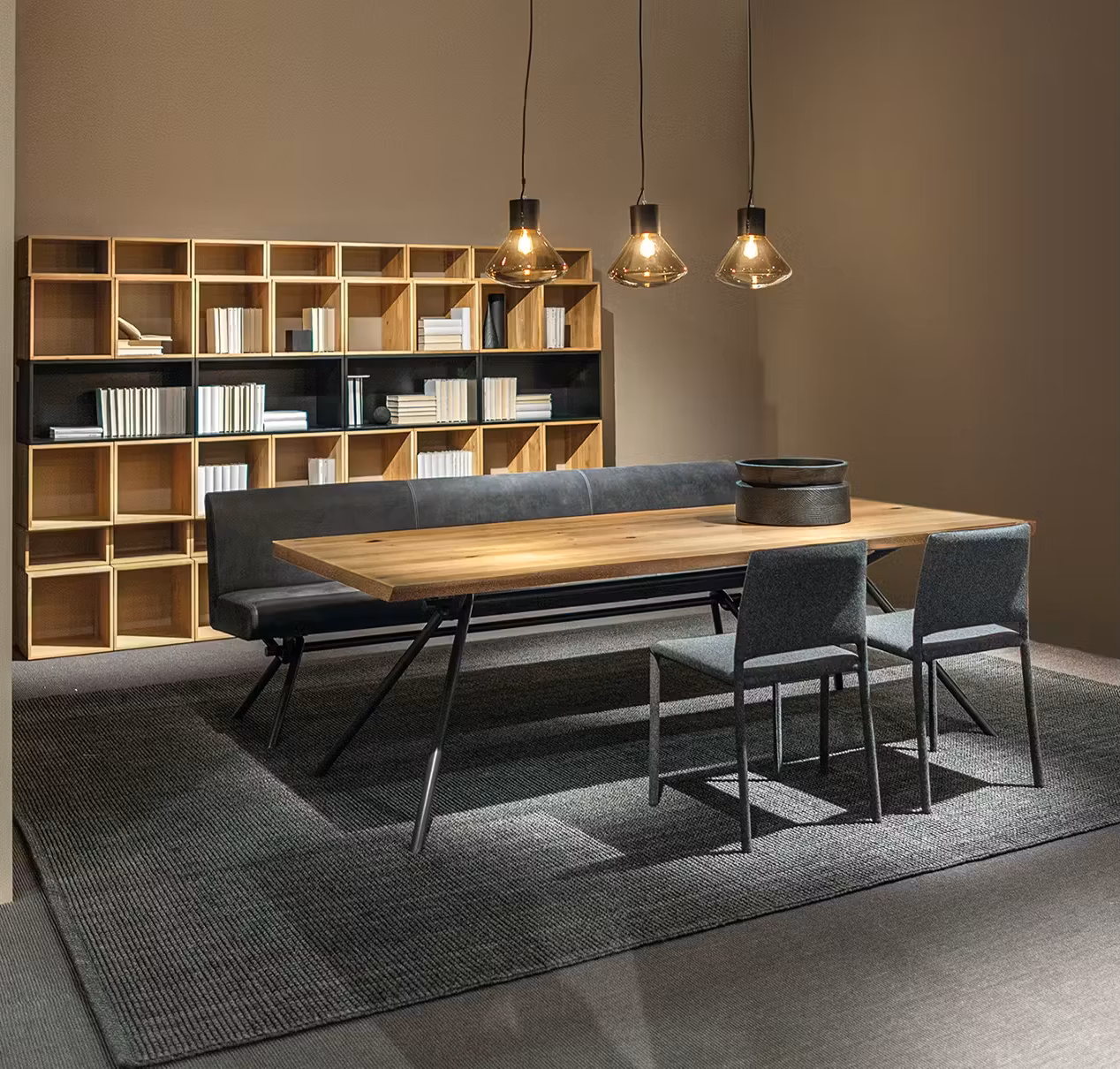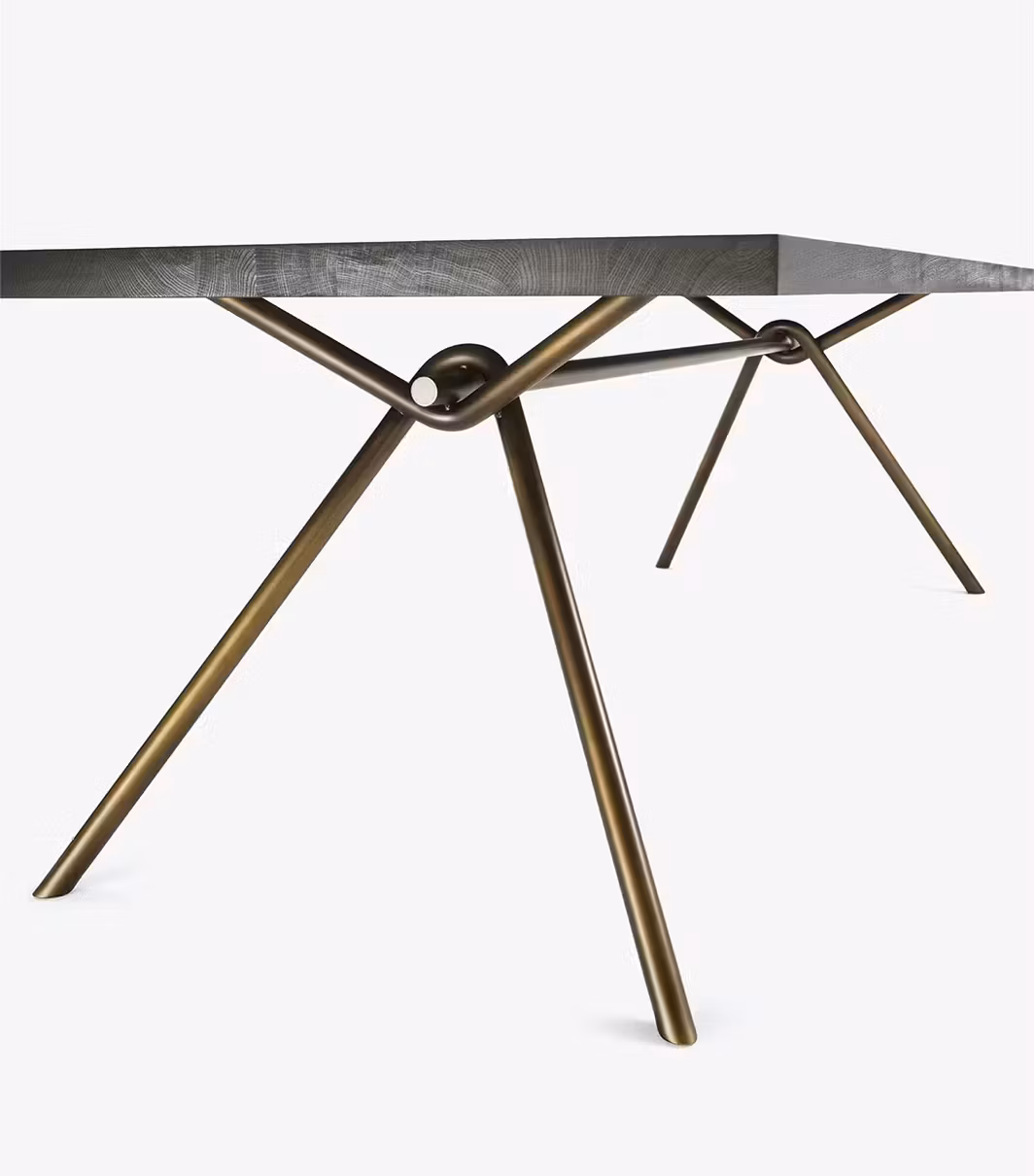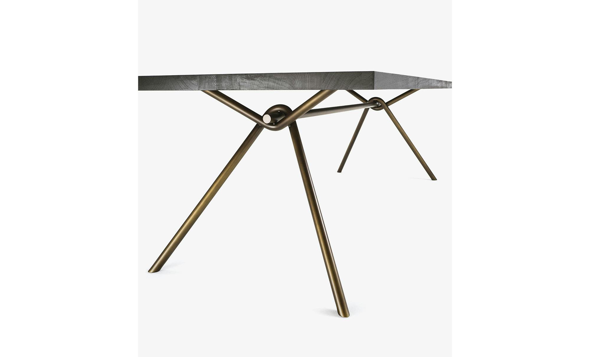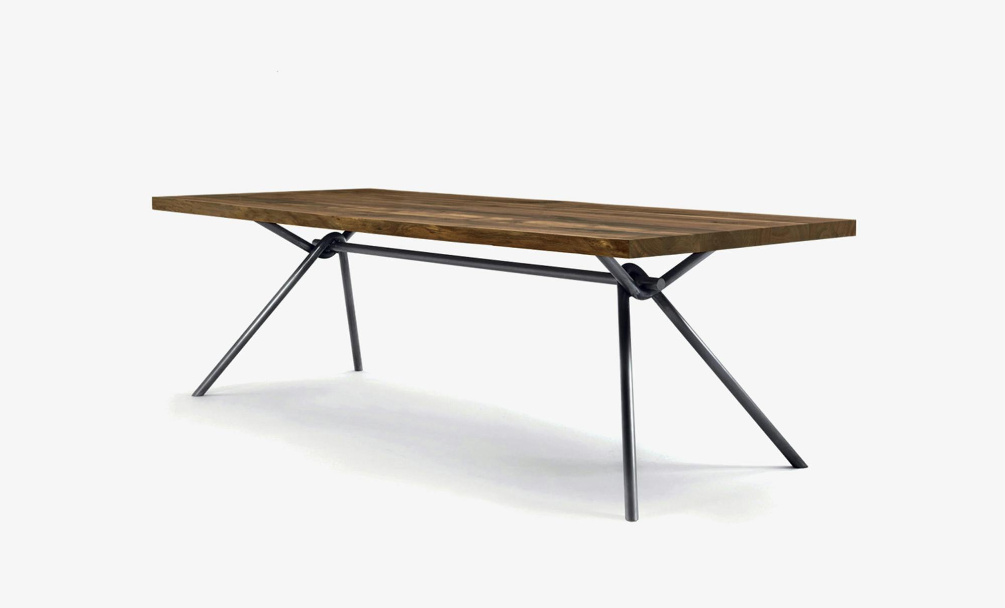 Table with top in glued solid wood boards, available with squared or natural edges, combined with a basic and linear base made of intertwined tubular iron.