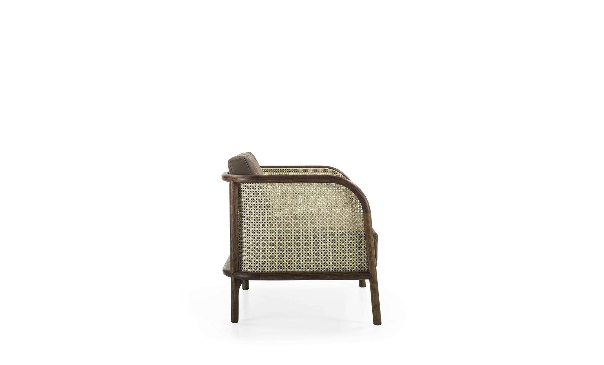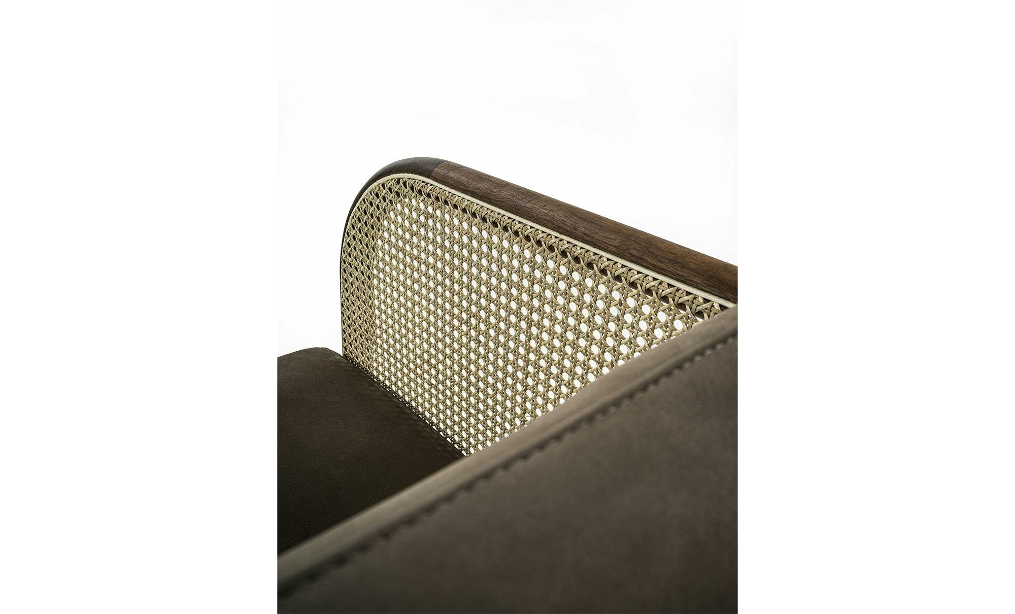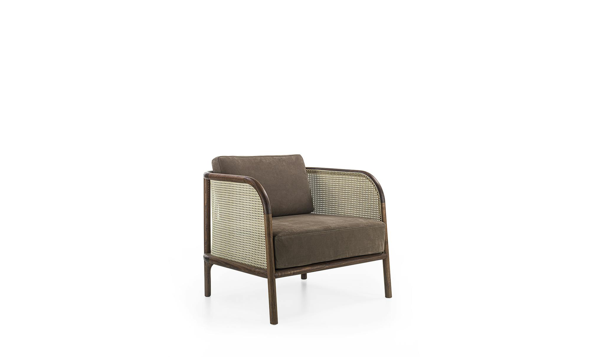 Armchair with a solid wood frame, featuring a curved backrest adorned with a Vienna straw finish and a comfortable upholstered seat, covered in leather or fabric. It also comes with two backrest support cushions matching the seat finishing.