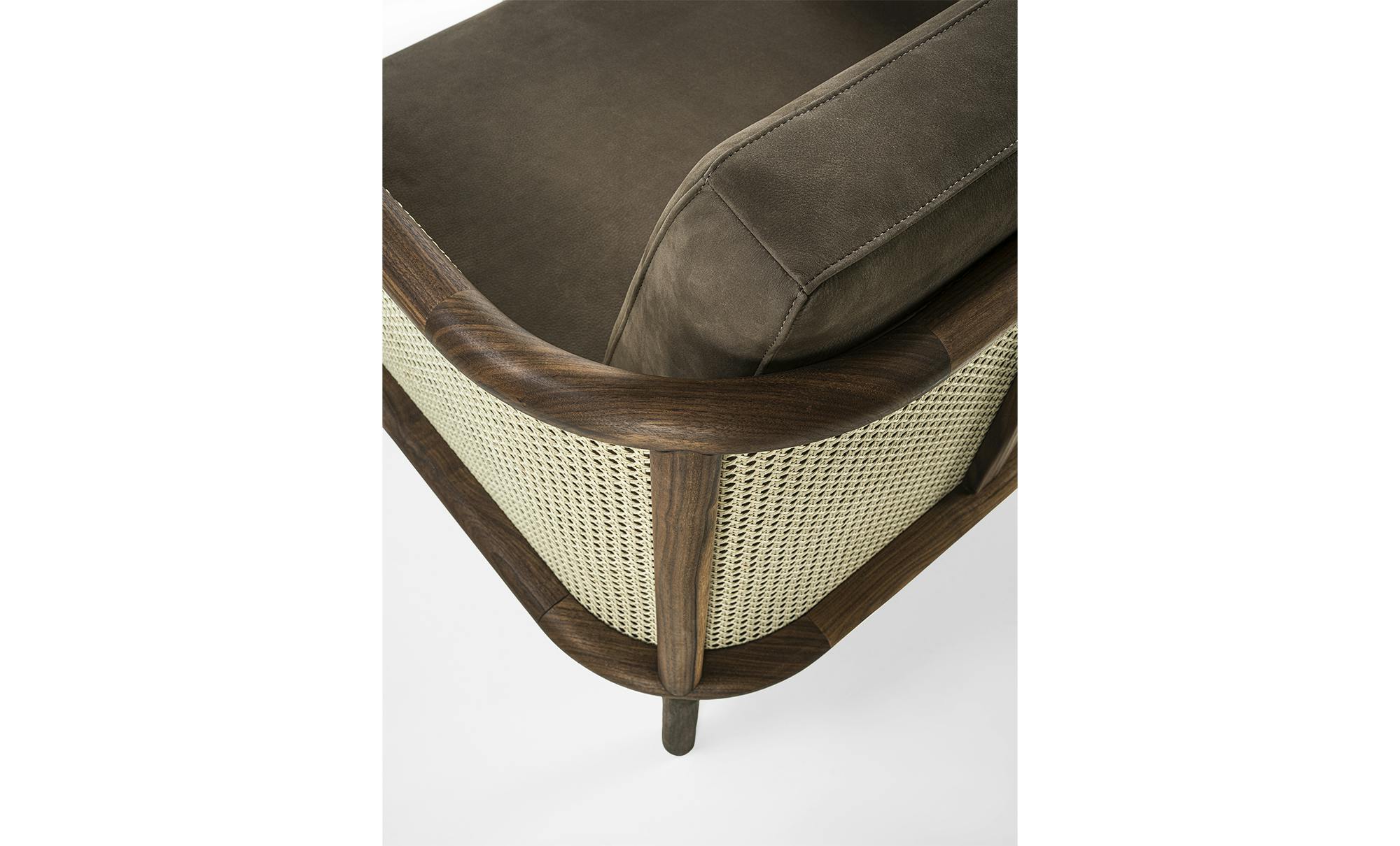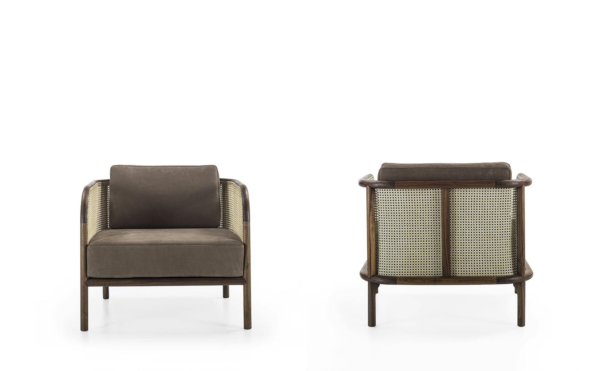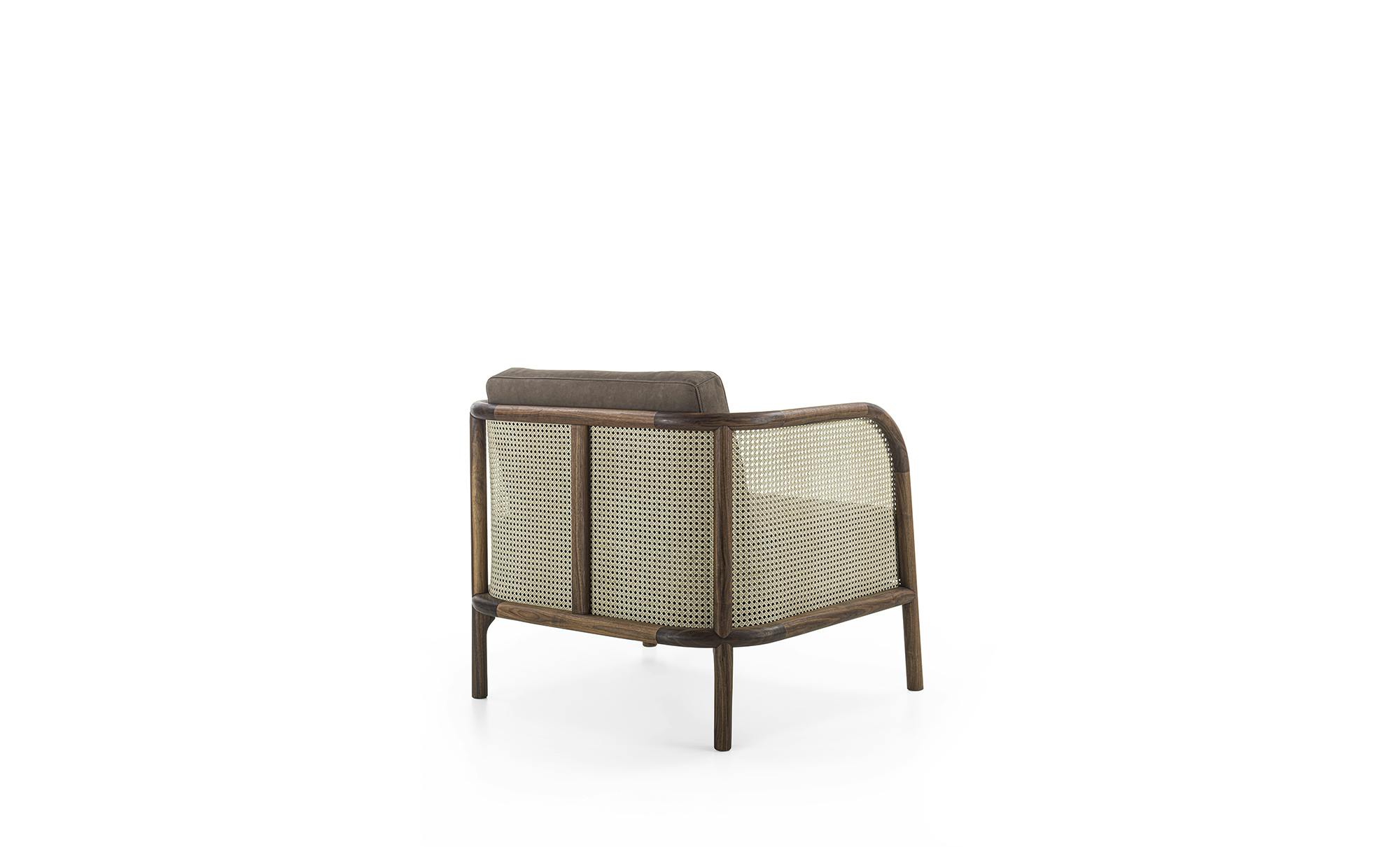 Armchair with a solid wood frame, featuring a curved backrest adorned with a Vienna straw finish and a comfortable upholstered seat, covered in leather or fabric. It also comes with two backrest support cushions matching the seat finishing.