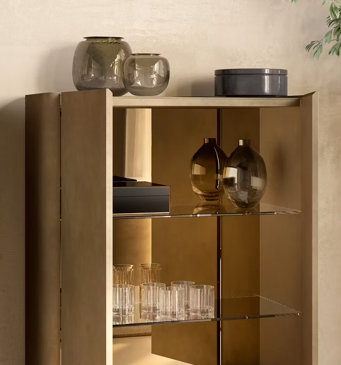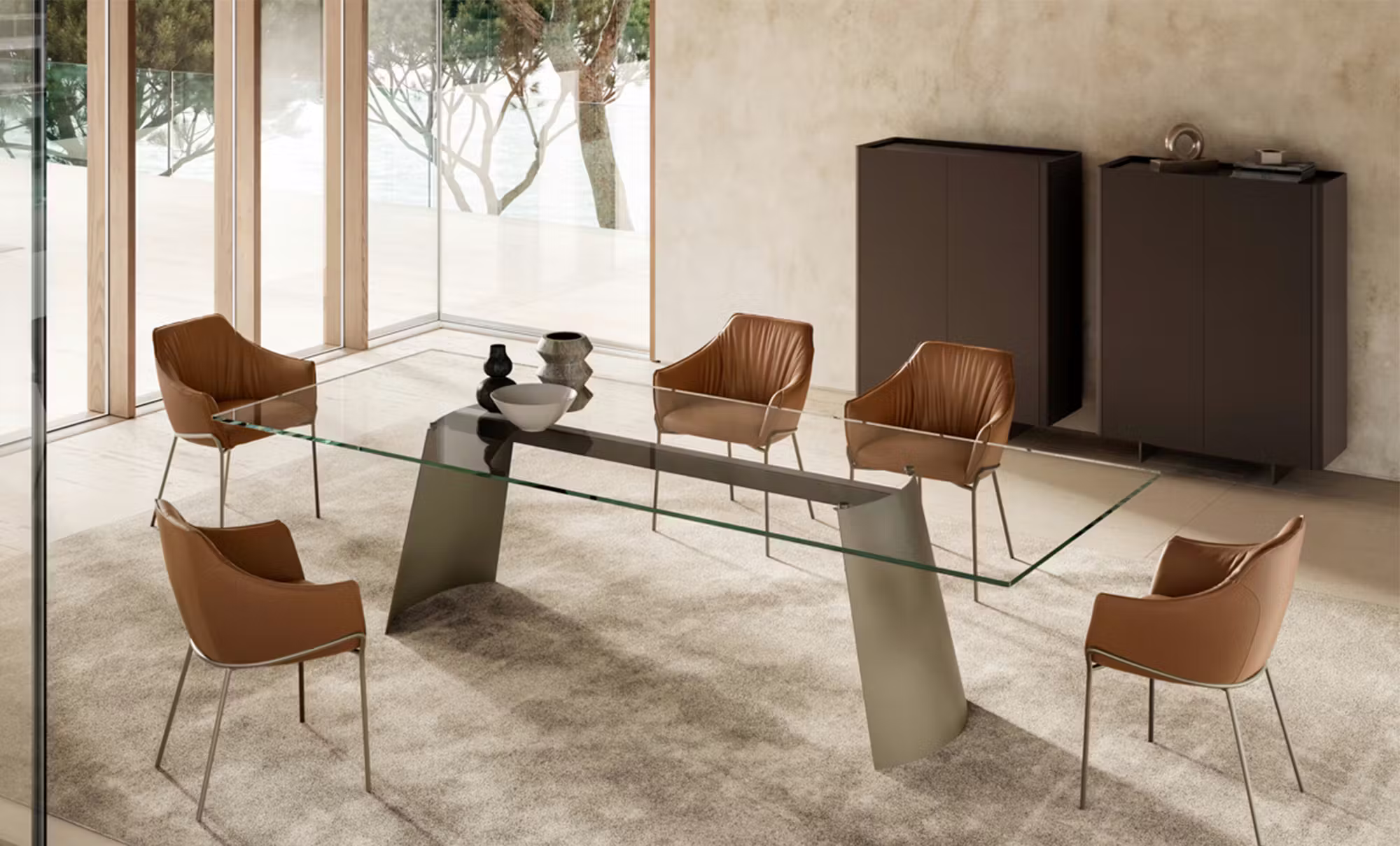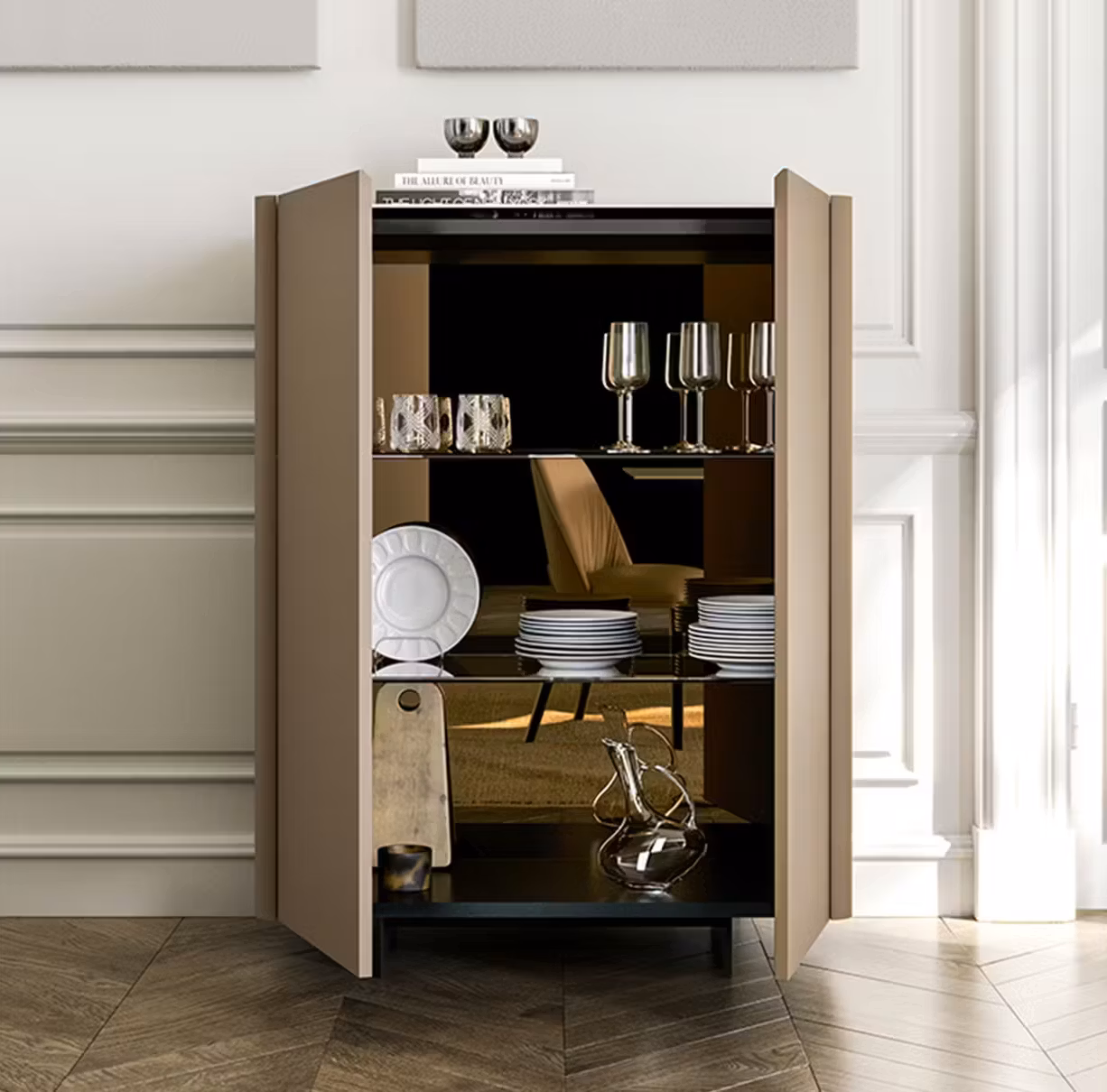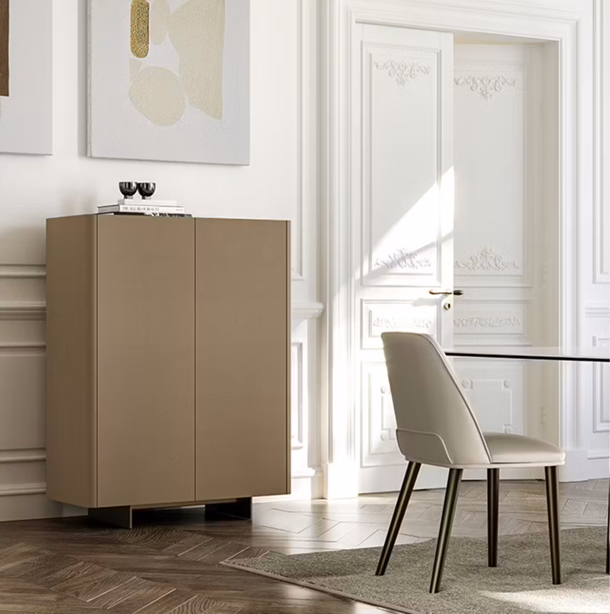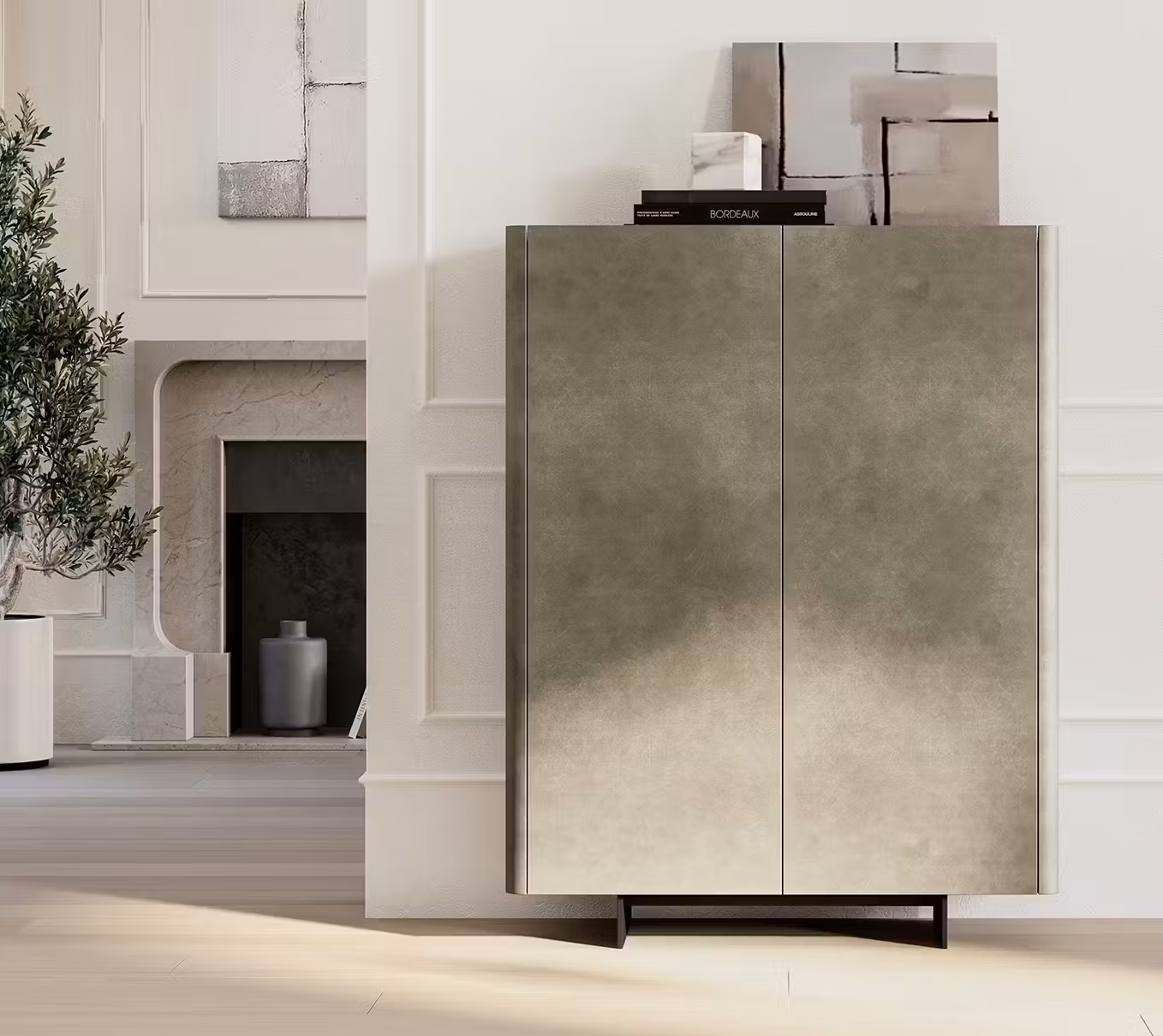 Alma is the contemporary cabinet with quilted doors with a modern and essential style. Designed by designer Antoy Filips, the Alma has been designed in two different sizes to adapt to everyone's space and needs, and is available in a sideboard version with 2 or 3 quilted doors. This designer sideboard is supported by four feet in V01 black painted metal, the structure and doors are covered in leather, eco-leather or econabuk, while the shelf is in veneered wood or ceramic. It perfectly covers the storage function for which it was designed and hides smoked glass shelves inside, where you can store and safeguard your personal objects. In the two-door version, Alma High, necessarily fixed to the wall, will find an interior with a bronze mirror. This modern storage solution is the ideal furnishing accessory for decorating the entrance hallway or the walls of the living room or dining room. Also available in the version without quilted doors: the Alma sideboard.
