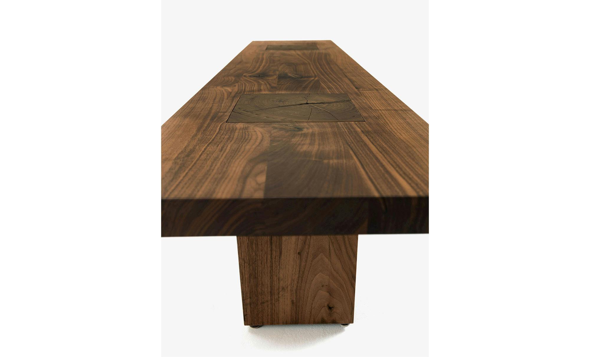 The Boss Executive bench, designed in Italy and made for Riva 1920, is made of wood, featuring a strong and bold design with legs that cross over the seating board, each placed to reflect the sections of the tree trunk. Cracks and splits in the table legs are an organic feature and typical of wood as it ages.