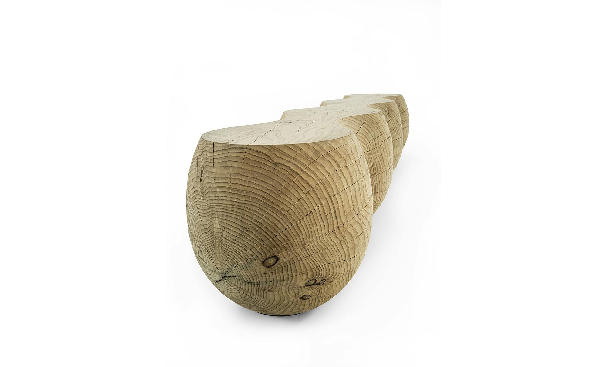 This bench, made from a single block of solid cedar of Lebanon wood, is characterised by a harmonious fusion of four spheres that recalls the organic shape of a caterpillar. The workmanship highlights an alternation of full and empty spaces that gives it visual lightness while maintaining the strength and solidity typical of the wood.