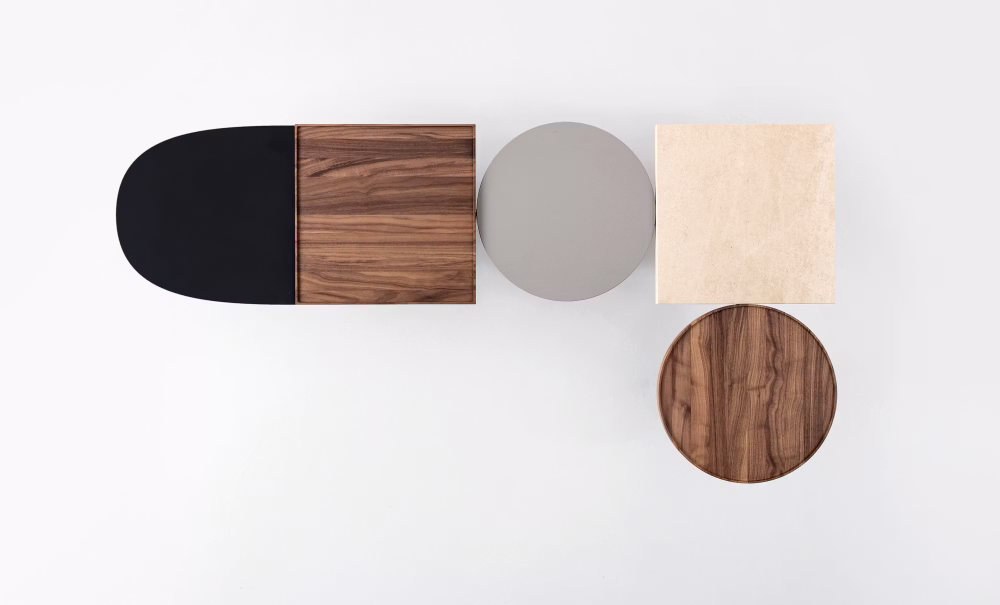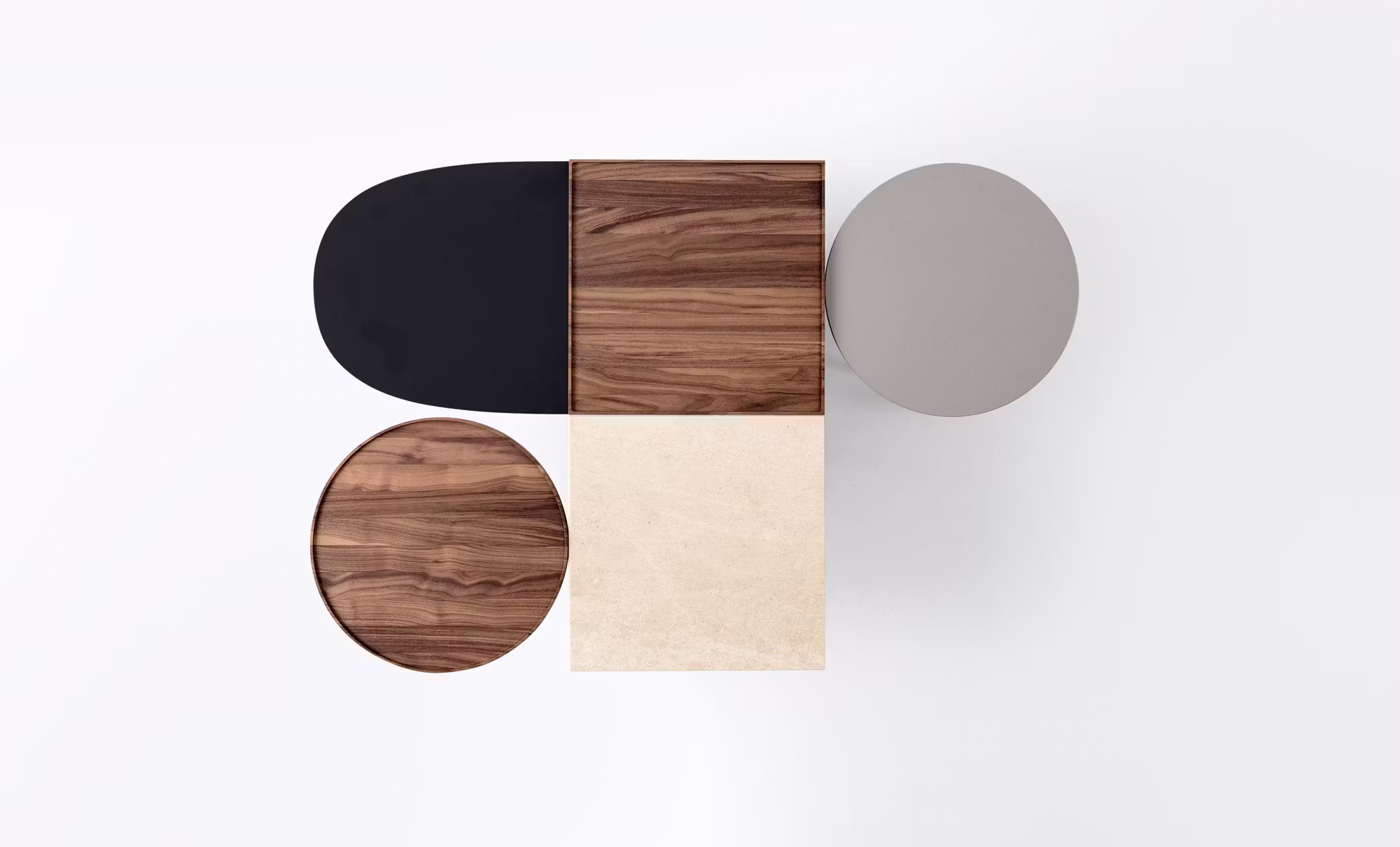 The coffee tables are available in two heights and can combine two, three or four elements, choosing from lacquered tops in five colours or in wood, Fenix-NTM?? or stone.