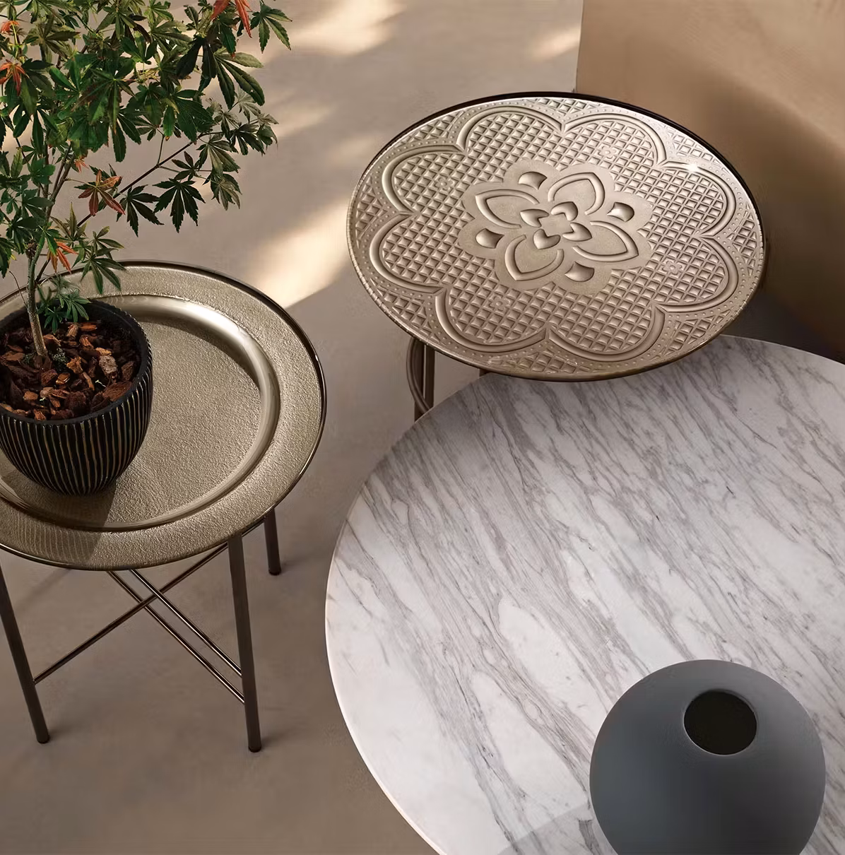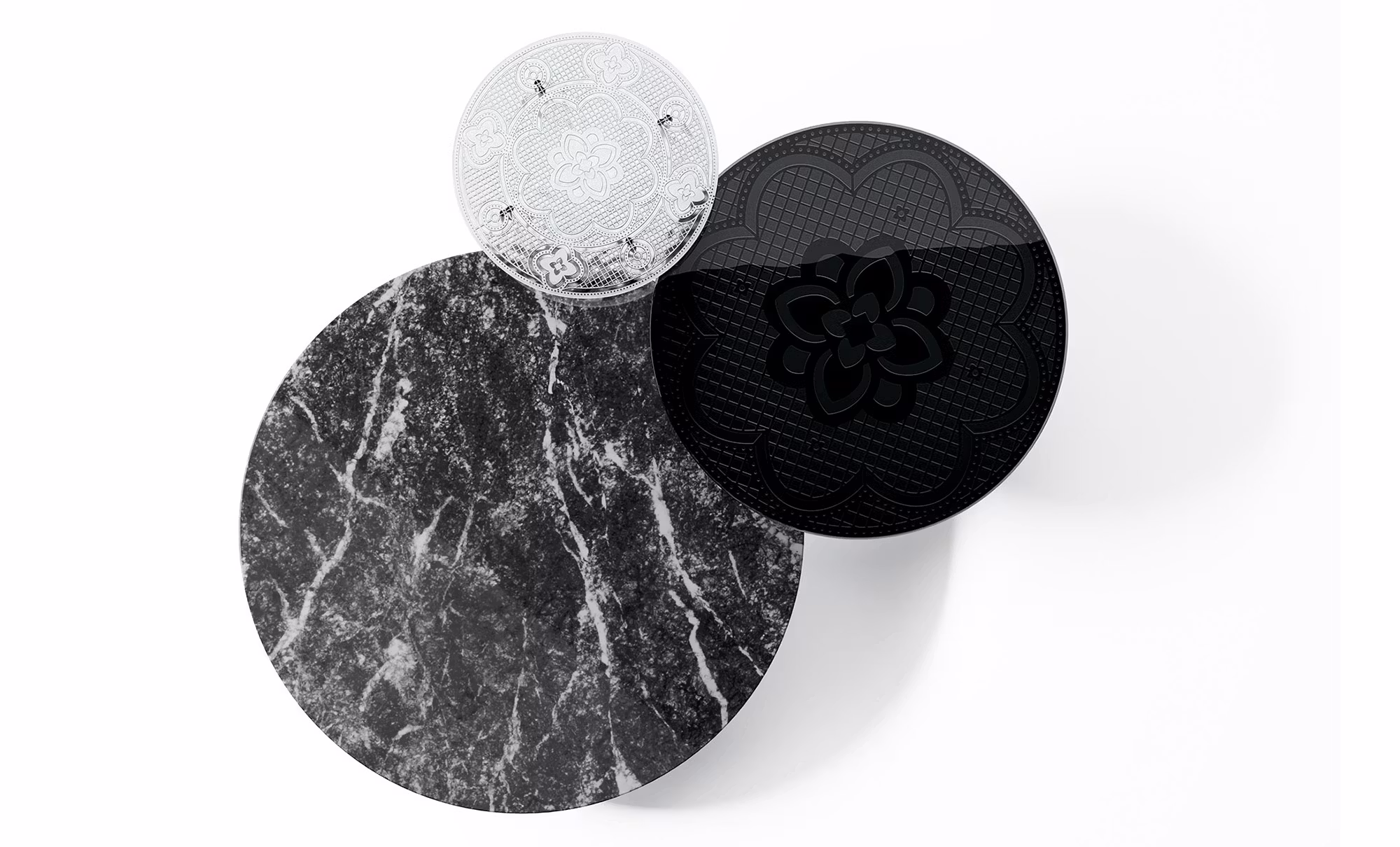 Coffee table with top in 10 mm fused and tempered glass, available transparent or back-painted with metallic paints. Top available also in marble. Metal base available in opaque Titanium or in Black Glossy Nickel finishes.