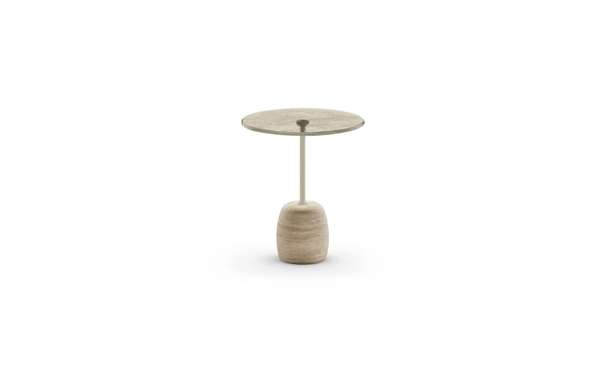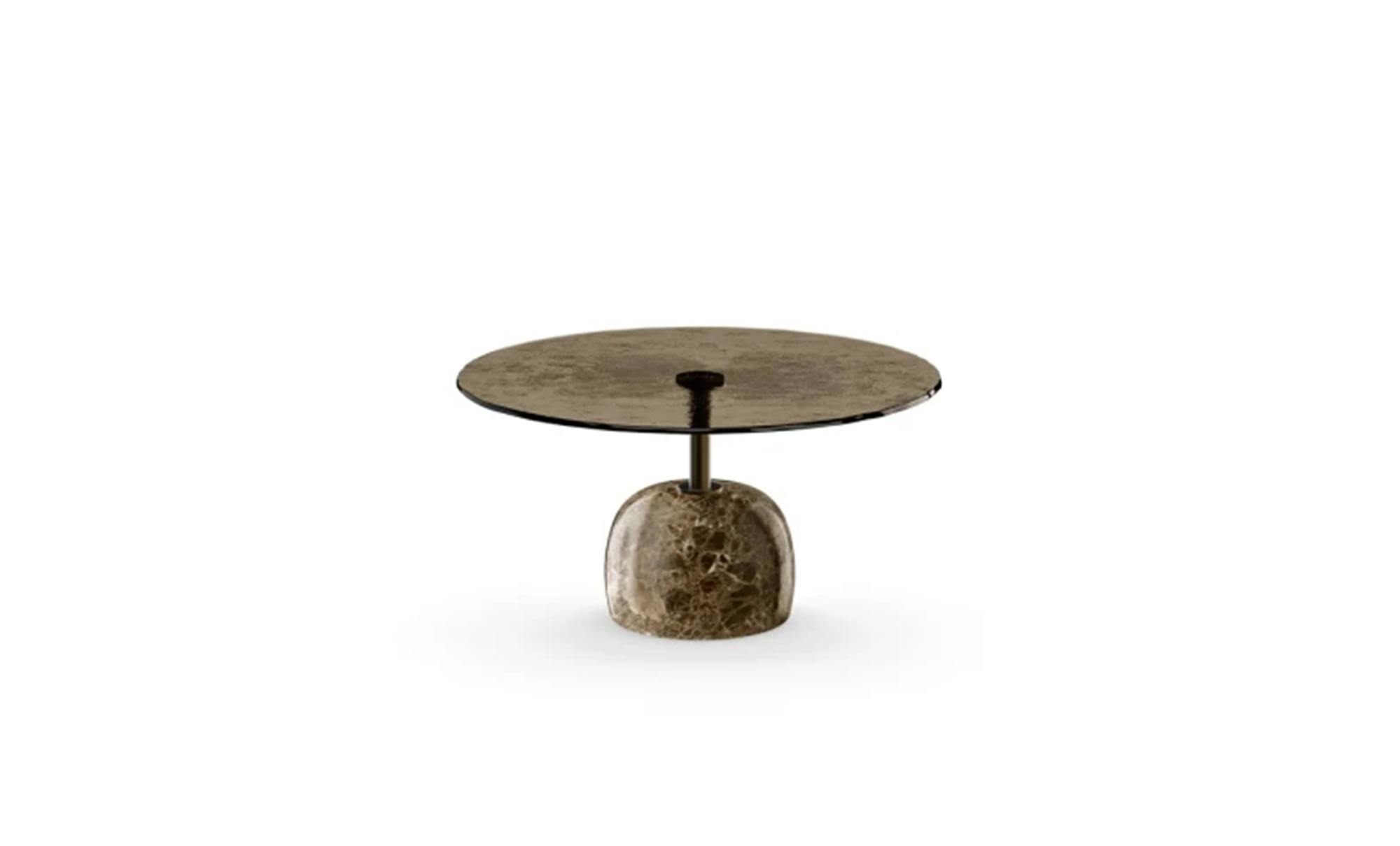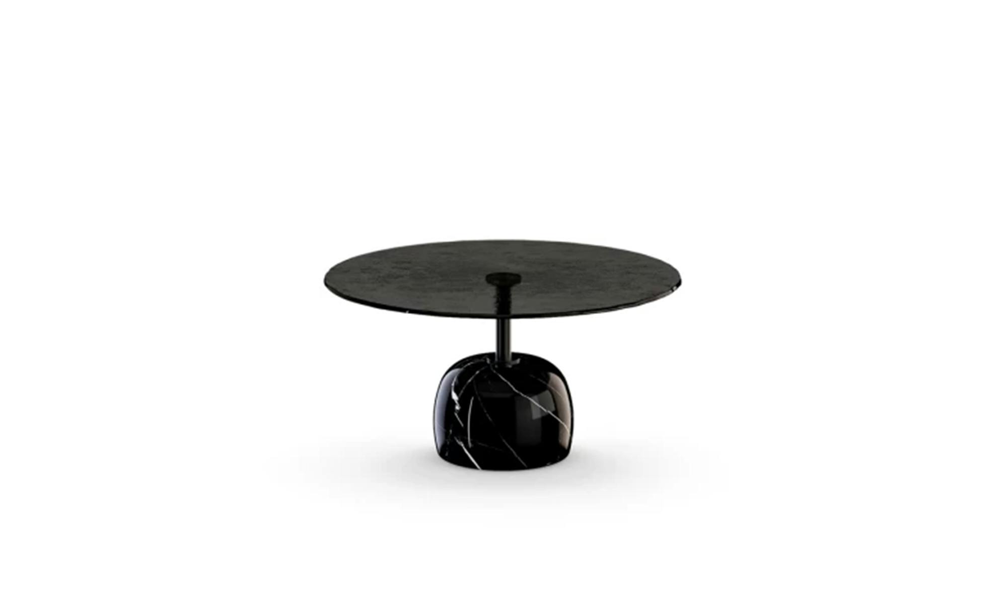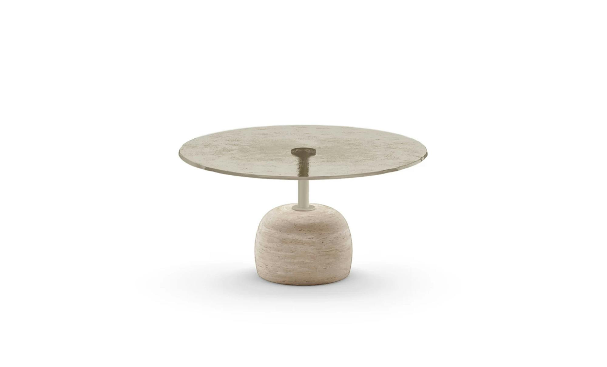 Designed by Nello Palomba, this statement piece features a striking sculptural design. The table is built with a solid marble base and a precious fused glass top.
