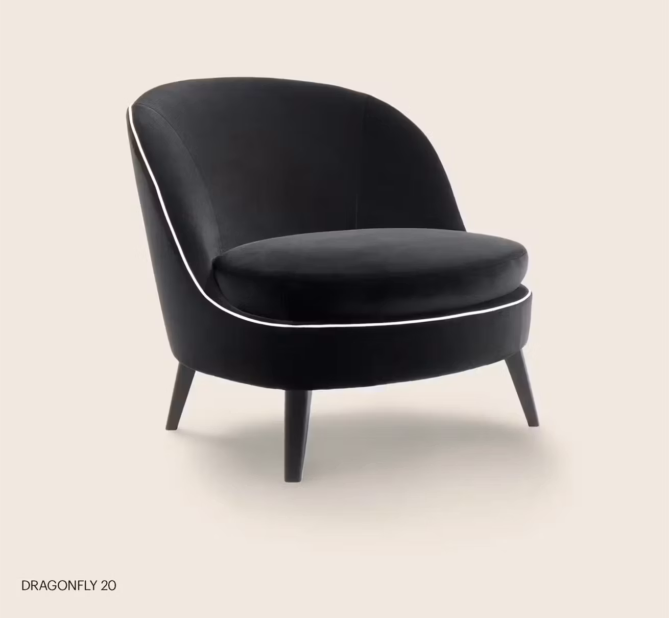 The Dragonfly collection comprises armchairs, sofas and daybeds crafted to furnish both residential and hospitality spaces – like lobbies, lounges, waiting rooms and suites – with charm and elegance. Featuring pared-down proportions and a high seat back, the Dragonfly armchair offers excellent back support. It sits on an elegant solid wood base that can be stained in a range of sophisticated shades. The slender scale and graceful lines that set the Dragonfly armchair apart are emphasized by refined grosgrain piping that lends a finely-finished touch to the upholstery and speaks to the time-tested artisan skill that goes into its making.