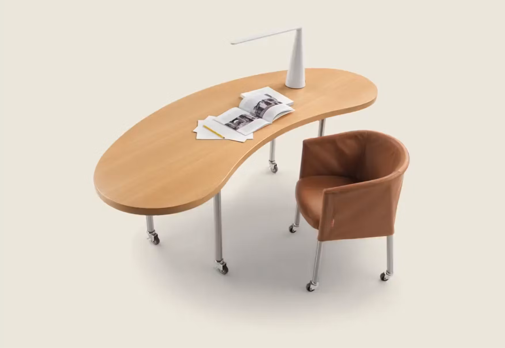 The Mixer small armchair is a product with very down-to-earth design bones and the kind of versatility that can be put to many uses. Thanks to its construction features and compact proportions, the Mixer armchair is the ideal decor solution for the home or for offices and conference rooms. The semi-circular structure is made of metal and integral skin polyurethane foam. The metal legs come in different colours. A version with spinner wheels makes Mixer even more fleet-footed and functional. The slipcover, in either fabric or leather, is easy to remove and comes in both long and short versions.